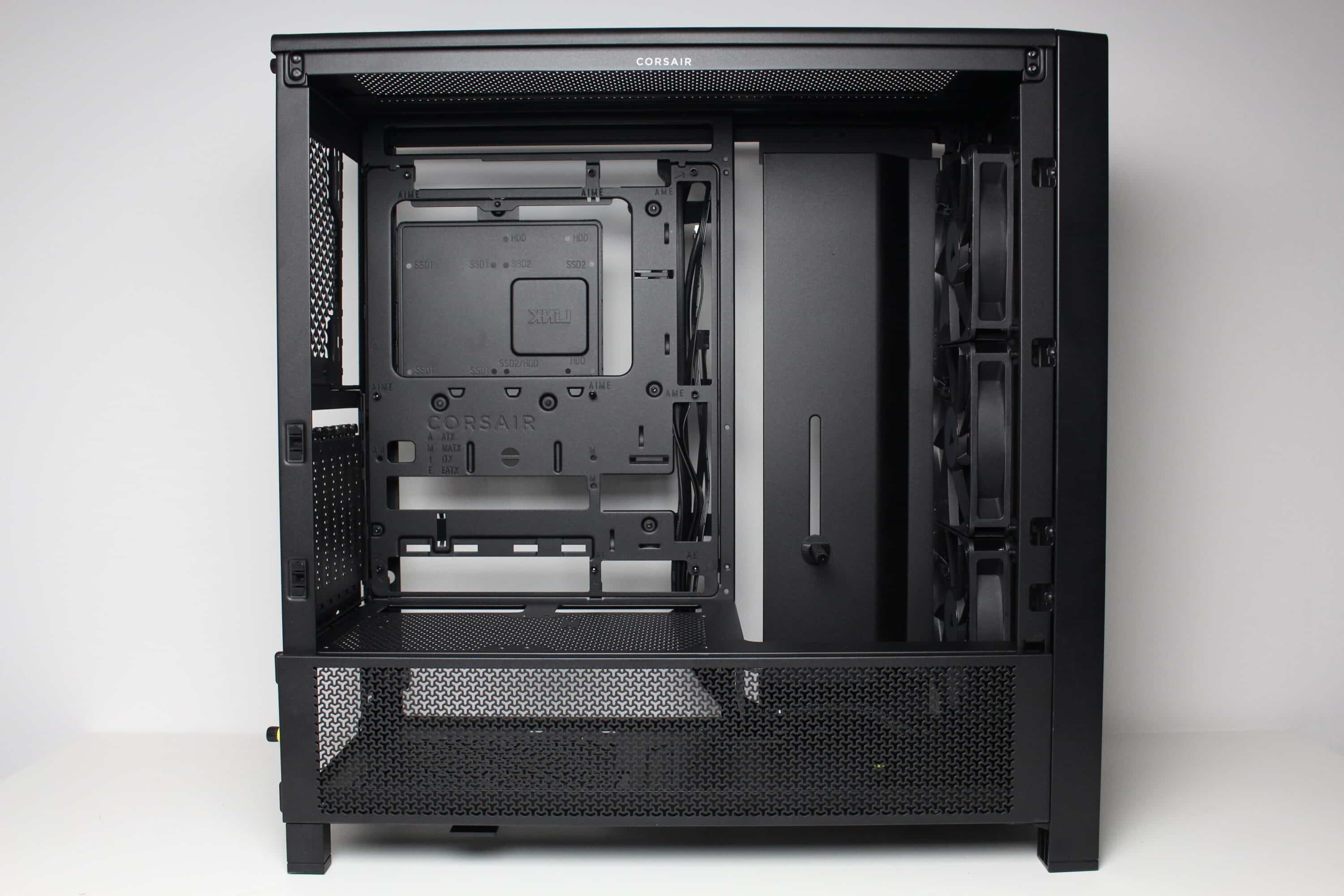 Next, let’s take a look at the interior of the Corsair Frame 4000D RS. This is very open and spacious and is logically divided into two chambers. The larger main chamber in the upper area offers space for an ATX mainboard with connections at the front or rear. There is also sufficient storage space for large CPU coolers, up to two simultaneously mounted radiators and very long graphics cards. There are also various openings in the removable mainboard tray for neat cable routing.