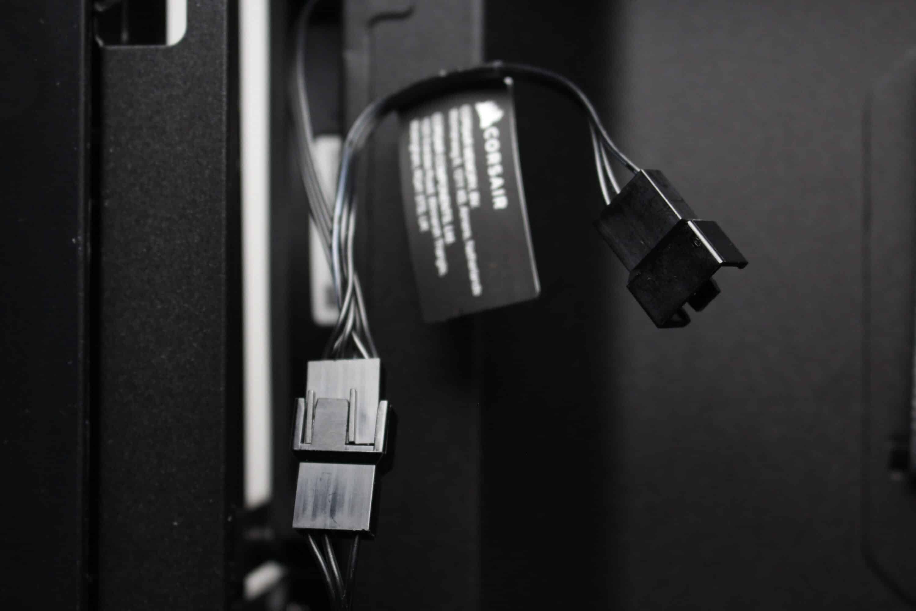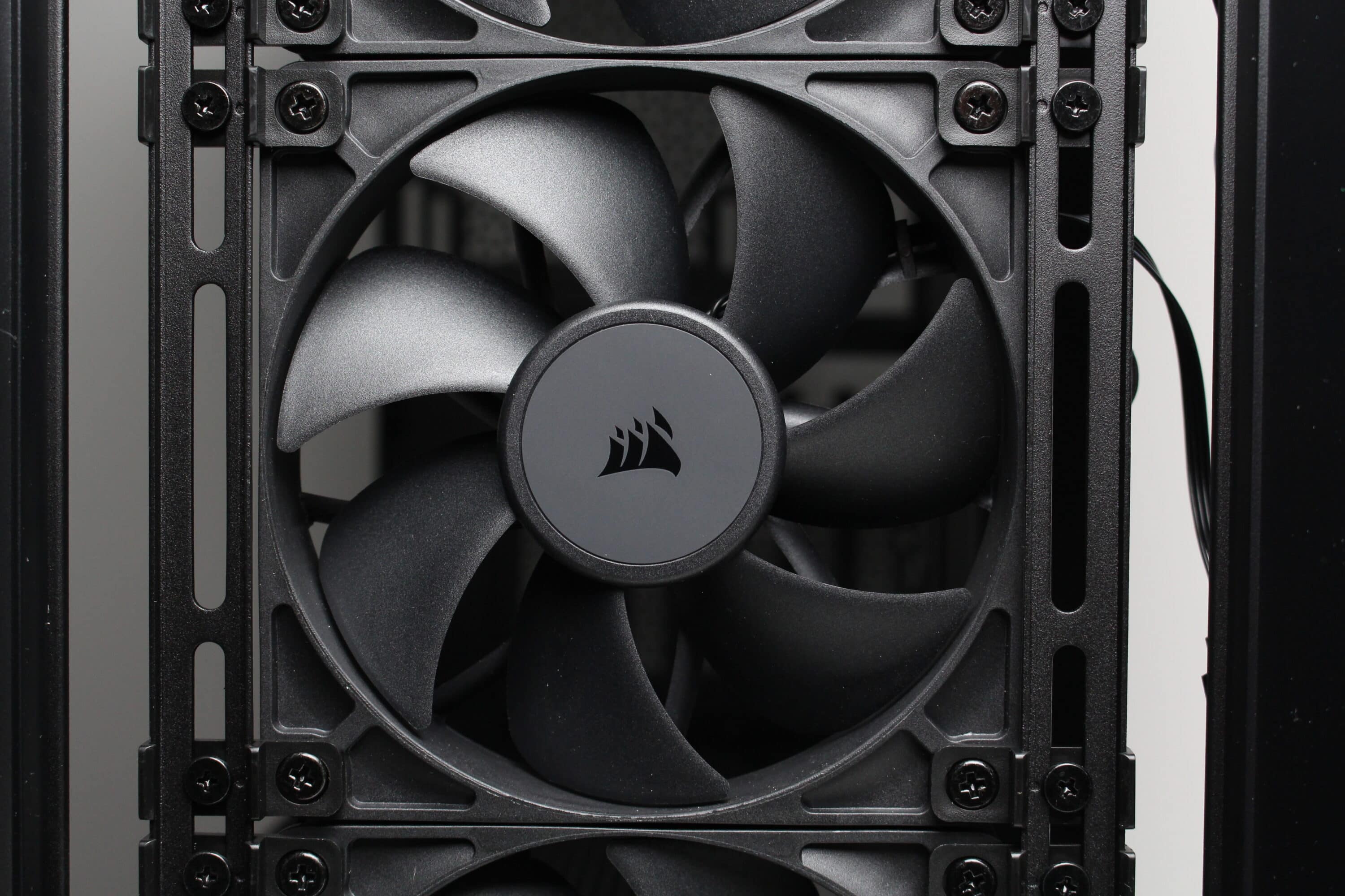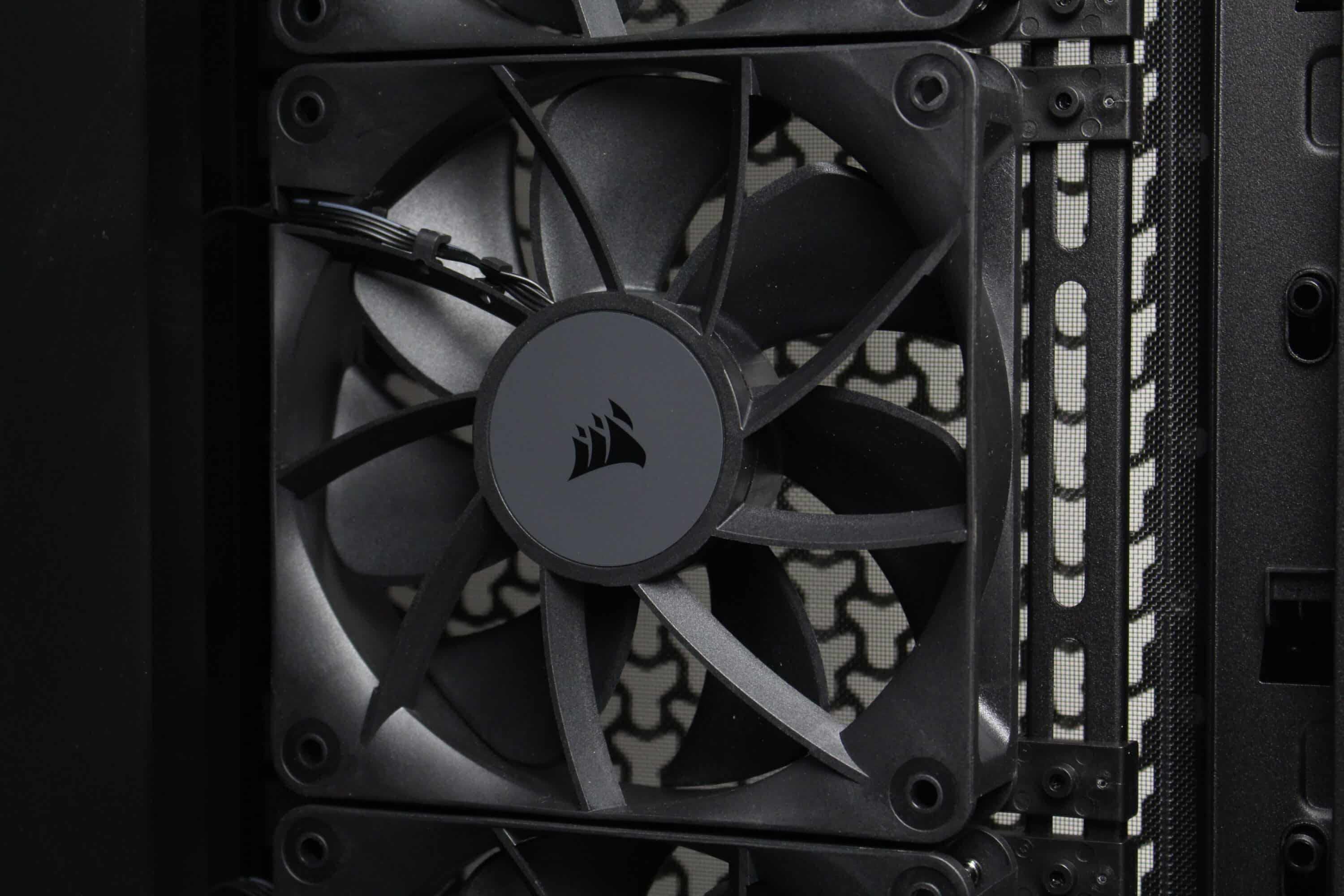 The Corsair Frame 4000D RS comes with three pre-installed fans in the front. These are of the RS120 type and consist of a black frame and a black rotor with seven fan blades. The fans are each connected via a 4-pin PWM connection with daisy-chaining option. A PWM extension is also included in the scope of delivery and the speed range is between 400 and 2100 revolutions per minute. Corsair has not implemented any decoupling mechanisms.