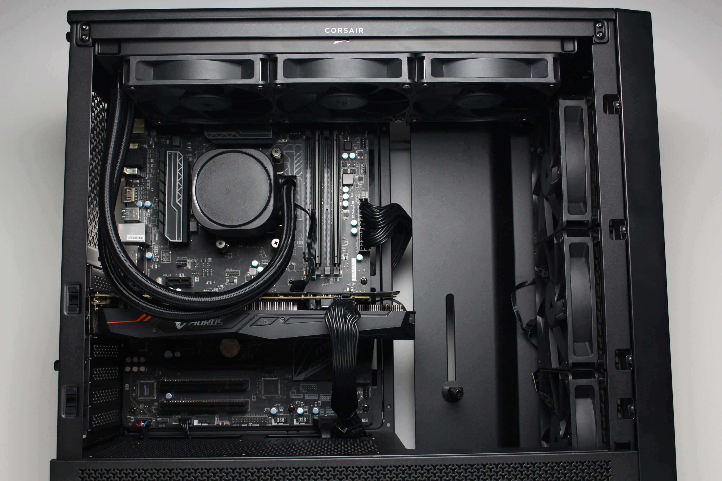 Now we come to the system installation in the Corsair Frame 4000D RS test. As hardware we use an AMD Ryzen 5 1400* on an MSI B350 PC-MATE* with 16GB Crucial Ballistix Sport LT gray DDR4-2666*. The Ryzen is cooled by a Corsair Nautilus 360 RS* and is overclocked to 3.8 GHz (1.175 V). A Gigabyte AORUS GTX 1060 6GB is responsible for the image output. The power supply is provided by the fully modular LC-Power LC550 V2.31 Platinum*.