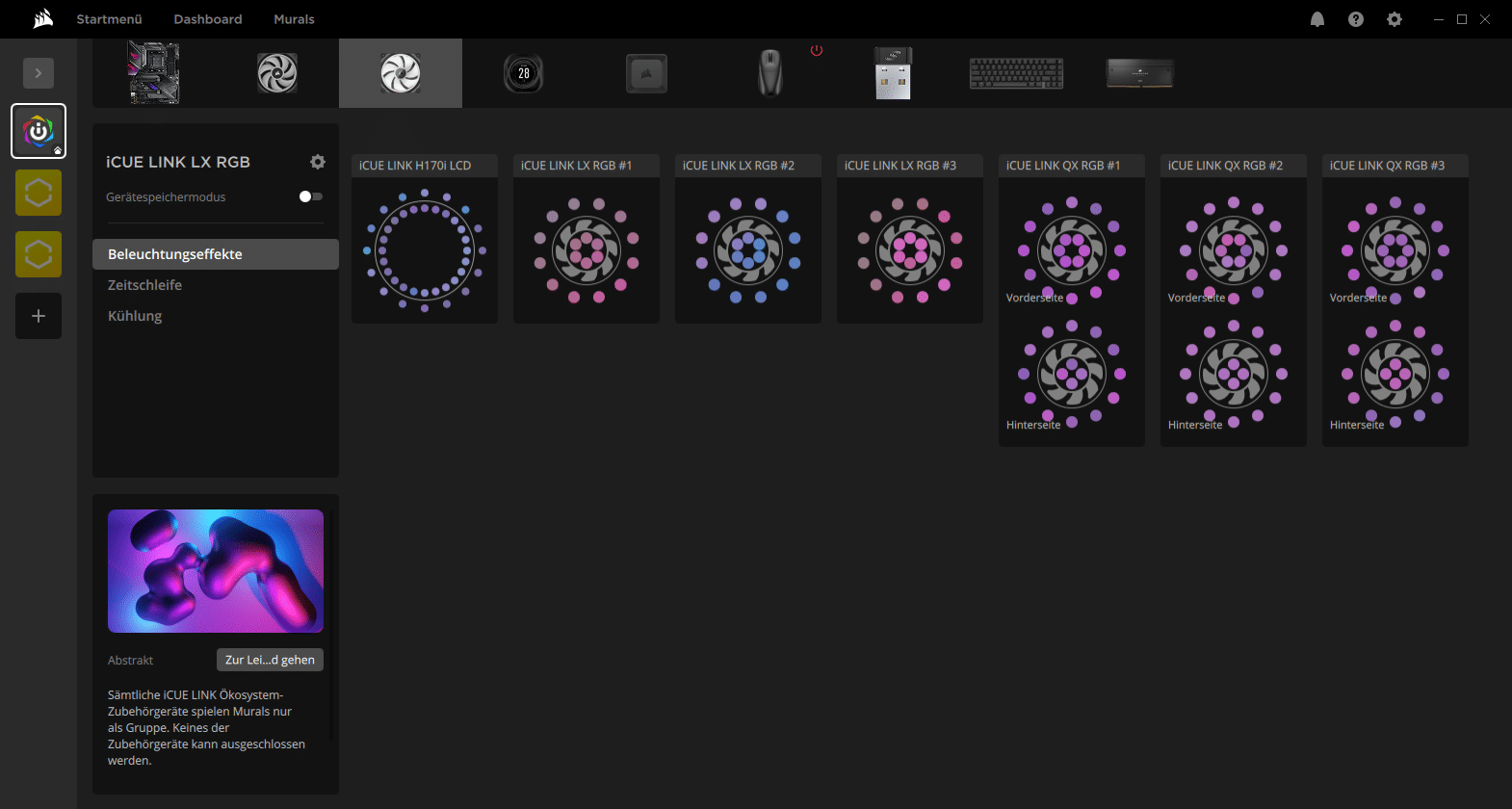 The lighting of the iCUE LINK LX140 RGB can be customized via the sub-item Lighting effects, the RGB LEDs can be controlled individually. There are various effects to choose from, the color, speed and direction of which can be adjusted. The time warp lighting effect known from the QX fans (link to manufacturer) is also supported. The appearance of the fans is very appealing, especially on the front and sides, thanks in part to the two light loops.