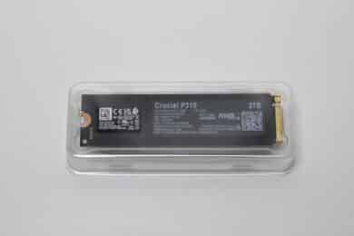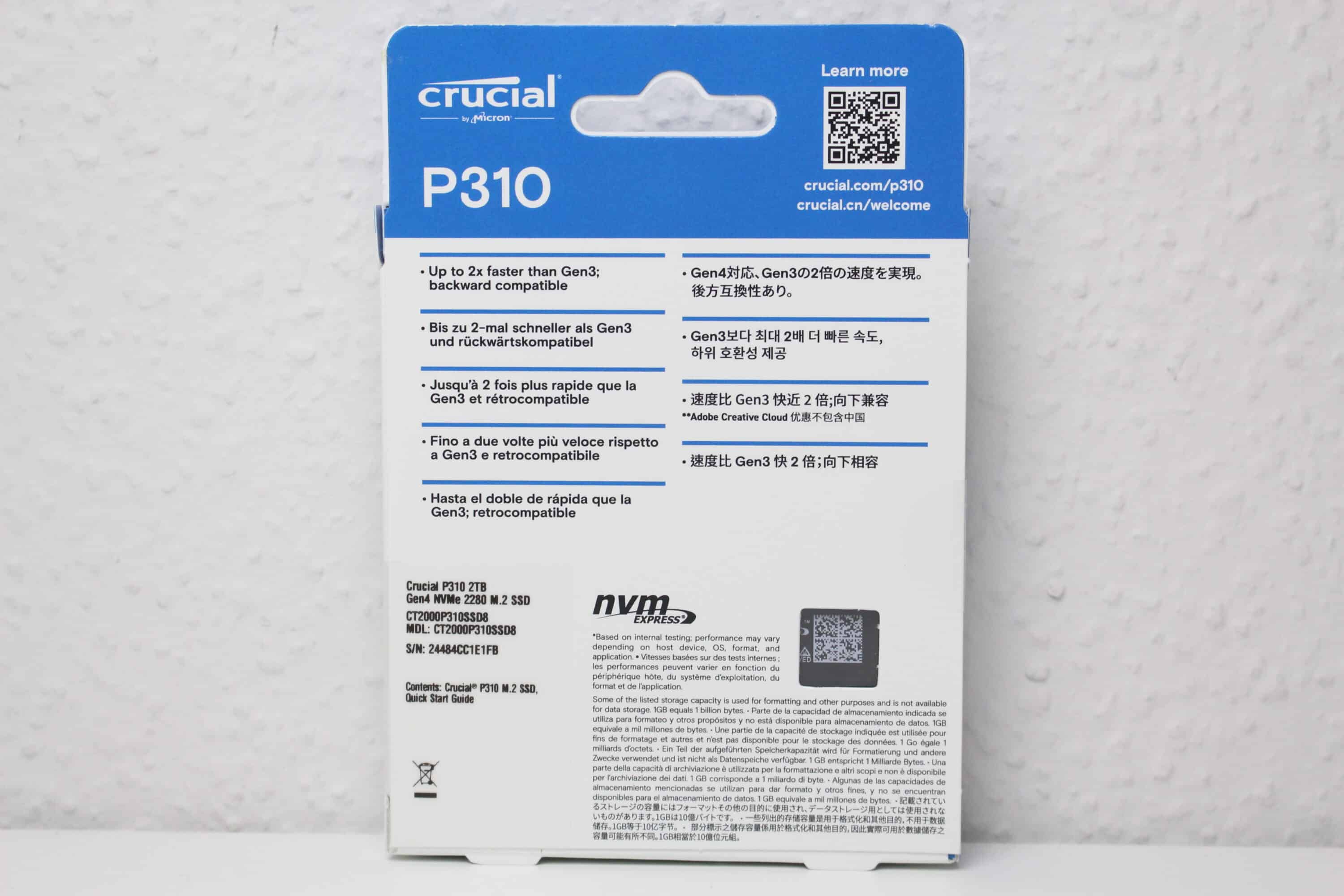 Crucial packs the P310 in a compact cardboard box. The design of the box is very similar to that of the Crucial T705. The color white dominates and blue elements provide certain accents. On the front, we see a picture of the SSD, the manufacturer’s name, the product name and information on capacity, maximum read speed, warranty and the interface used. On the back, there is an advertising text in several languages and a QR code that leads to the manufacturer’s website. Finally, there is a small viewing window through which the SSD can be seen and a small sticker with information on the type, capacity and serial number.