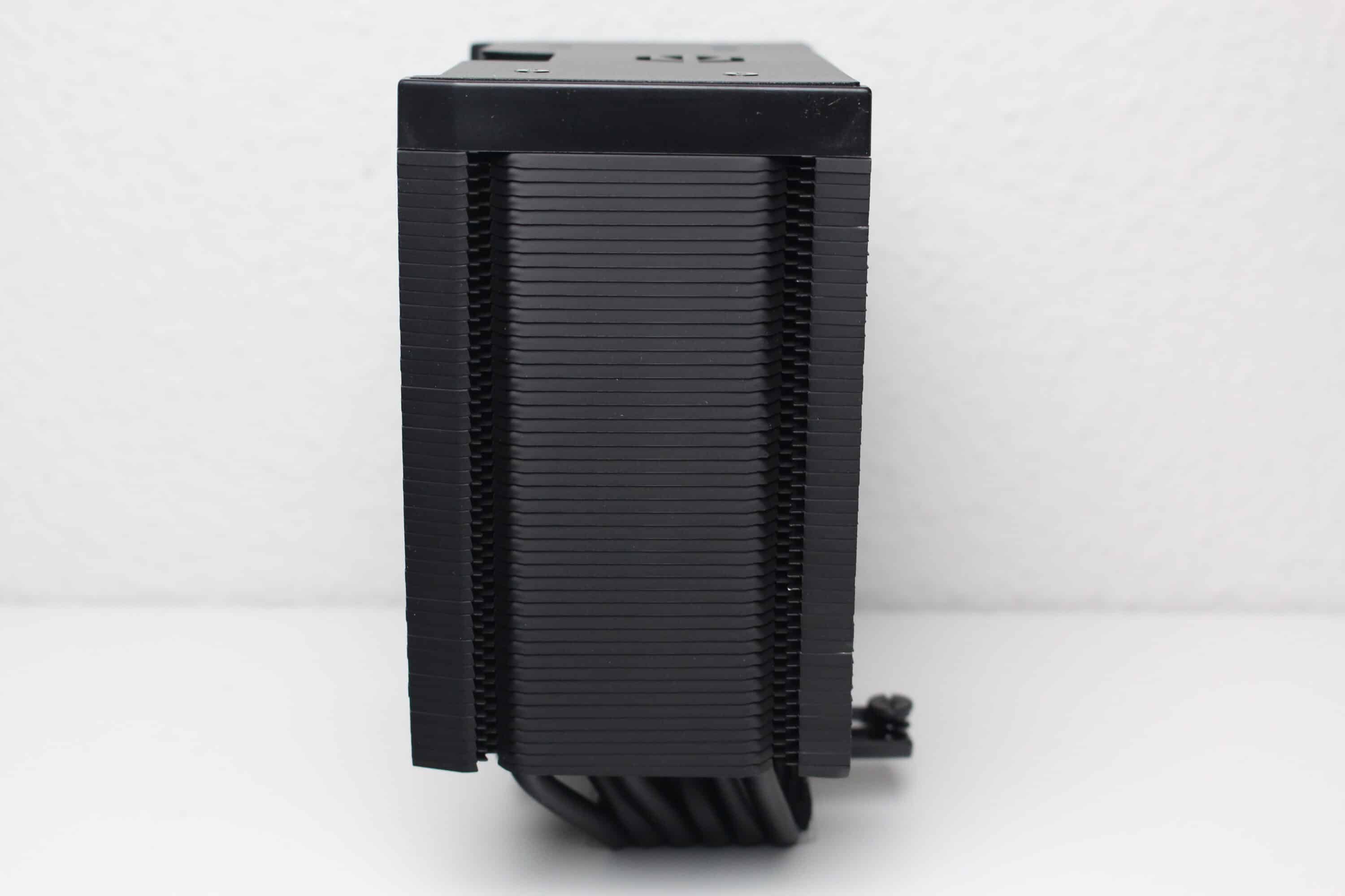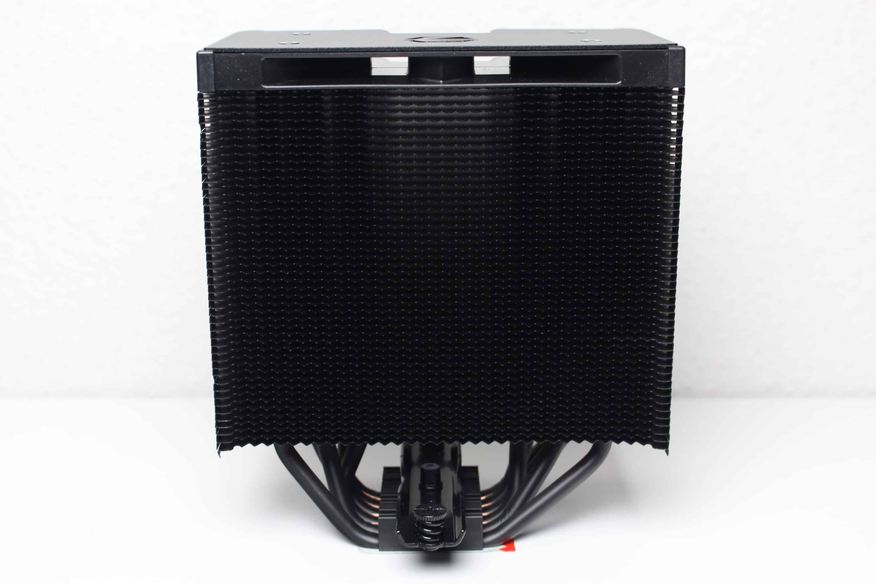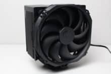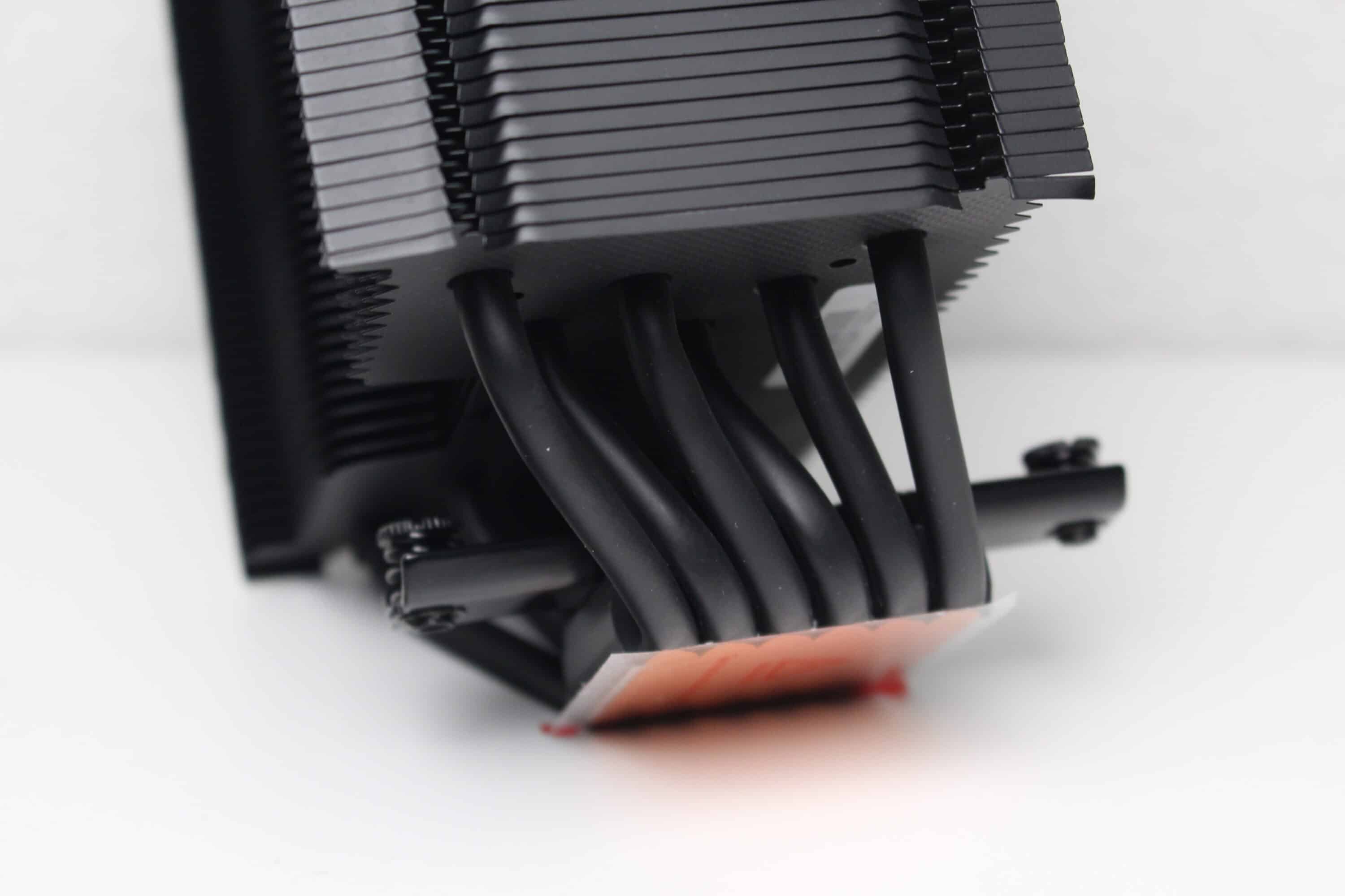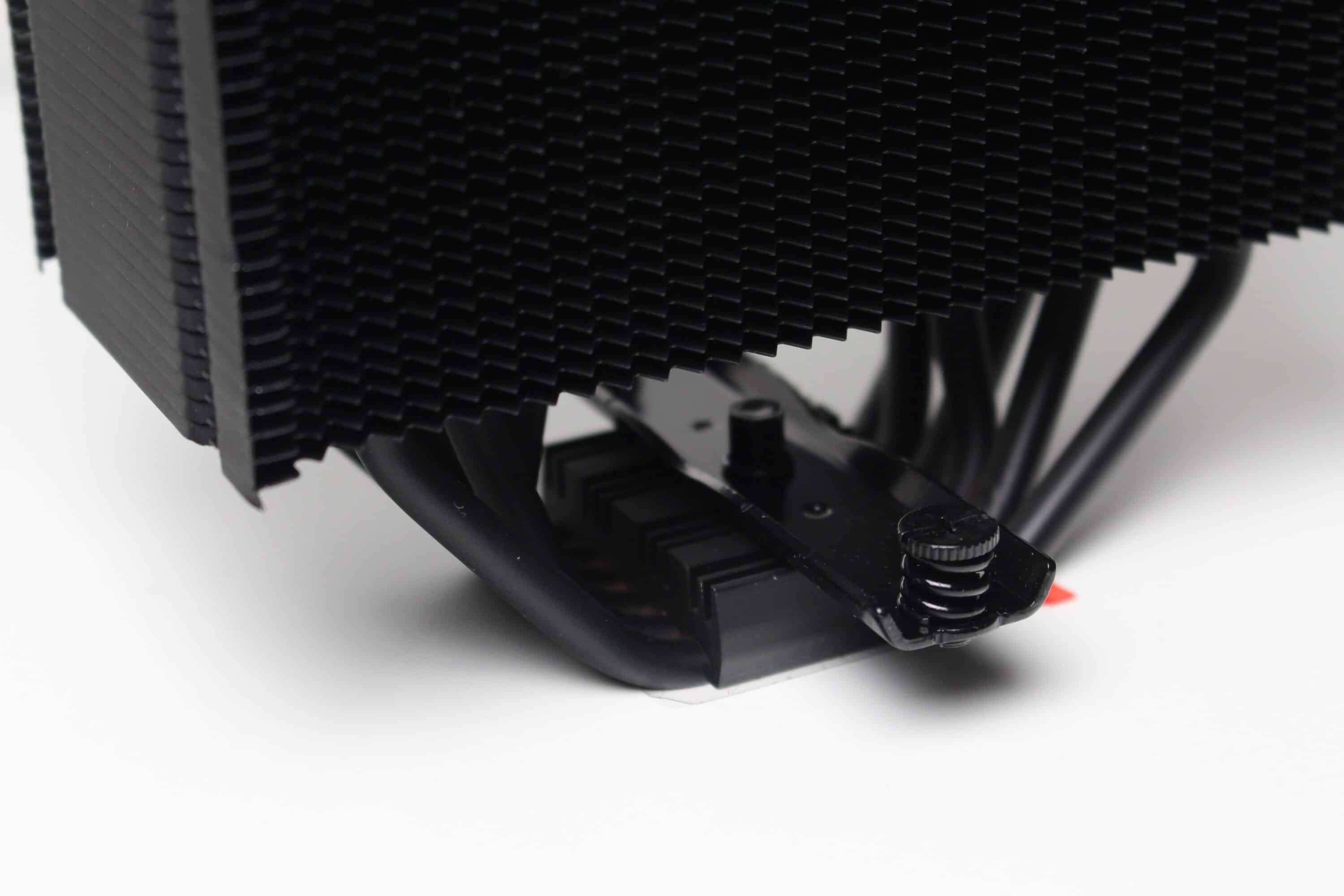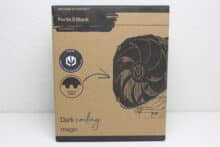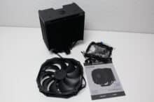 Nothing has changed in the technical design of the Fortis 5 Black compared to the previous Fortis 5. The large and massive heat sink still consists of 47 aluminum fins, but these are now painted black. A black metal plate, in which the manufacturer’s logo has also been stamped, provides a clean finish and covers the heatpipes. Heat is transferred to the fins via six 6 mm copper heatpipes, which have also been painted for a more stylish look and rest directly on the heatspreader of the CPU (Heatpipe Direct Touch).
