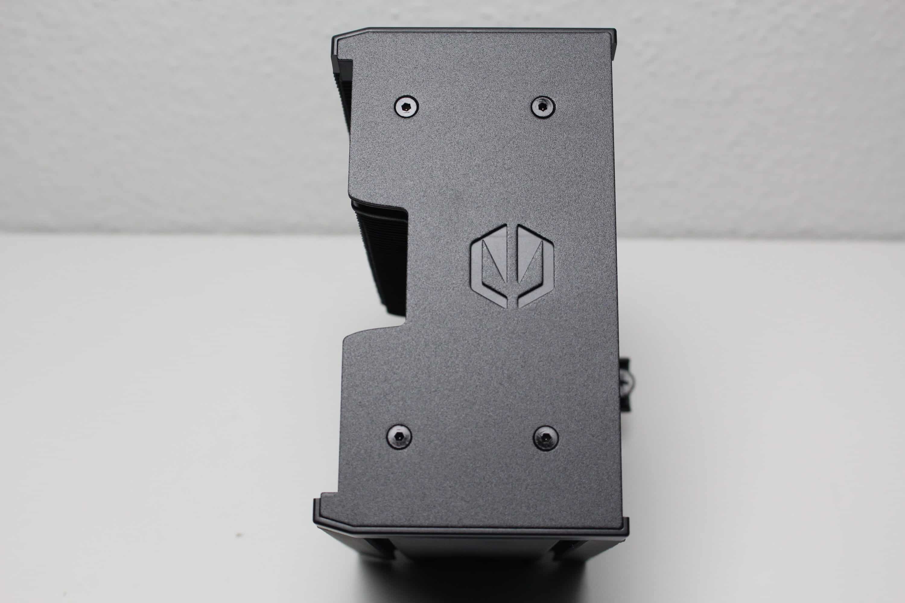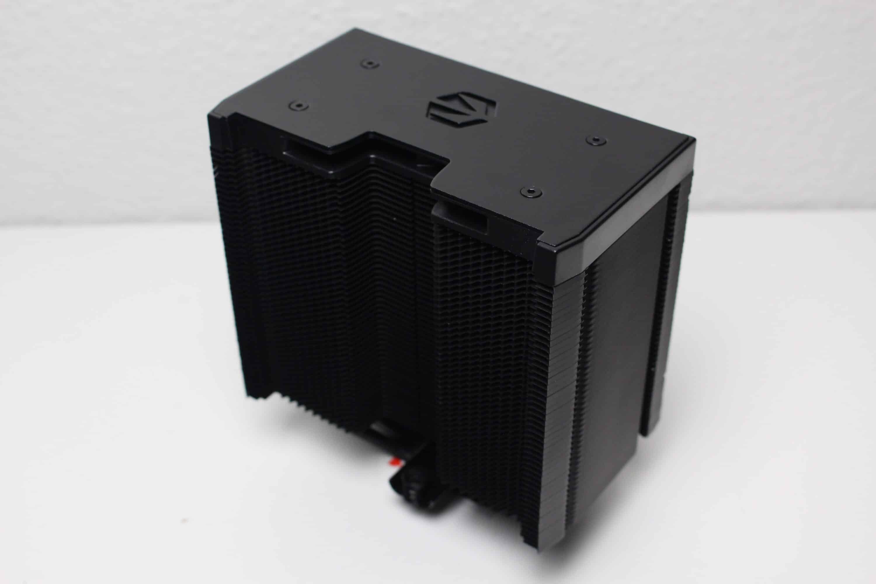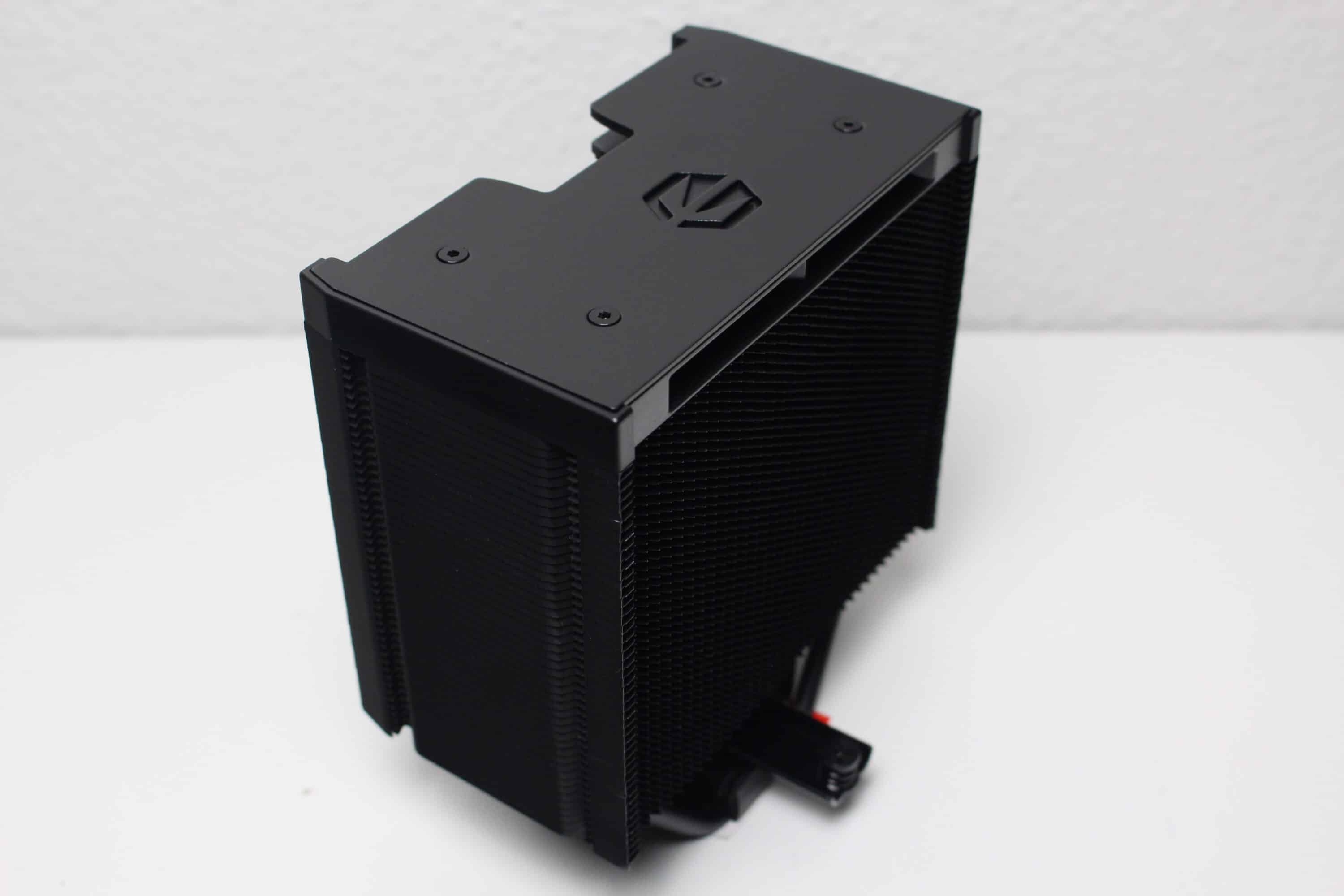 The heatsink and fan together weigh 835 grams. This makes it not only relatively large but also heavy. The general workmanship of the ENDORFY Fortis 5 Black is good but not flawless. For example, the paintwork on the lid plate and some of the aluminum slats was not perfect. Unlike the Fera 5 Black, however, the base of the plinth was flawlessly finished this time.