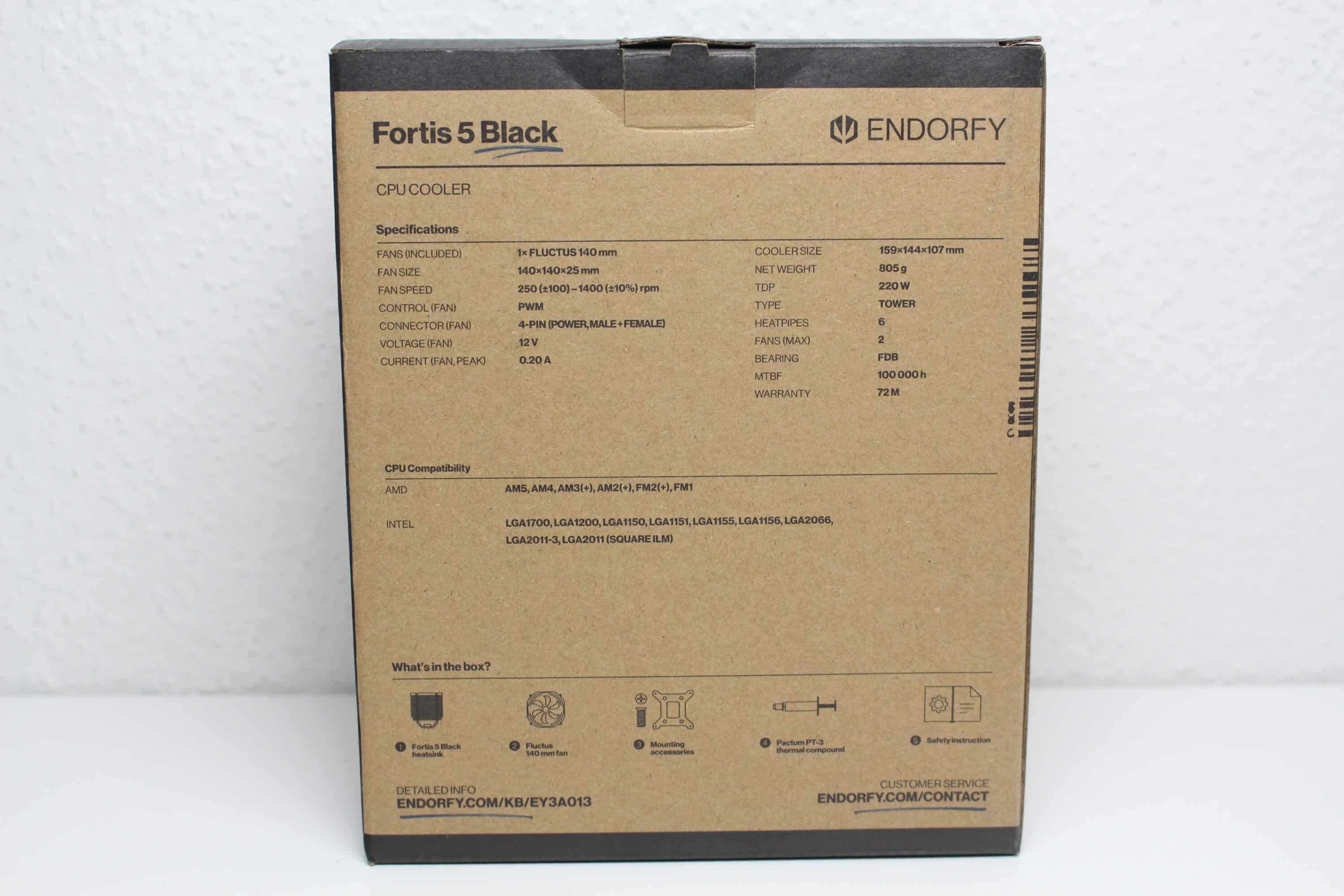 ENDORFY packs the Fortis 5 Black in a typically designed and compact cardboard box. This is made of brown cardboard and is printed almost exclusively in black ink. However, the manufacturer has designed a few elements in a dark blue-grey. In addition to a schematic drawing of the CPU cooler, the box also contains a table with the technical data and a list of the most important features.