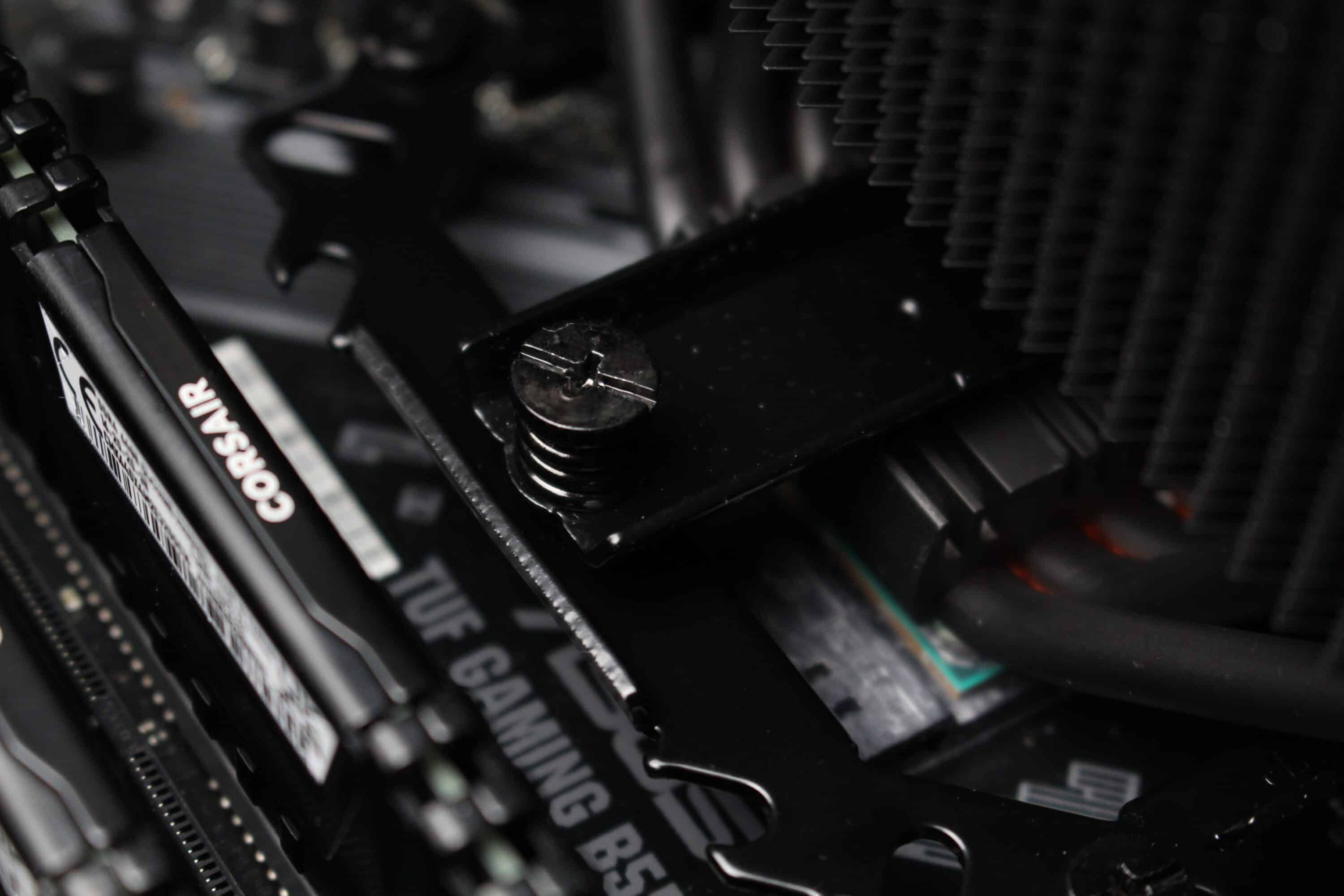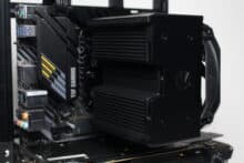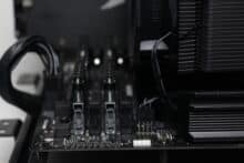 Mounting the Fortis 5 Black on AMD systems is straightforward. After removing the retaining brackets on the front, the backplate of the AMD retention module could be prepared. To do this, a total of four spacers had to be screwed into the backplate on the front. The black metal retaining bracket was then placed on these spacers and secured with four screws. After applying the heat-conducting paste, the heat sink is placed on the CPU and screwed to the retaining frame on the mainboard using the retaining bracket and two spring-loaded screws.