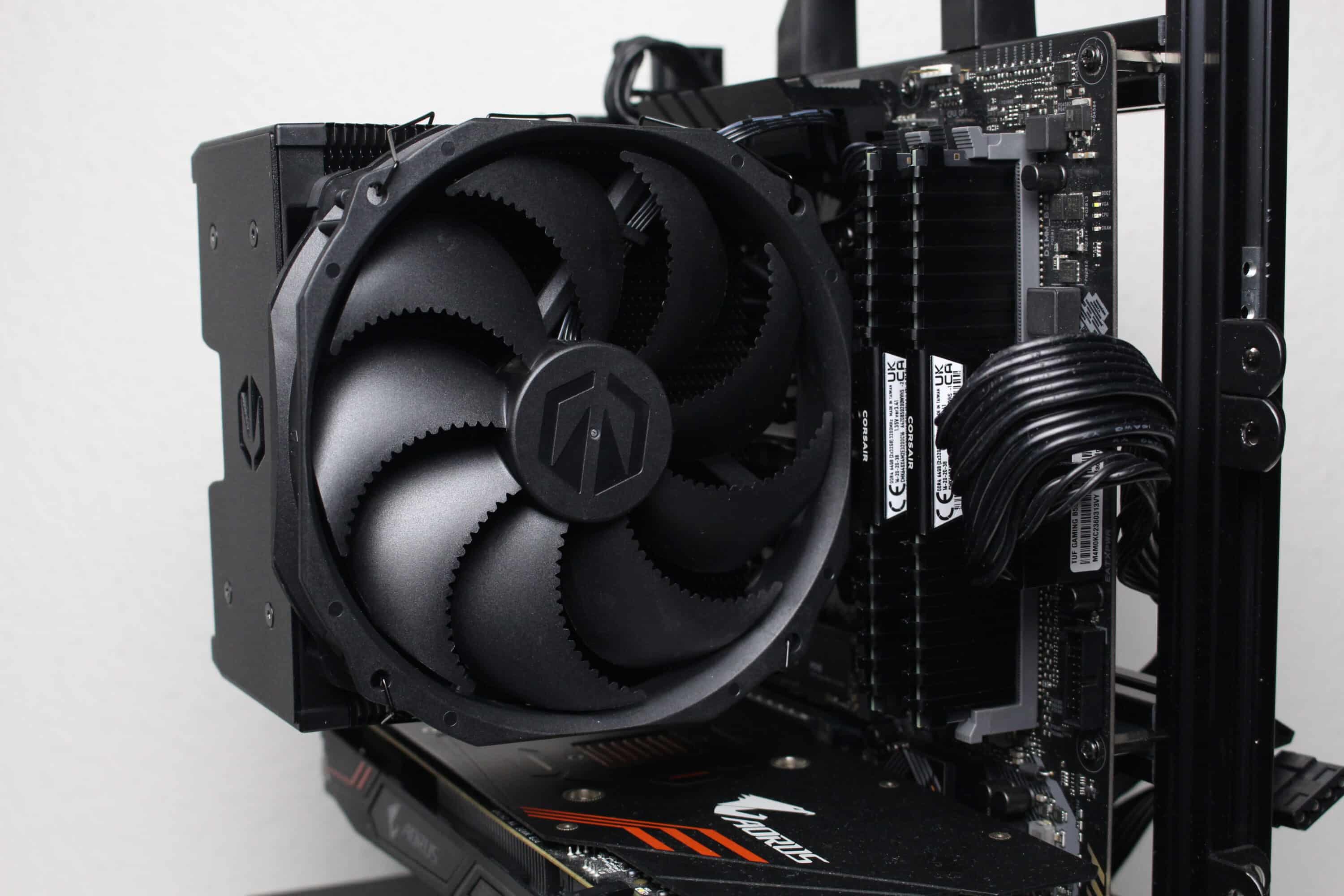 The mounting system already worked very well on the Fortis 5. That’s why ENDORFY certainly thought “never change a running system” and only changed the color of the mounting frame. It has now also been painted black to match the product name. The mounting system is well thought out and allows the CPU cooler to be installed quickly and without frustration. The instructions are compact but clearly structured. Thanks to its asymmetrical design, the Fortis 5 Black is constructed in such a way that even with two fans fitted, there should be no problems with VRM coolers or high RAM heatspreaders.