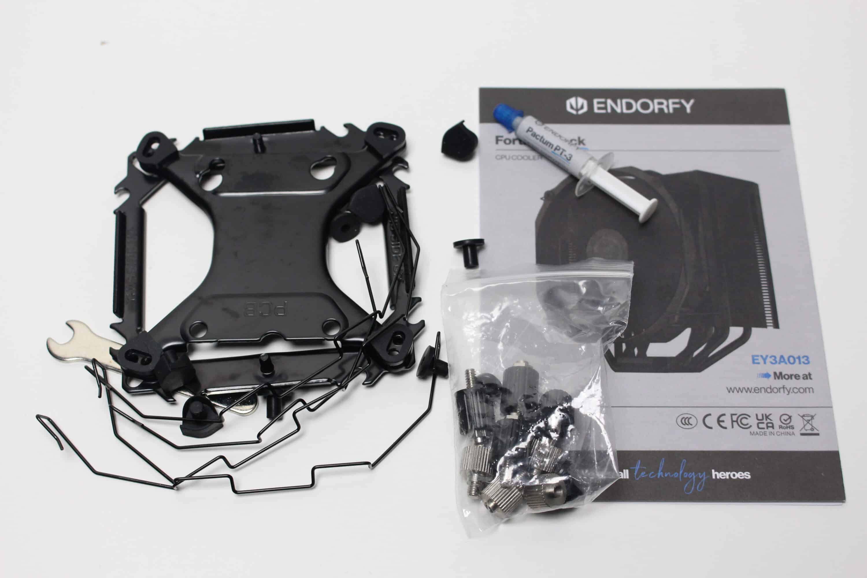 Inside the box, ENDORFY has dispensed with unnecessary packaging material. The heatsink is protected by two additional cardboard boxes, in which the mounting material and the Fluctus 140 OS PWM fan are placed. Finally, a foam mold can be seen at the bottom to protect the base and the heatpipes. The supplied accessories include all the necessary screws, spacers, a mounting frame and a metal backplate, a small tube of thermal paste and four black fan clips.