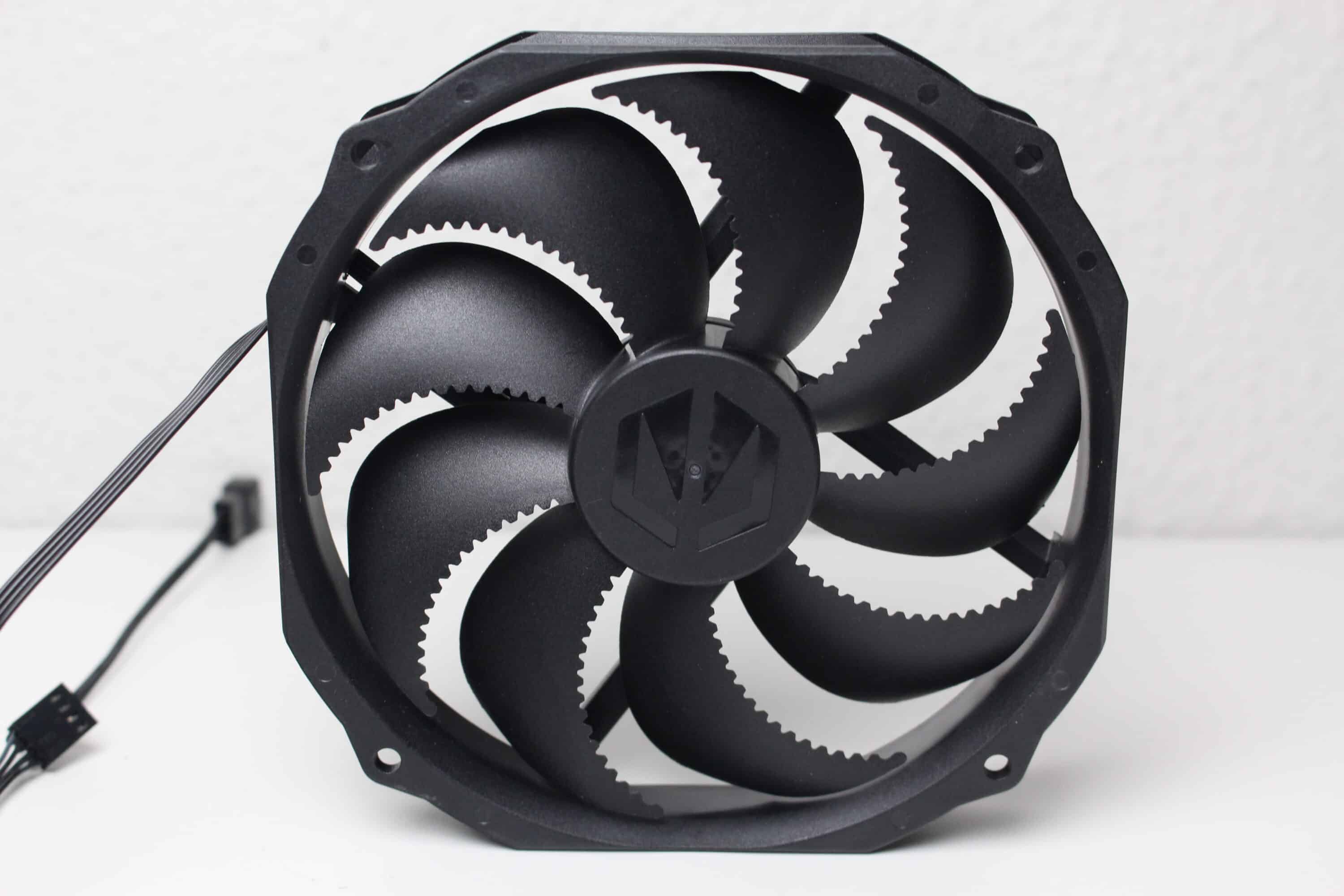 The built-in fan is of the Fluctus 140 OS PWM type, which means it has a frame width of 140 millimeters and nine serrated fan blades. Together with the FDB bearing, this blade design should ensure pleasantly quiet running. The fan blades and the frame are completely black and modular vibration dampers can be seen at the corners. Power is supplied via a 4-pin PWM connector, which also has a built-in Y-switch.