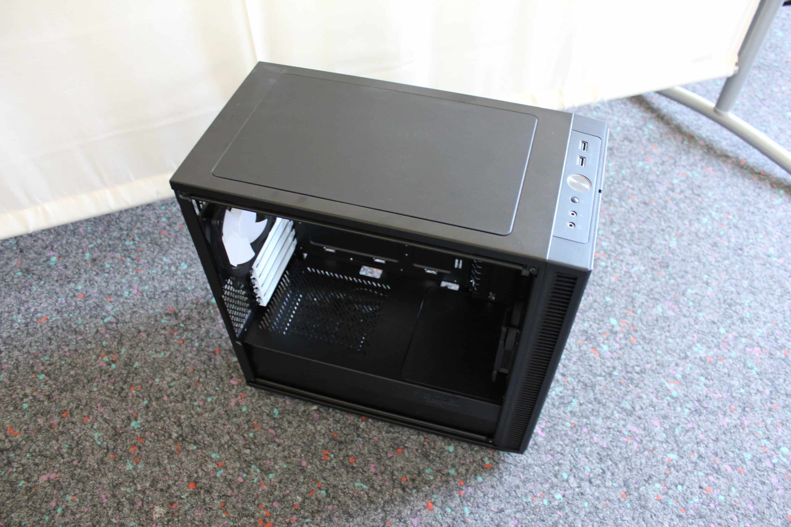 The memory components can be installed behind the mainboard tray in order to have a lot of space in the main part of the case. In the Fractal Design Define Mini C you have enough space for two 3.5 inch and three 2.5 inch hard drives. More than enough for gamers.