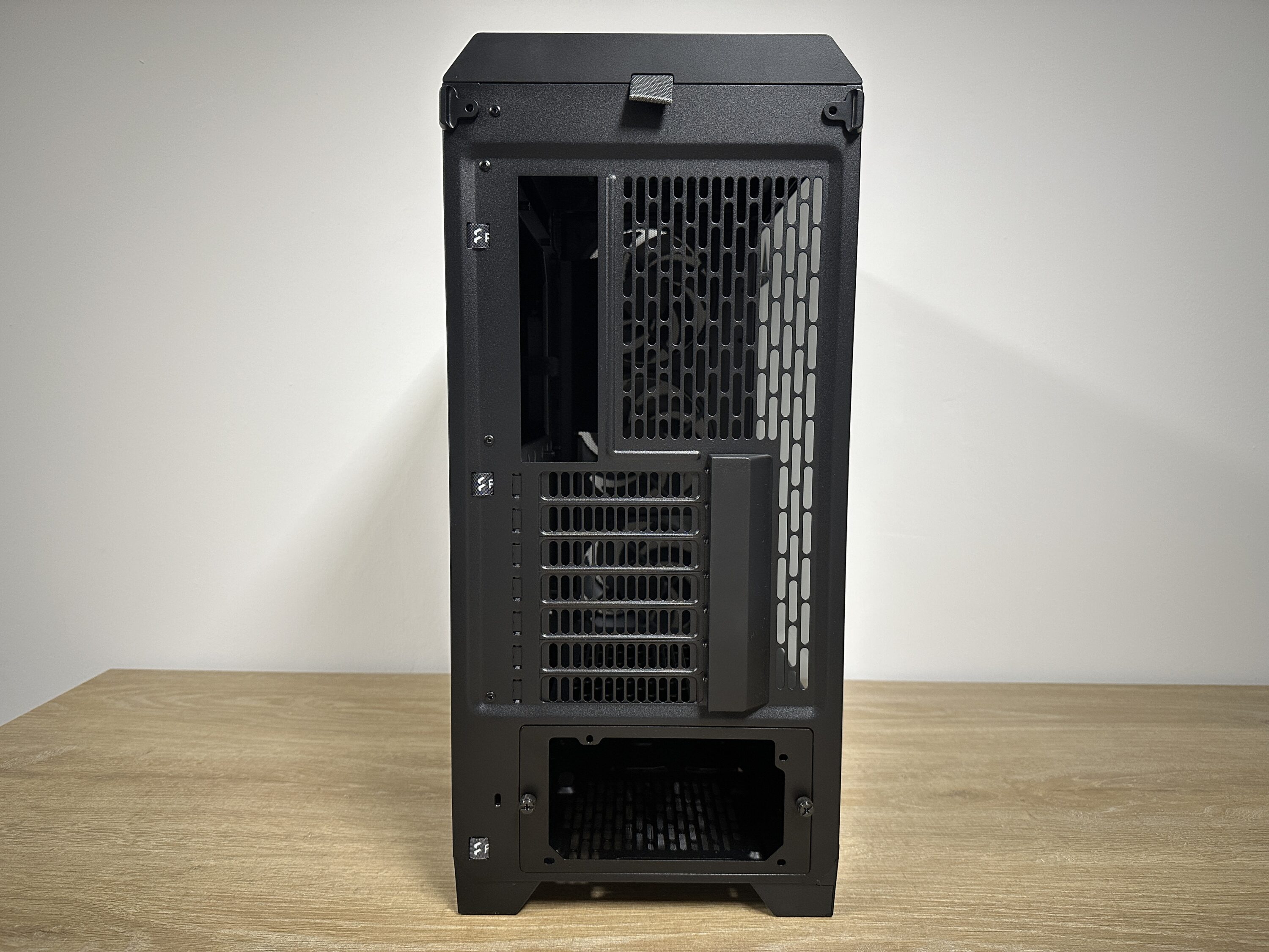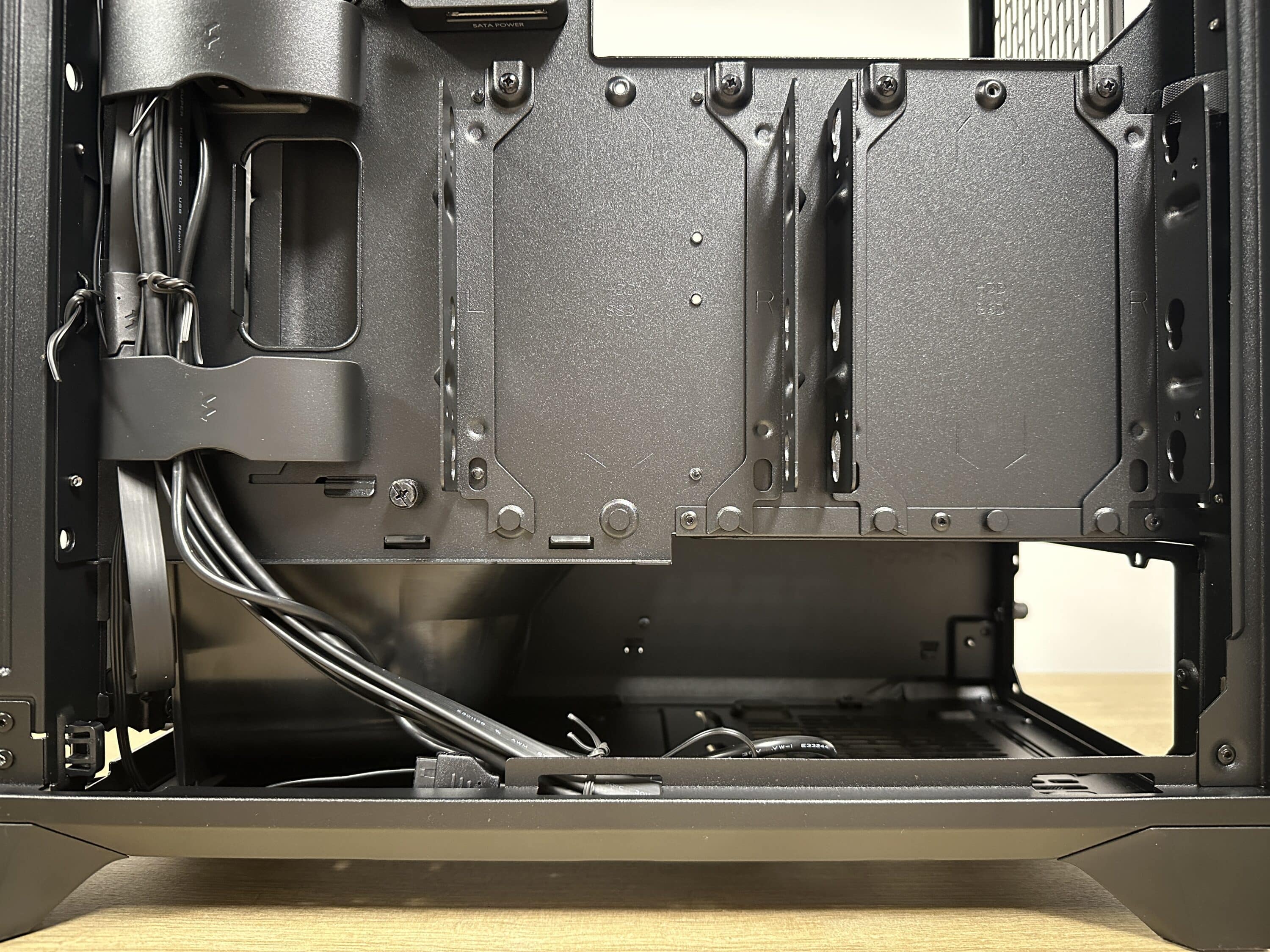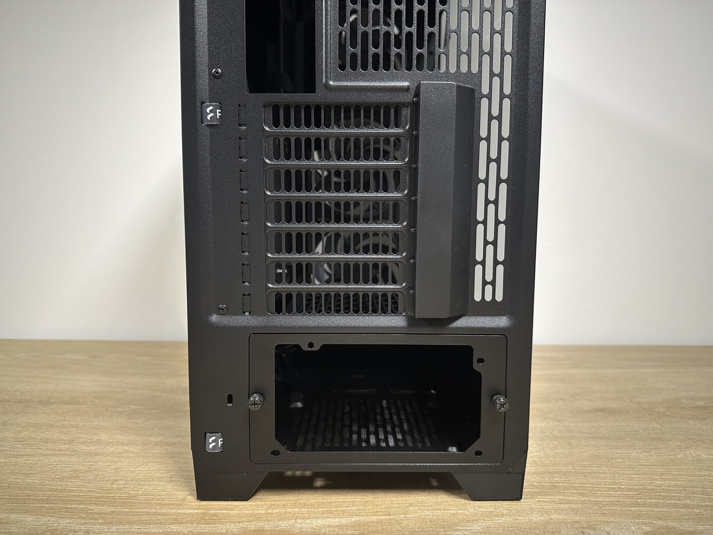 The PCI slots in the middle segment are concealed behind a removable panel, which ensures a tidy, clean look. The power supply slot is located in the lower area, equipped with a stable mounting frame for easy installation.
