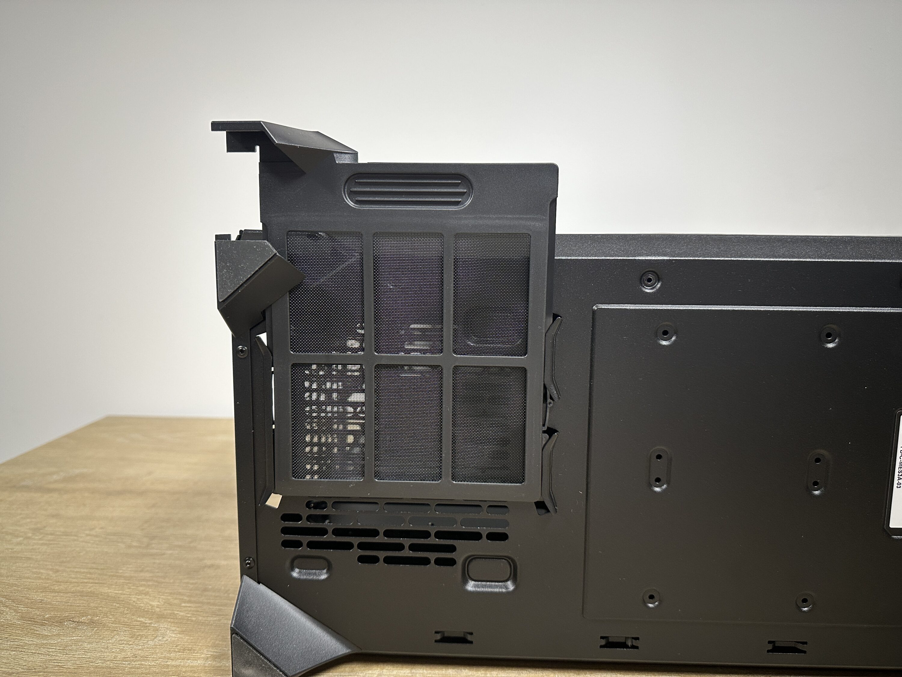 At the top, a largely perforated cover dominates the impression – functional and striking in design. It can be easily removed using the aforementioned fabric flap and then reveals a removable mounting frame for radiators or fans – ideal for custom setups.