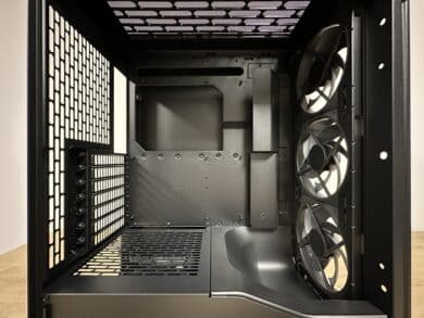 Despite the overall slim design, there is space inside for motherboards up to the E-ATX form factor (max. 277 mm wide) and graphics cards up to 349 mm long – enough even for modern top-of-the-range GPUs. The available space is optimally structured to accommodate both gaming and creator systems without causing space problems during installation.