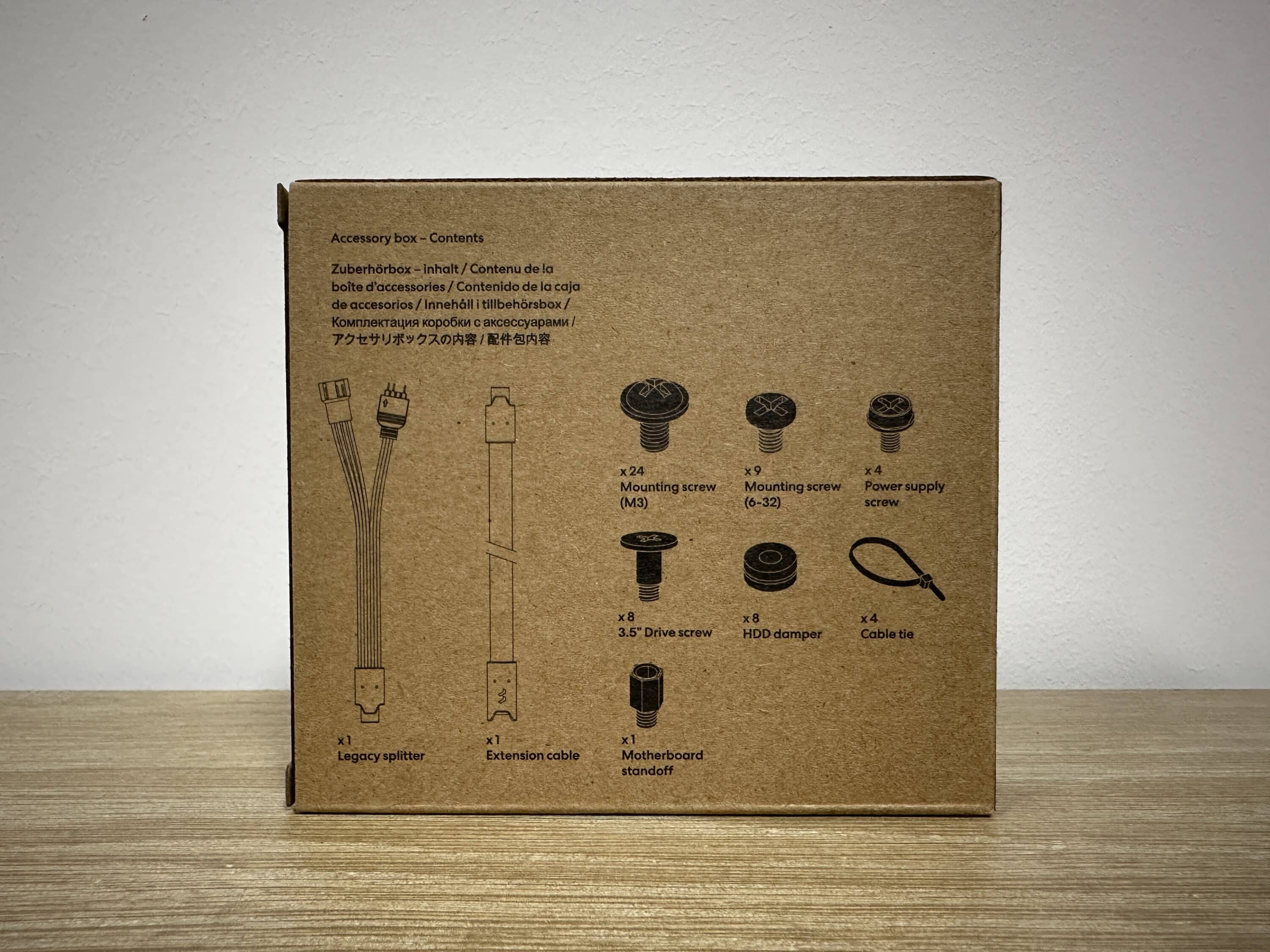 In addition to the case itself, the package contains a useful selection of accessories: These include all screws for mounting the mainboard, power supply unit, fans and drives, suitable hard disk fasteners and several cable ties for neat cable management. The screws are packed in separate bags and clearly labeled on the outside of the packaging – this saves time and nerves during assembly.