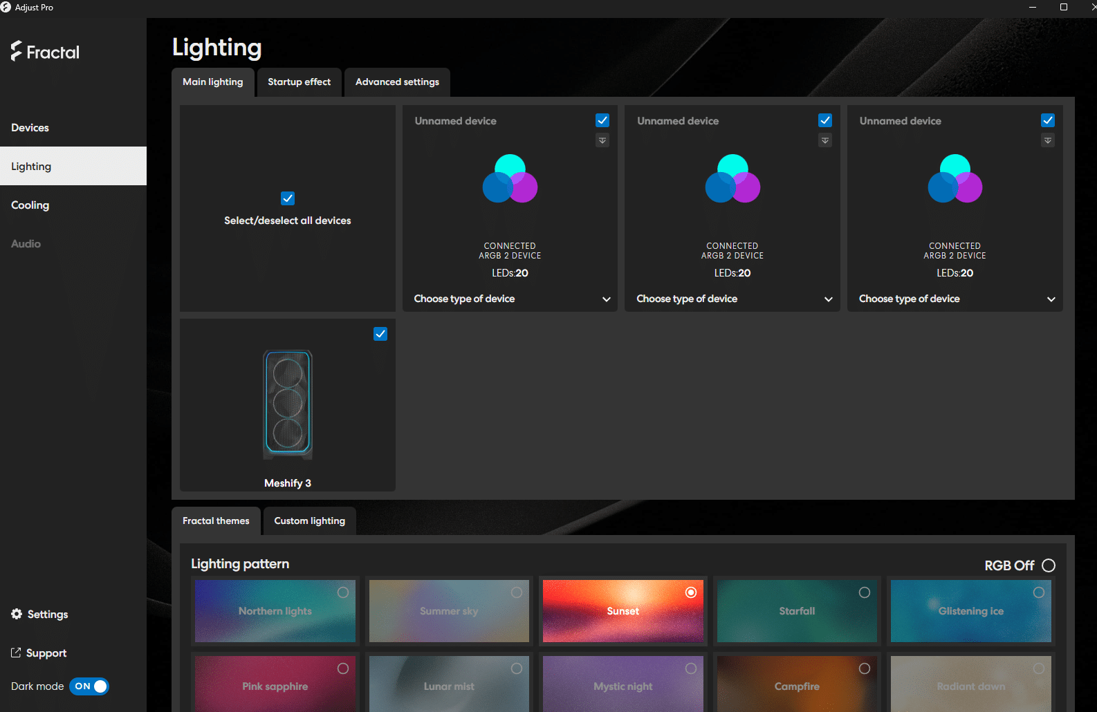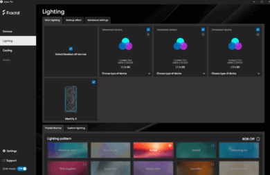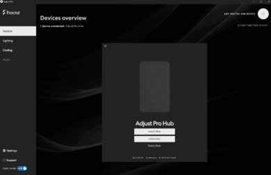 Both versions worked smoothly in the test. The user interfaces are clearly structured so that both lighting effects and fan curves can be adjusted quickly and intuitively. Nevertheless, a favorite has emerged in practice: The Adjust Pro desktop software scores points with fast recognition of the hub, a stable connection and a wider range of functions. Not only can predefined lighting effects be selected here, but individual color gradients and temperature-dependent fan profiles can also be defined.
