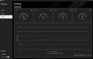 The connection is made directly to the mainboard via a USB port, which enables simple integration into the system. Fractal provides two options for control: the classic Adjust Pro software, which can be installed locally, and a web-based online tool, which can be used directly in the browser without installation.