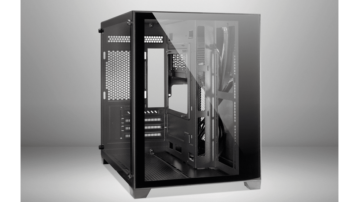 As already suspected, the interior of the C-501 consists of two chambers. The large main chamber offers space for a µATX mainboard, a long graphics card and various fans below, above and to the side of the mainboard. There is also so much space in the upper area that an AiO water cooling system with a thick 240 mm radiator can easily be installed here. The manufacturer has placed numerous openings around the mainboard tray to facilitate the cabling of the components. The feed-throughs on the right-hand side of the tray are angled at 90 degrees.