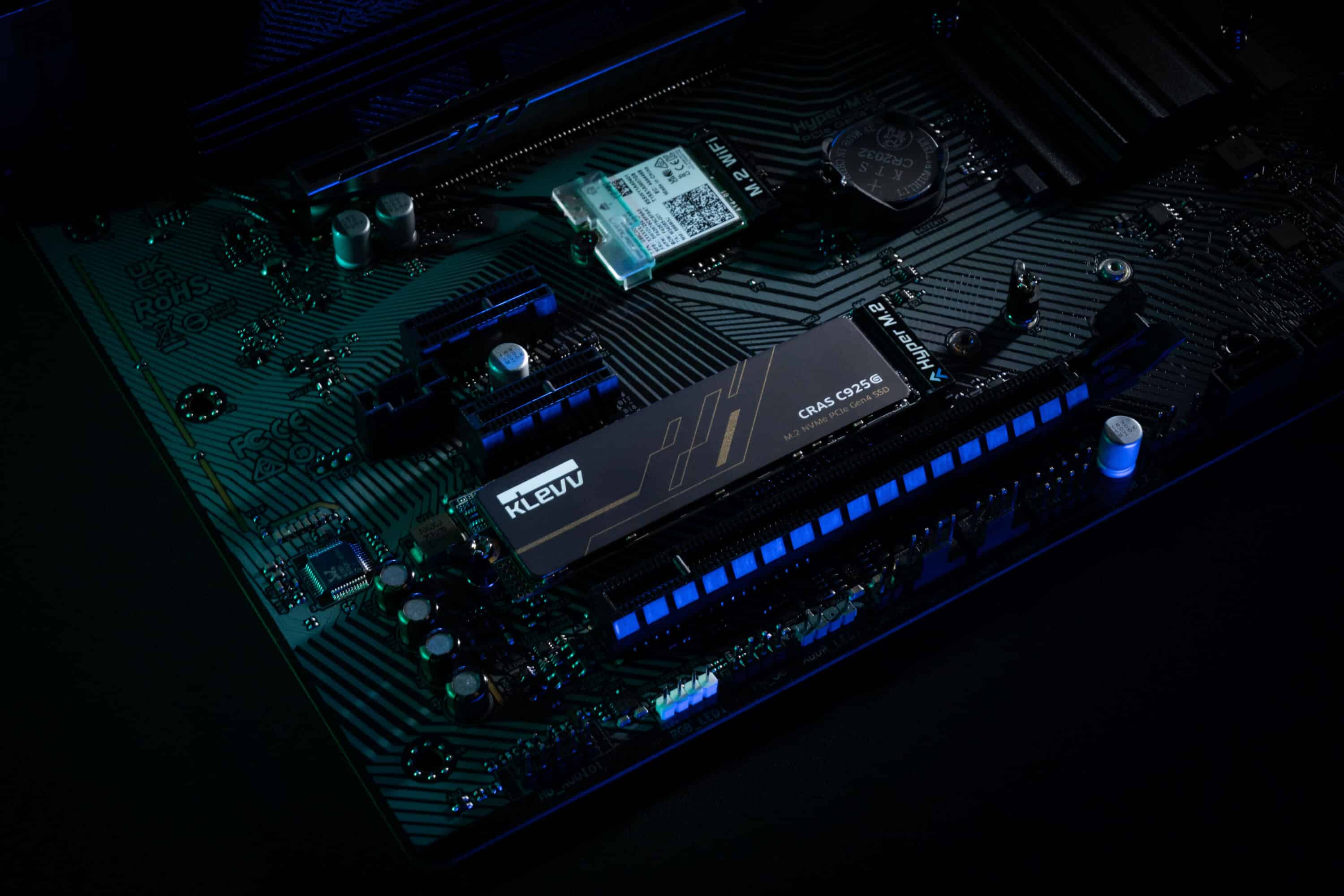 For price-conscious gamers, the KLEVV CRAS C925G offers a new way to add more storage space to their gaming PC. The NVMe SSD in the common M.2-2280 form factor is available from 500 GB up to capacities of over 1 and 2 TB. The fourth-generation PCIe interface is used. According to the manufacturer, speeds of up to 7,400 MB/s for sequential reading and 6,500 MB/s for sequential writing can be achieved. Thanks to the integrated graphene thermal cooling pad, temperatures should remain manageable even during intensive use – perfect for ambitious gamers.