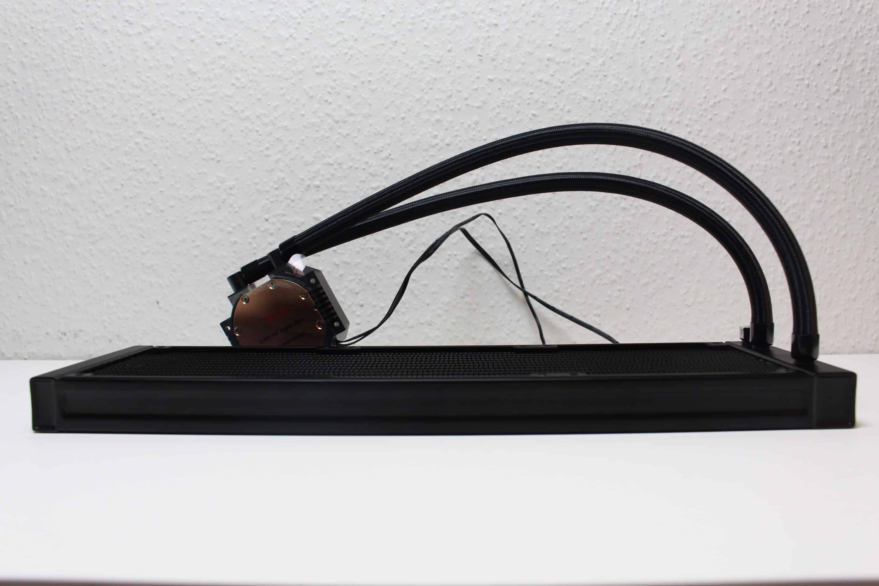 The connection between the pump and radiator is made via two approximately 400 millimeter long hoses, which are covered with a close-meshed nylon sleeve to improve the appearance. The hoses are pressed into fixed metal sleeves on the radiator and cannot be removed. On the side of the pump block, the hoses end in two very flexible joints, which are also fitted with metal sleeves. It is therefore not possible to expand or refill the compact water cooling system.