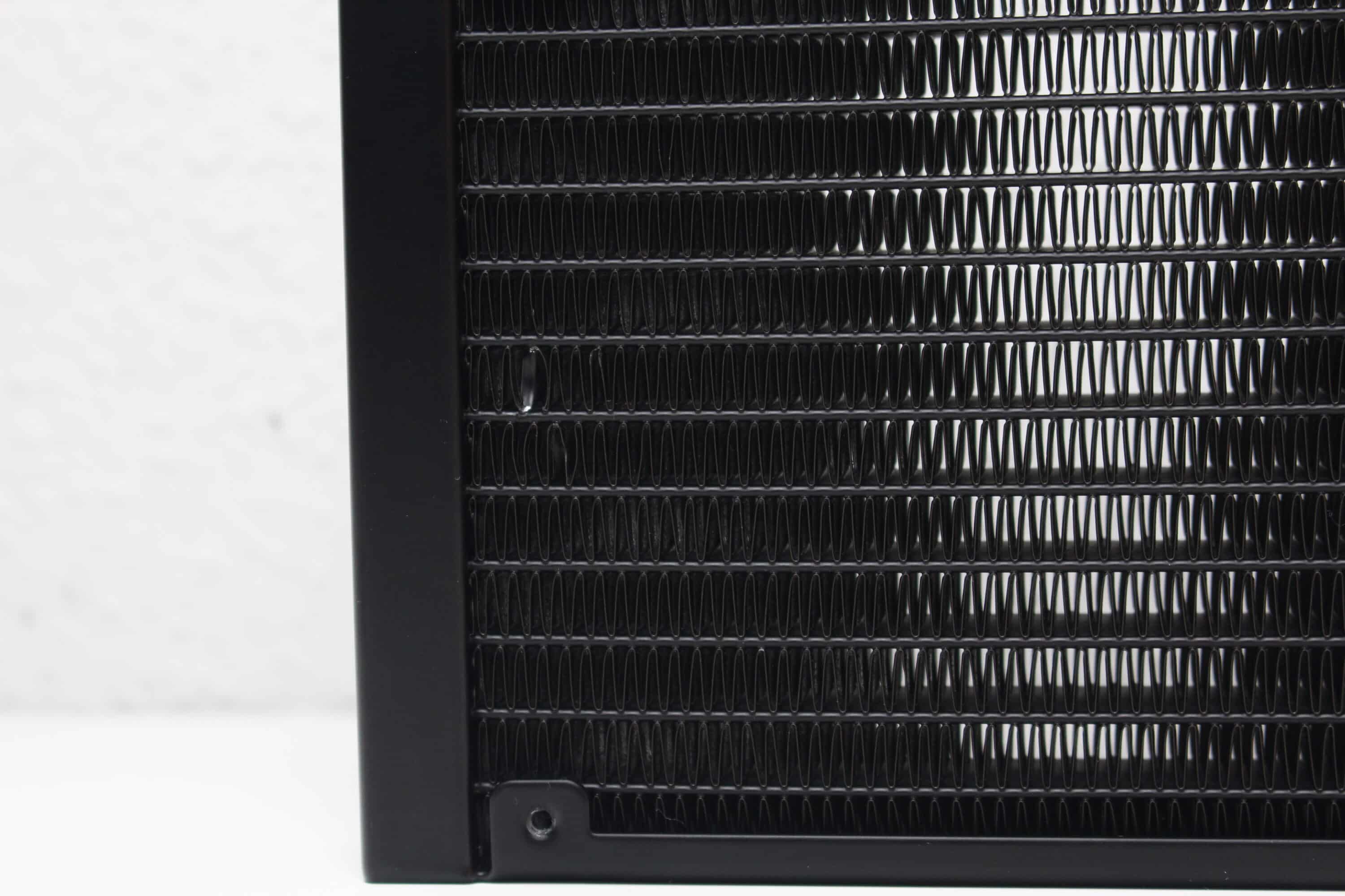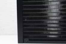 The radiator of the LC-CC-360-B-ARGB – JetFlow measures 398 x 120 x 27 millimeters and is painted completely black. It is made of aluminum and has no lettering or eye-catching accents. Only certain indentations can be seen on the side. The manufacturer has also dispensed with RGB lighting in or on the radiator. LC-Power has also placed a kind of nozzle in the area of the hoses, which was presumably used to fill the AiO water cooling system or serves as a kind of pressure equalization valve.