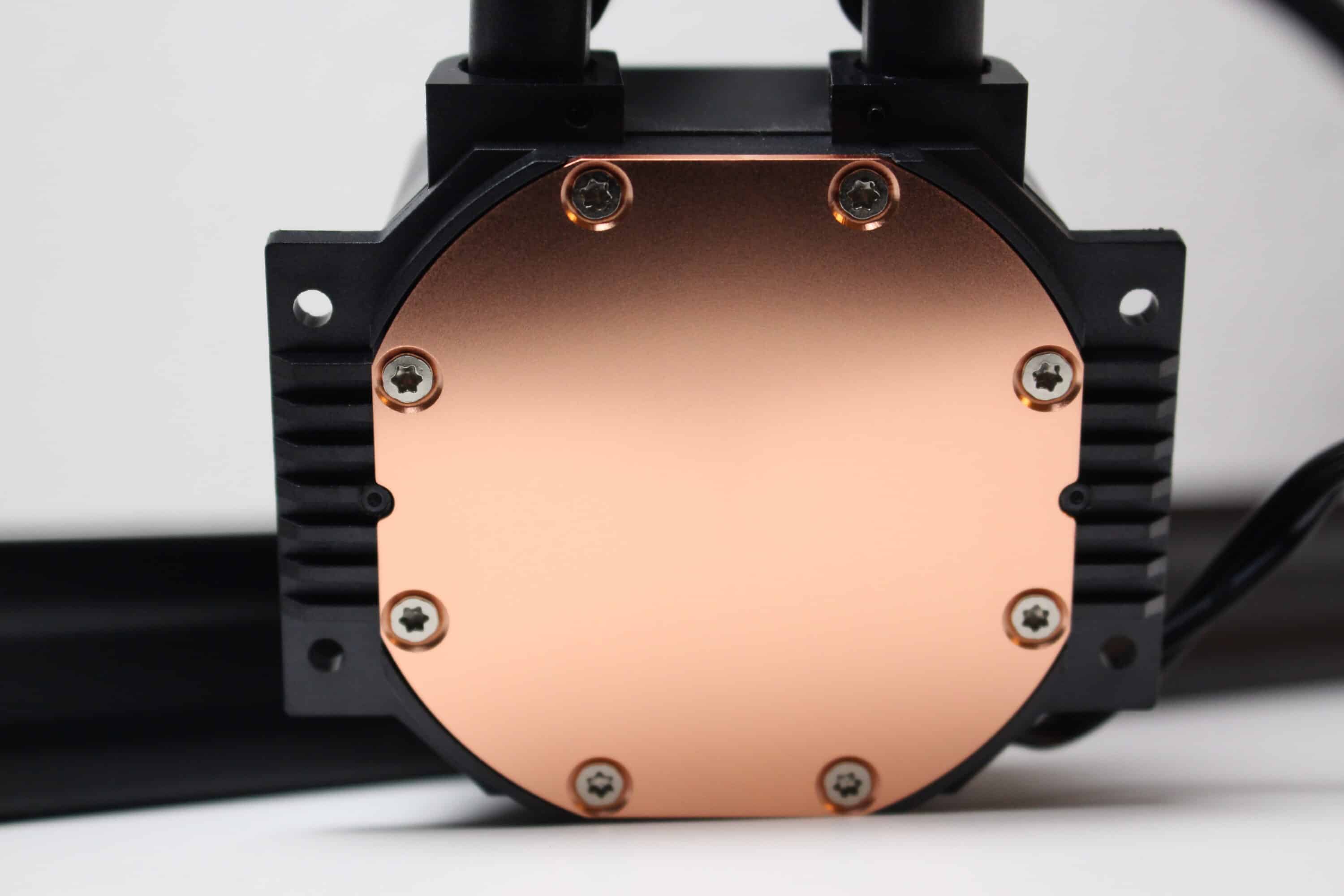 At first glance, the manufacturer’s design of the pump block is unspectacular: the housing is made entirely of black plastic and the manufacturer’s logo is slightly highlighted on the lid and colored silver. The manufacturer installs a ceramic pump in the housing, which is controlled via a 3-pin 12V connection. The CPU heat is dissipated via a large copper cooler base. Finally, the CPU block also has a discreet ARGB stripe on the right and top edge. But more on that later.