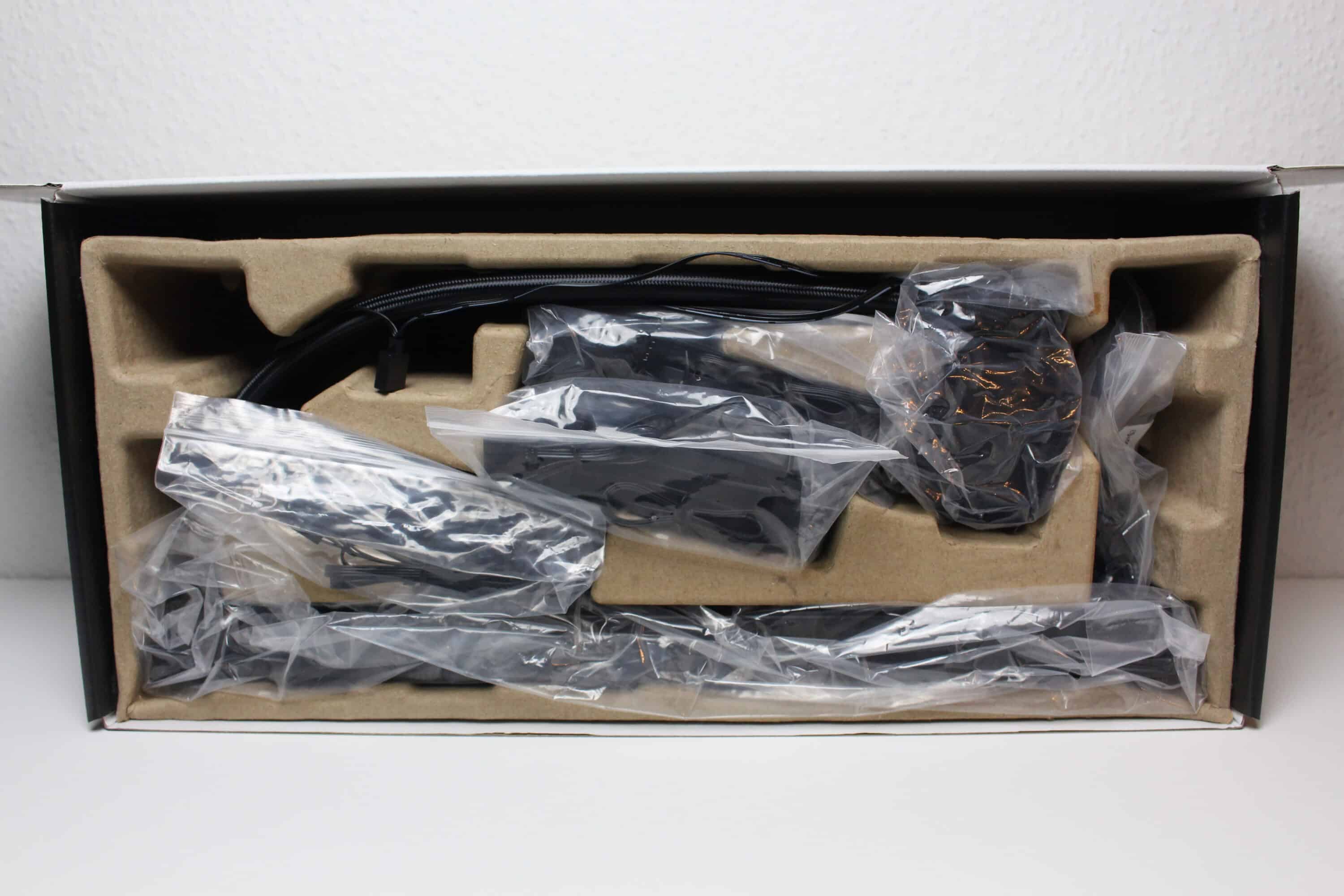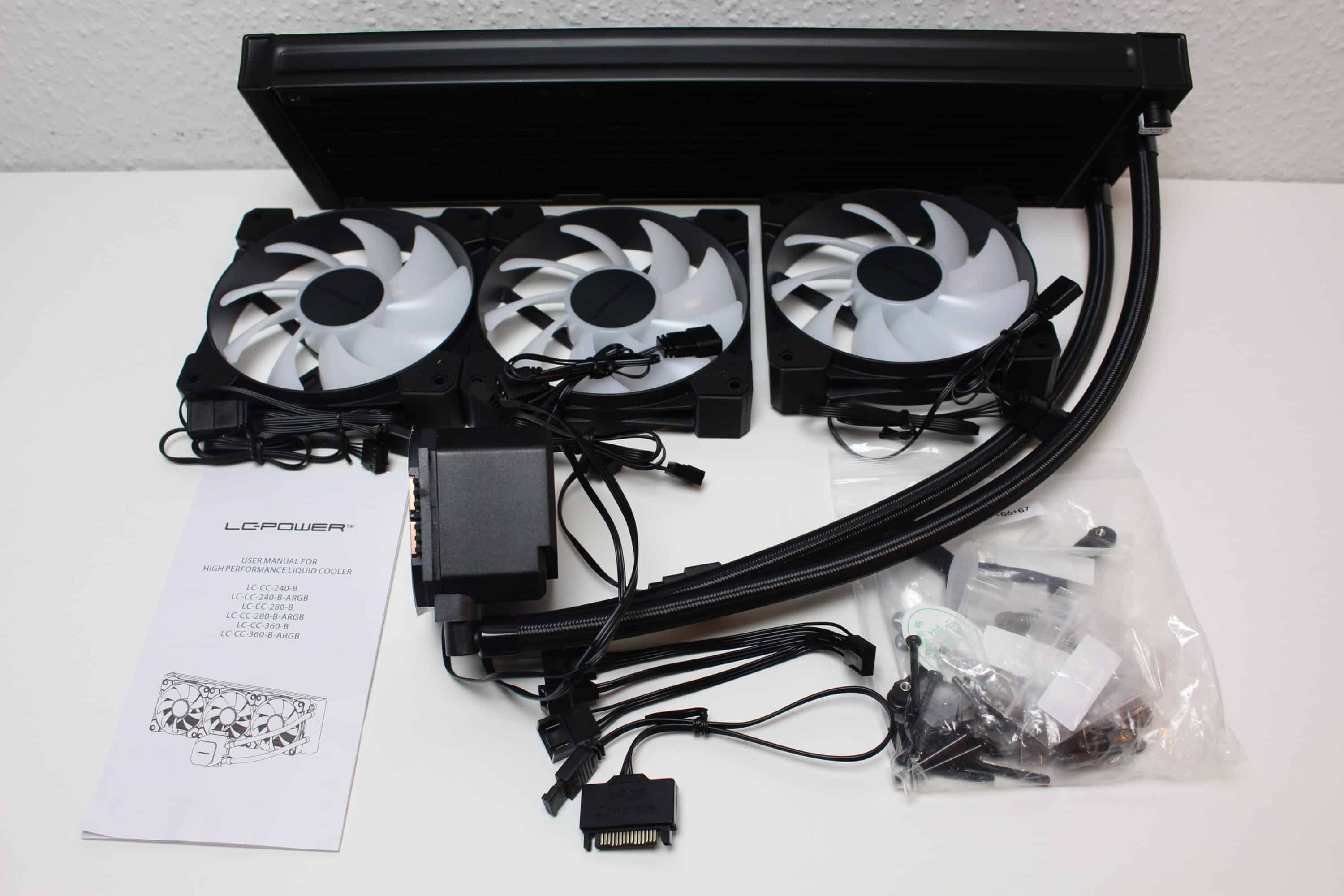 When you open the packaging, you first come across a thin layer of foam and a mold made from recycled cardboard underneath. Inside this mold, LC-Power places all the components of the AiO water cooling system and wraps them in individual plastic films for additional protection. The scope of delivery includes the radiator/pump combination, three 120 mm ARGB fans, the necessary mounting material for all standard sockets, a tube of thermal paste, assembly instructions, a triple Y-splitter for the three fans and a simple ARGB controller.