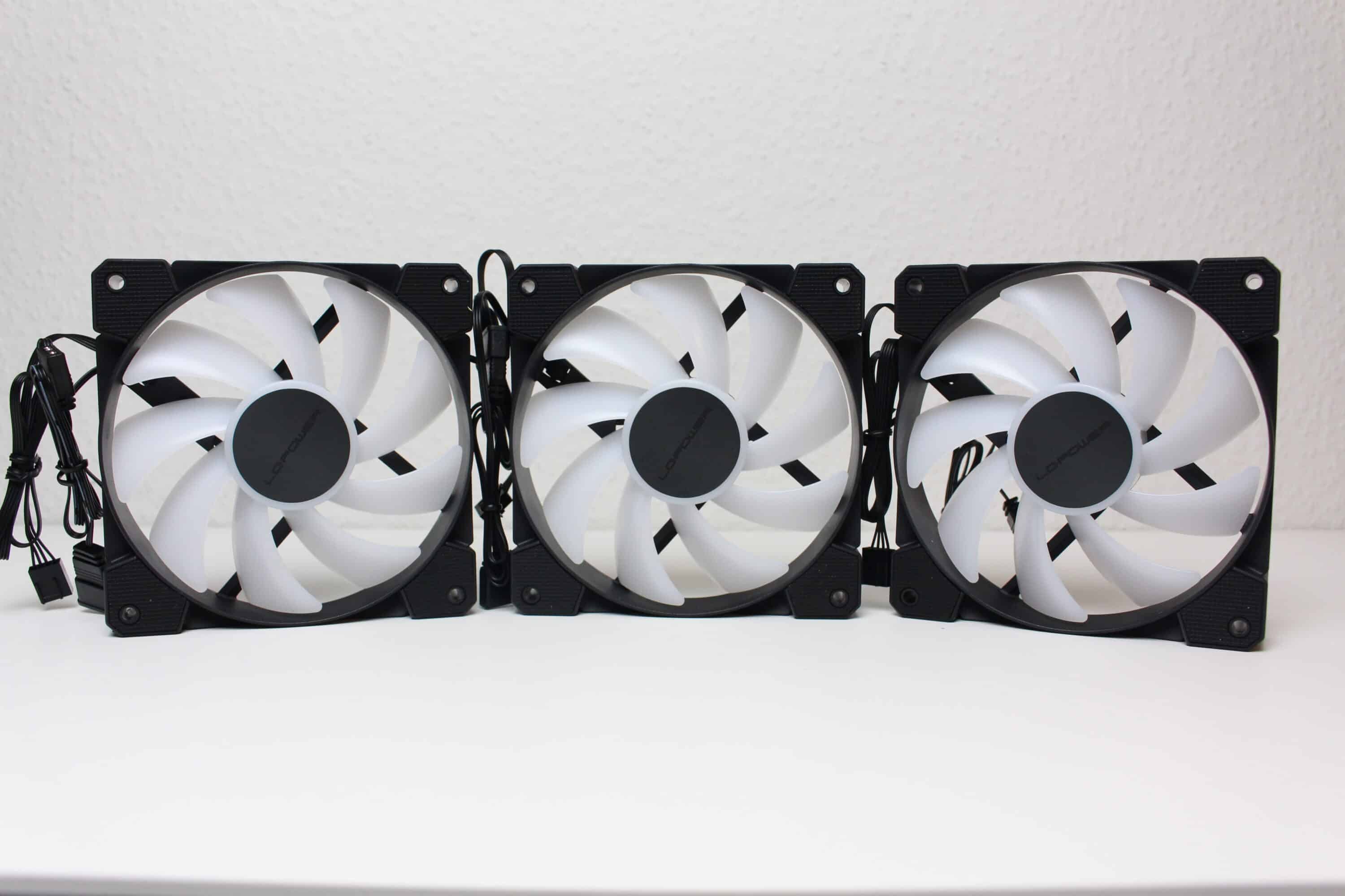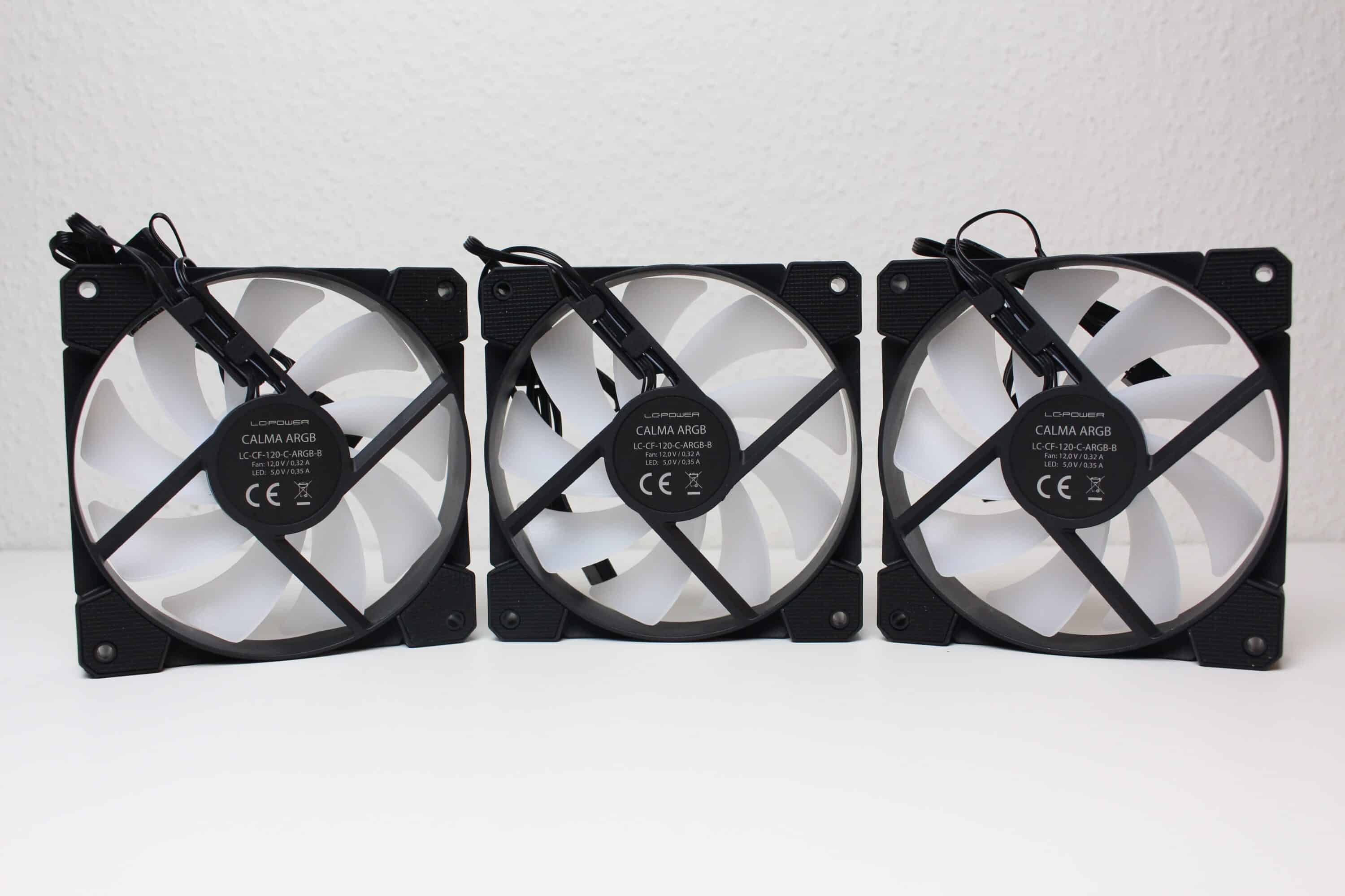 The three LC-Power CALMA ARGB fans supplied have a frame width of 120 millimeters and consist of a black frame and a milky-white rotor blade with nine fan blades each. The fans can reach speeds of between 500 and 2000 revolutions per minute via the 4-pin PWM connection. The RGB lighting was implemented using eight individual LEDs in the fan hub and is controlled via a conventional 3-pin 5V ARGB. To reduce vibrations, all eight corners have a layer of rubber.