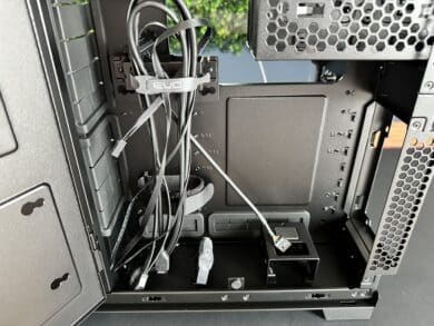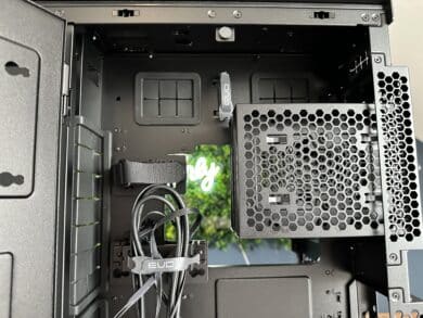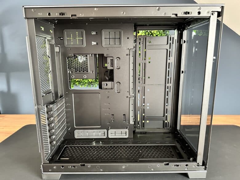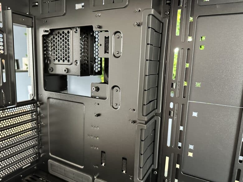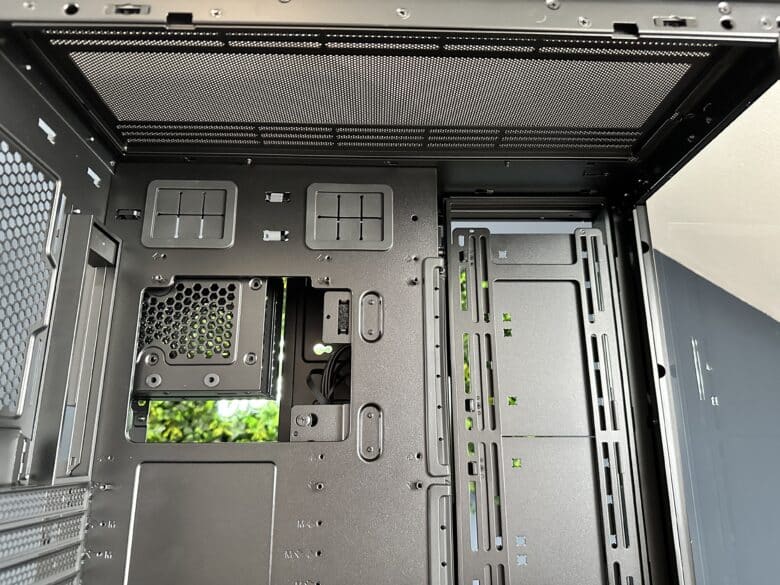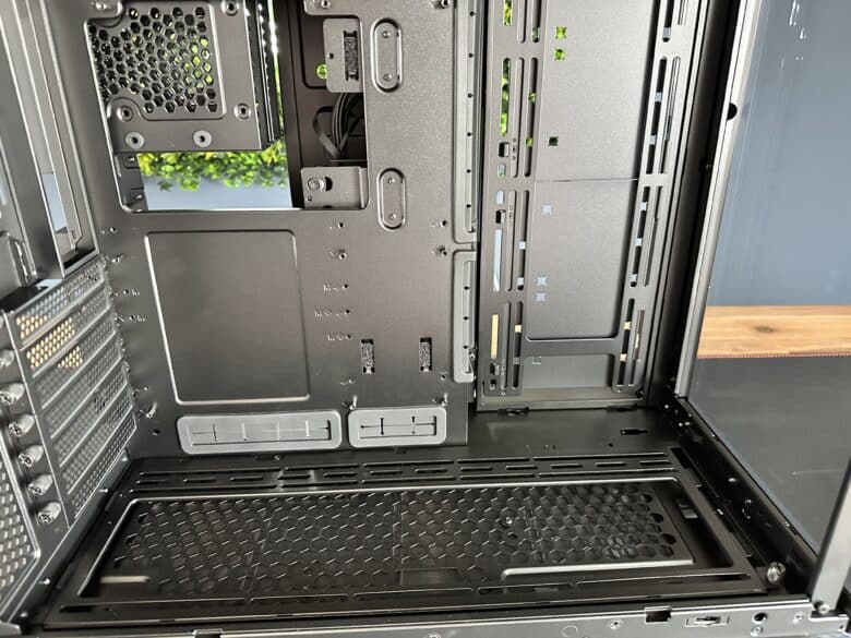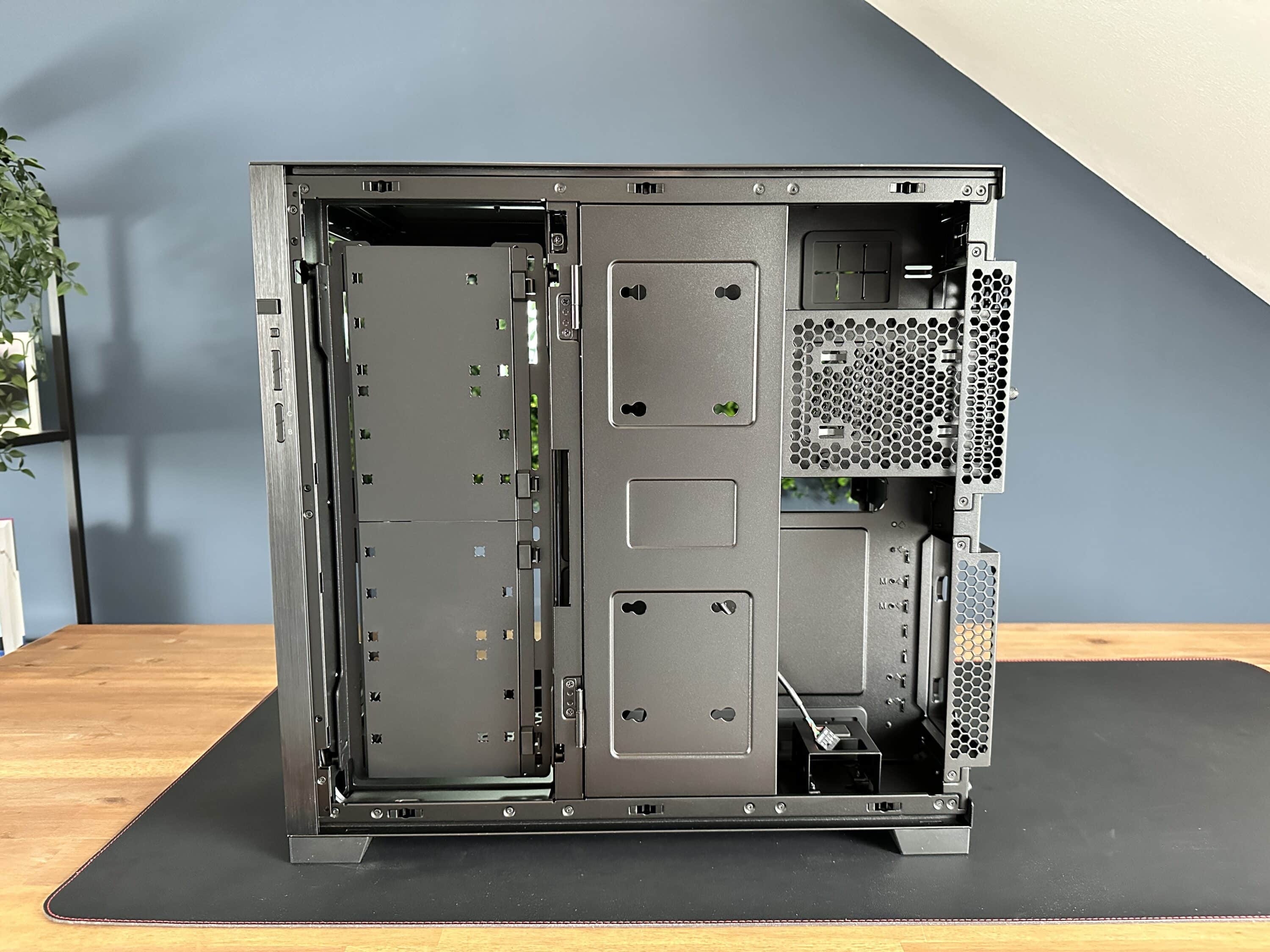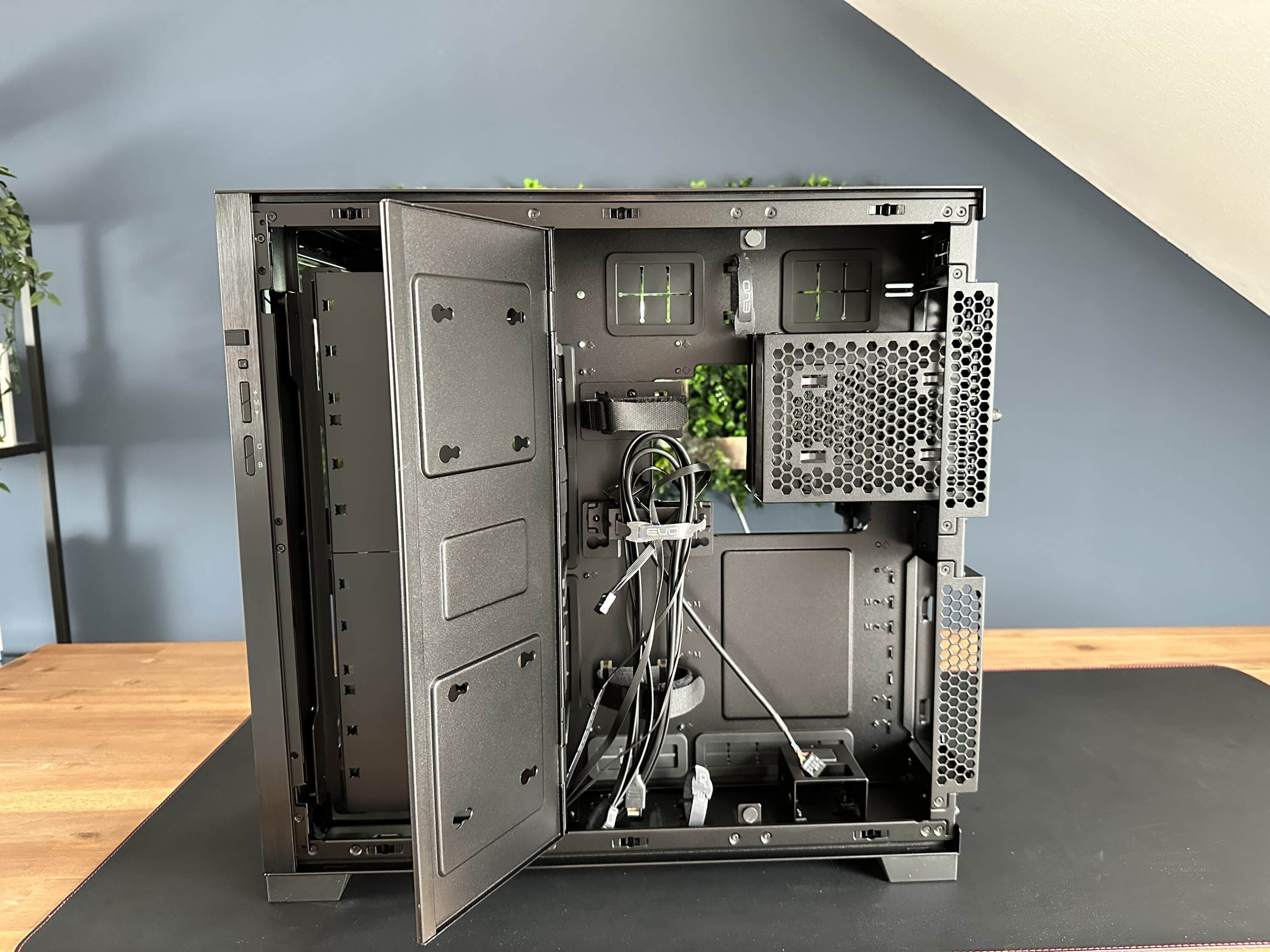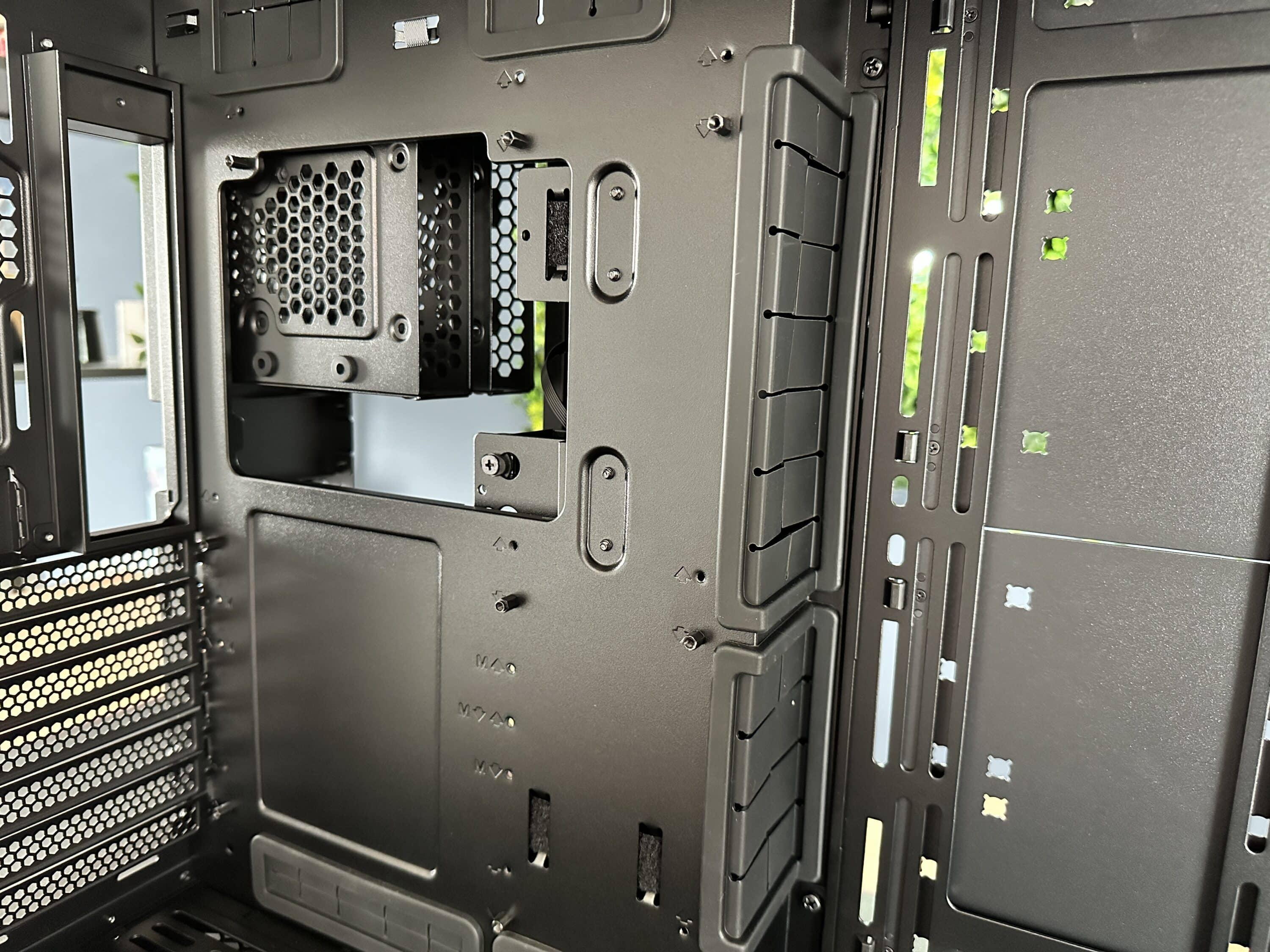 After removing the cover, the interior is revealed, which is cleverly equipped with another cover to neatly conceal the cables. At first glance, it is clear that there is sufficient space for SSDs and well thought-out cable management.