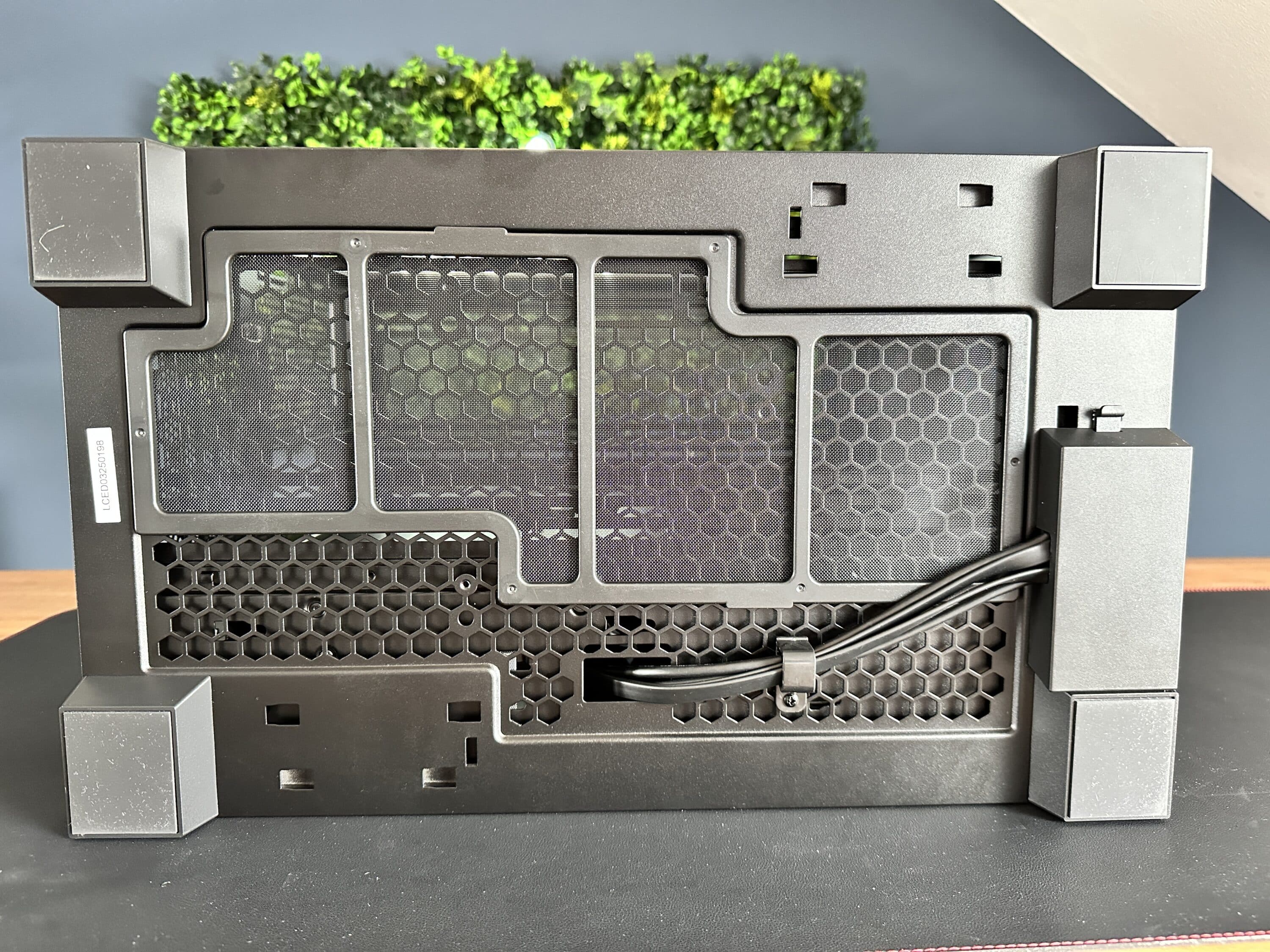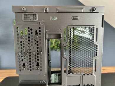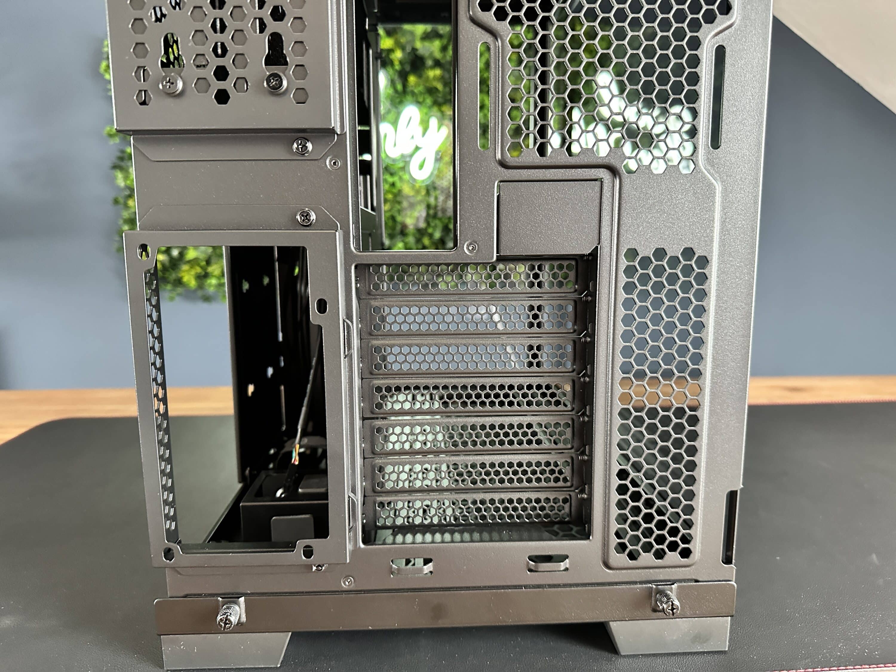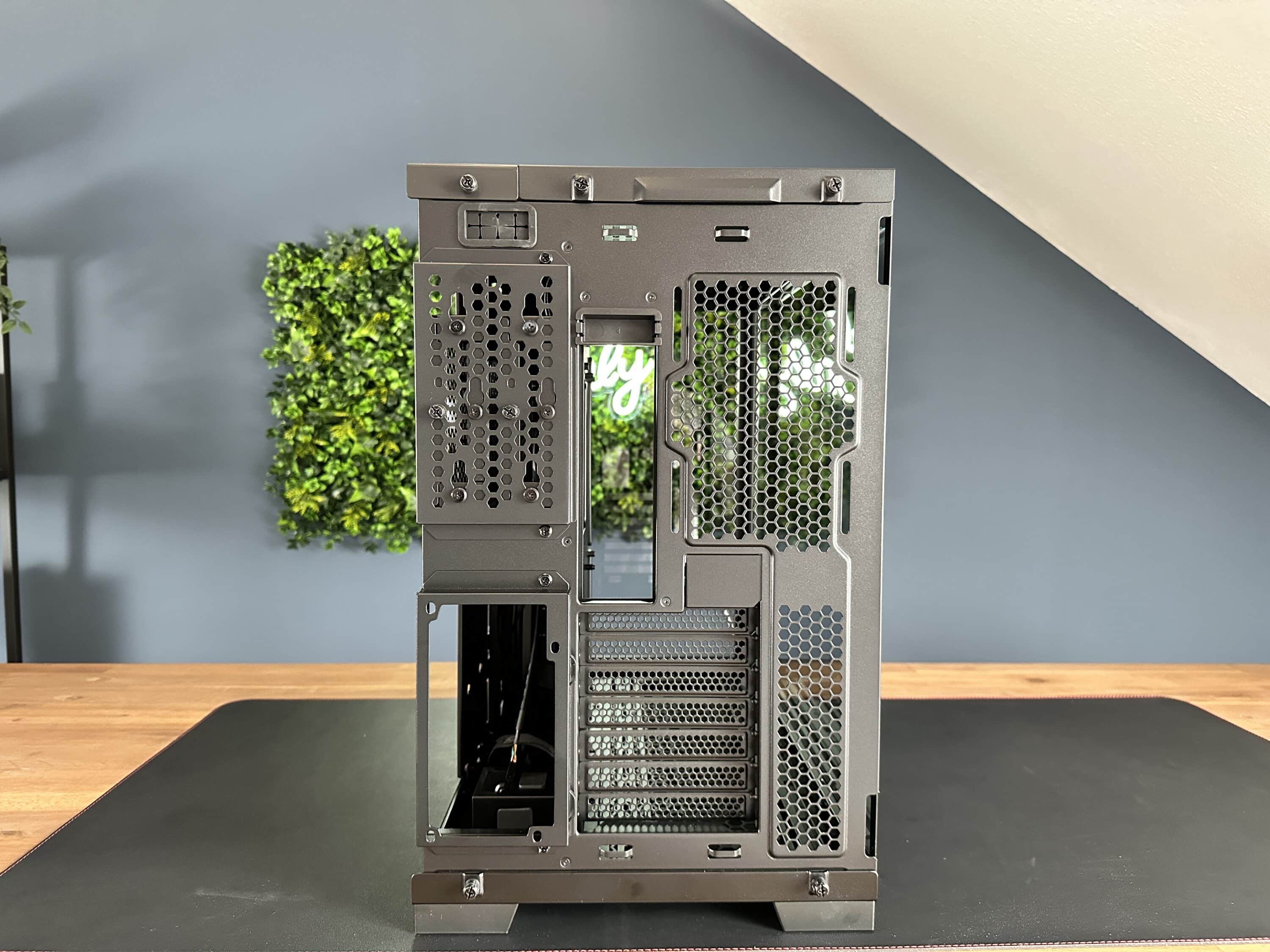 The airflow theme continues at the rear of the Lian Li O11D EVO RGB with perforated surfaces that ensure sufficient airflow. The vertically arranged power supply bay and the PCI slot panels are located in the lower area. The upper area not only provides space for additional fans, but also access for cable management and a bay for hard disks, which helps to create a clean and efficient system. Two screws are also visible, making it easy to loosen and remove the lid. This practical solution facilitates access to the inside of the case and makes the installation and maintenance of components even easier.