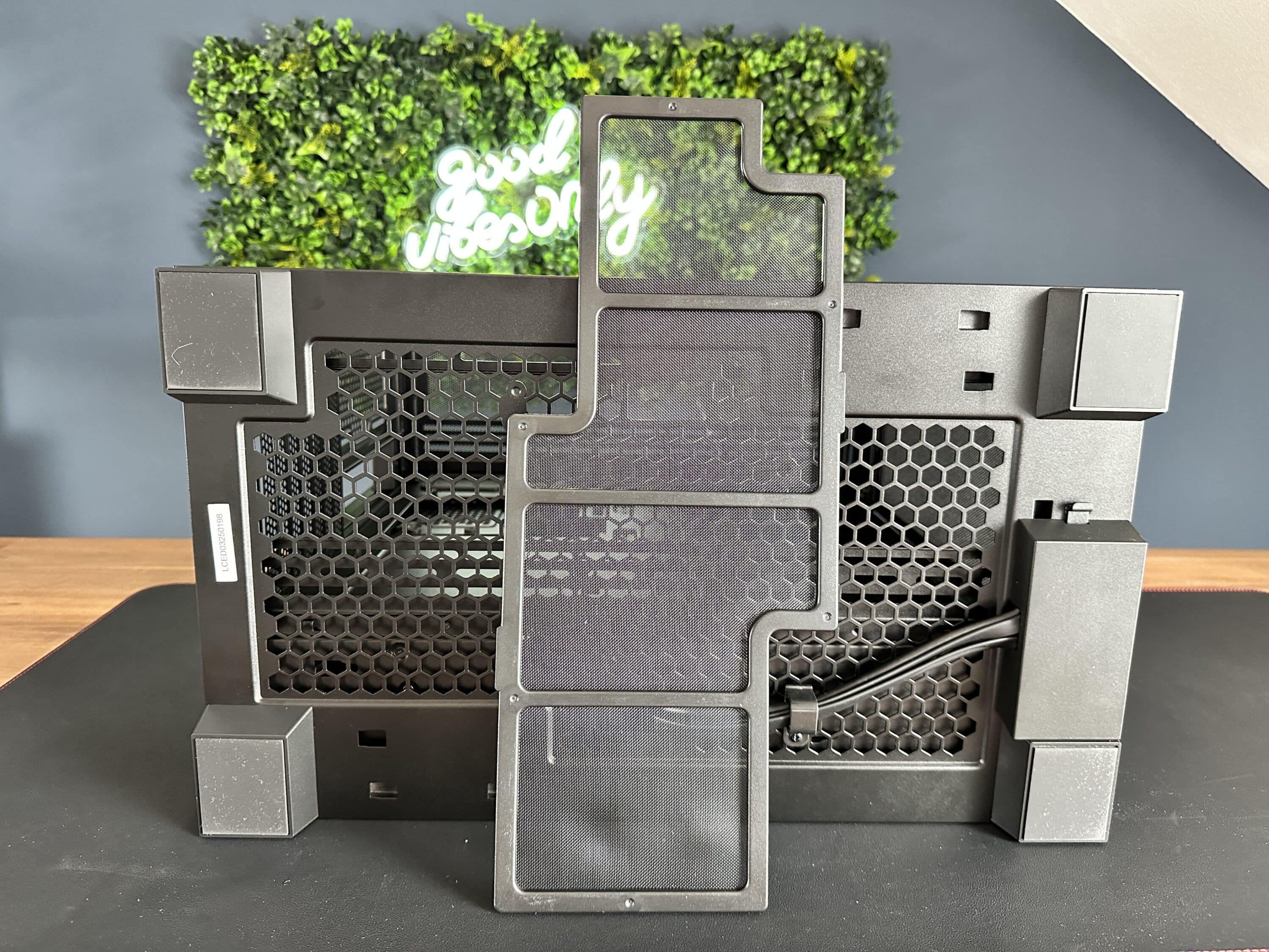 A look at the bottom of the Lian Li O11 Dynamic EVO RGB reveals a bundled cable set, which is responsible for the power supply and connection of the front connectors. These cables are neatly bundled and attached to the bottom of the case. Although this could be seen as a small cost-saving measure, it is hardly noticeable as the design is clean and is neither conspicuous nor disruptive in everyday use. The base also has a roughly perforated surface that is covered with a fine-mesh dust filter. This can be easily removed and effectively protects the interior from dust deposits.