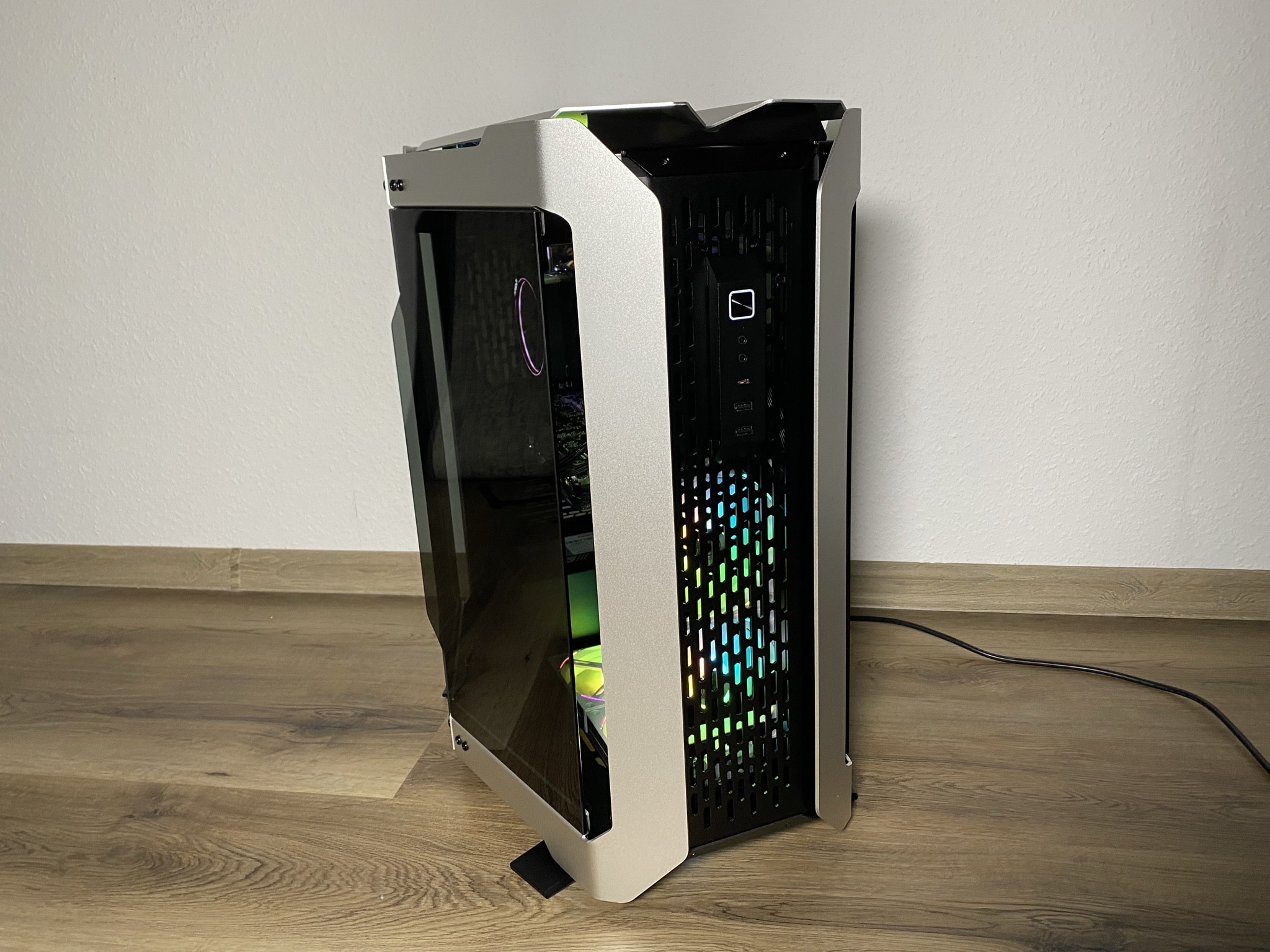 The ODYSSEY X’s glass panels are also particularly well done. And not only because of their looks. A small, sensible ventilation and cooling trick has been used here. In the center, as well as on the respective sides, there are small gaps between the glass and the aluminum. The case is thus opened and ventilated a bit more on both sides in simple places. However, there is also no filtering of the air with a dust filter on the entire ODYSSEY X.