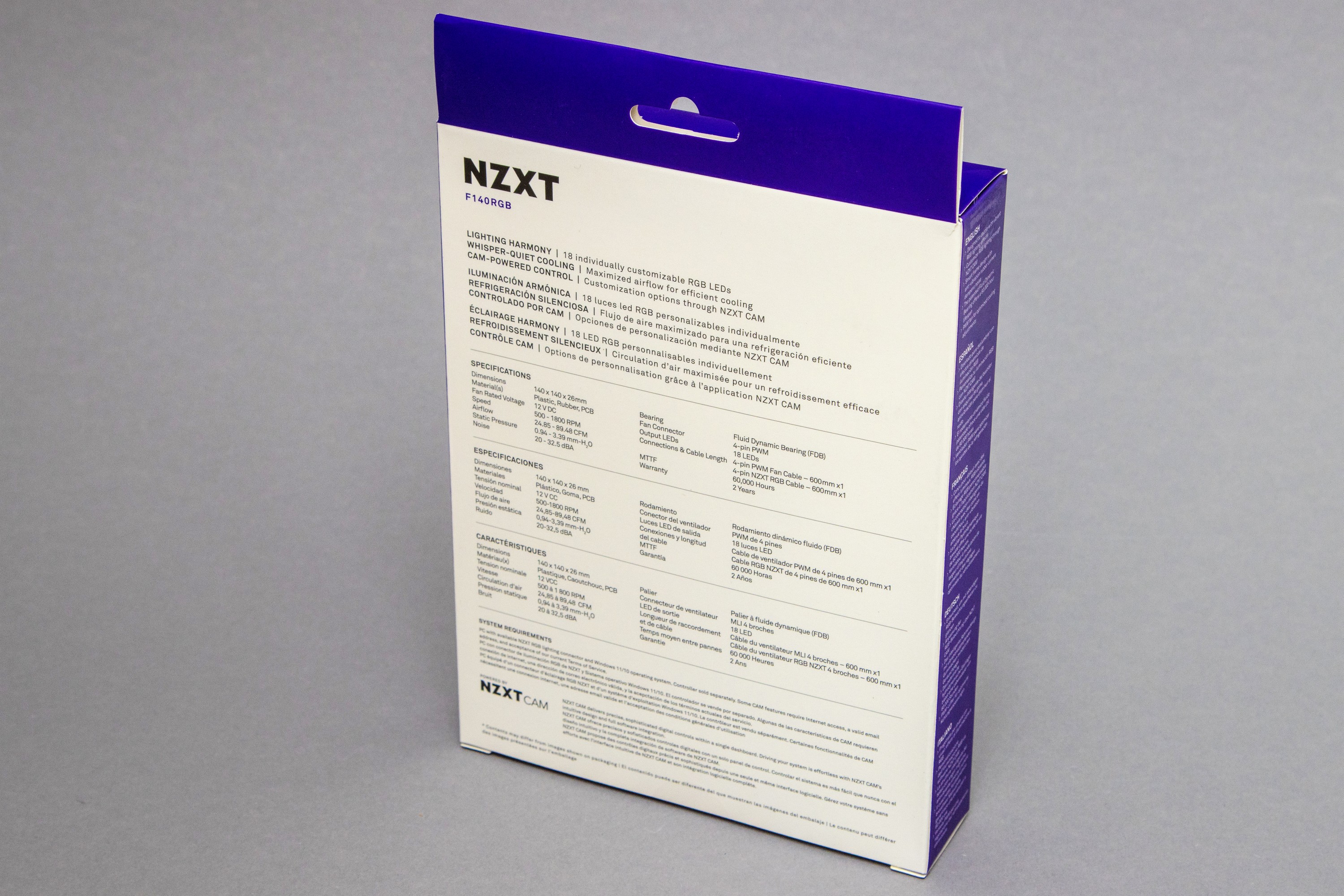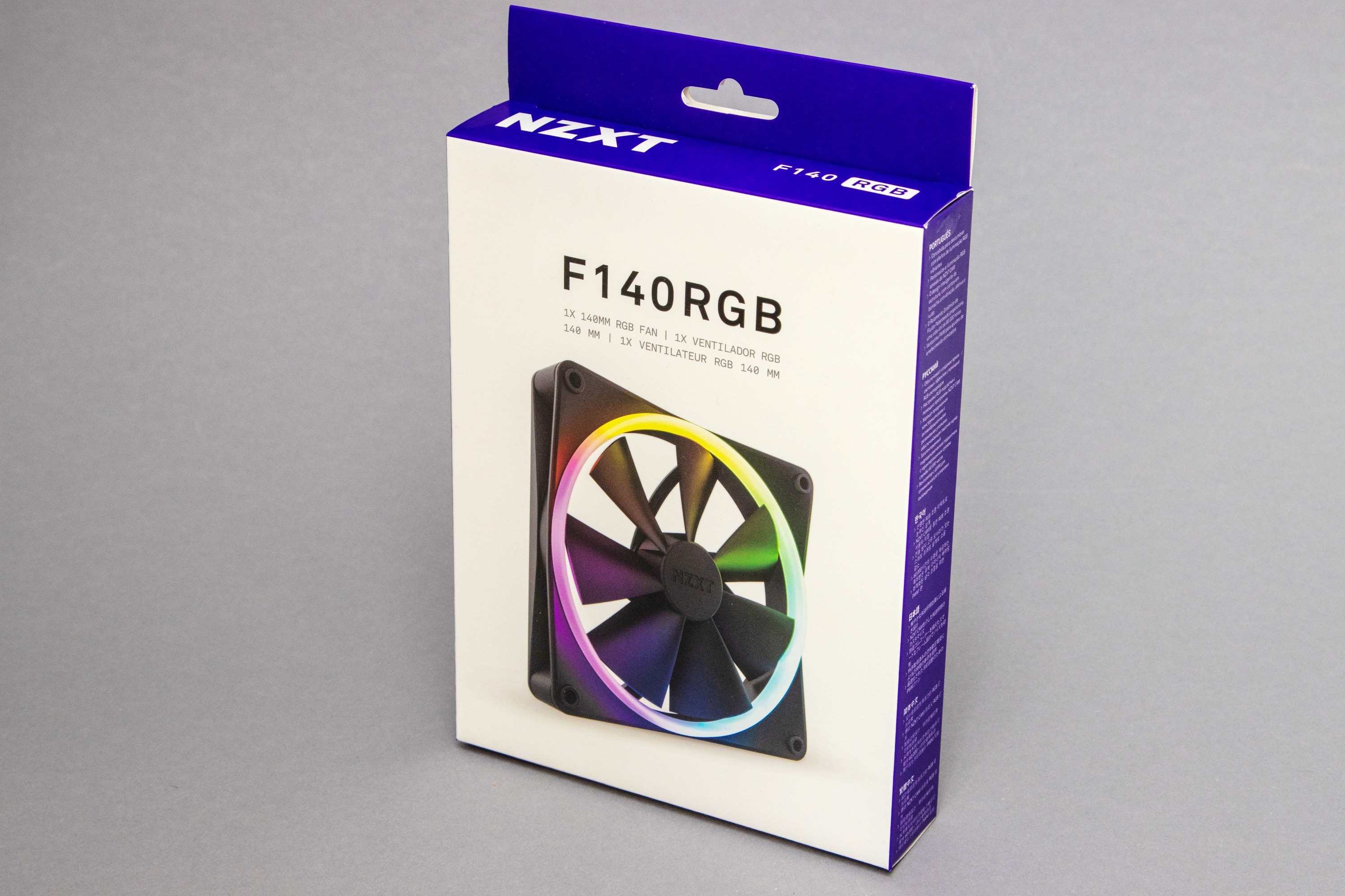 The box is in the typical NZXT colors of white and purple. The strong design focus of the brand is again evident here: The front is very clear with the picture and the article name as well as basic information that it is a 140 mm RGB fan. All other information and specifications can be found on the back in several languages. A few rather meaningless advertising phrases are also printed in several languages on the sides, but are very unobtrusive.