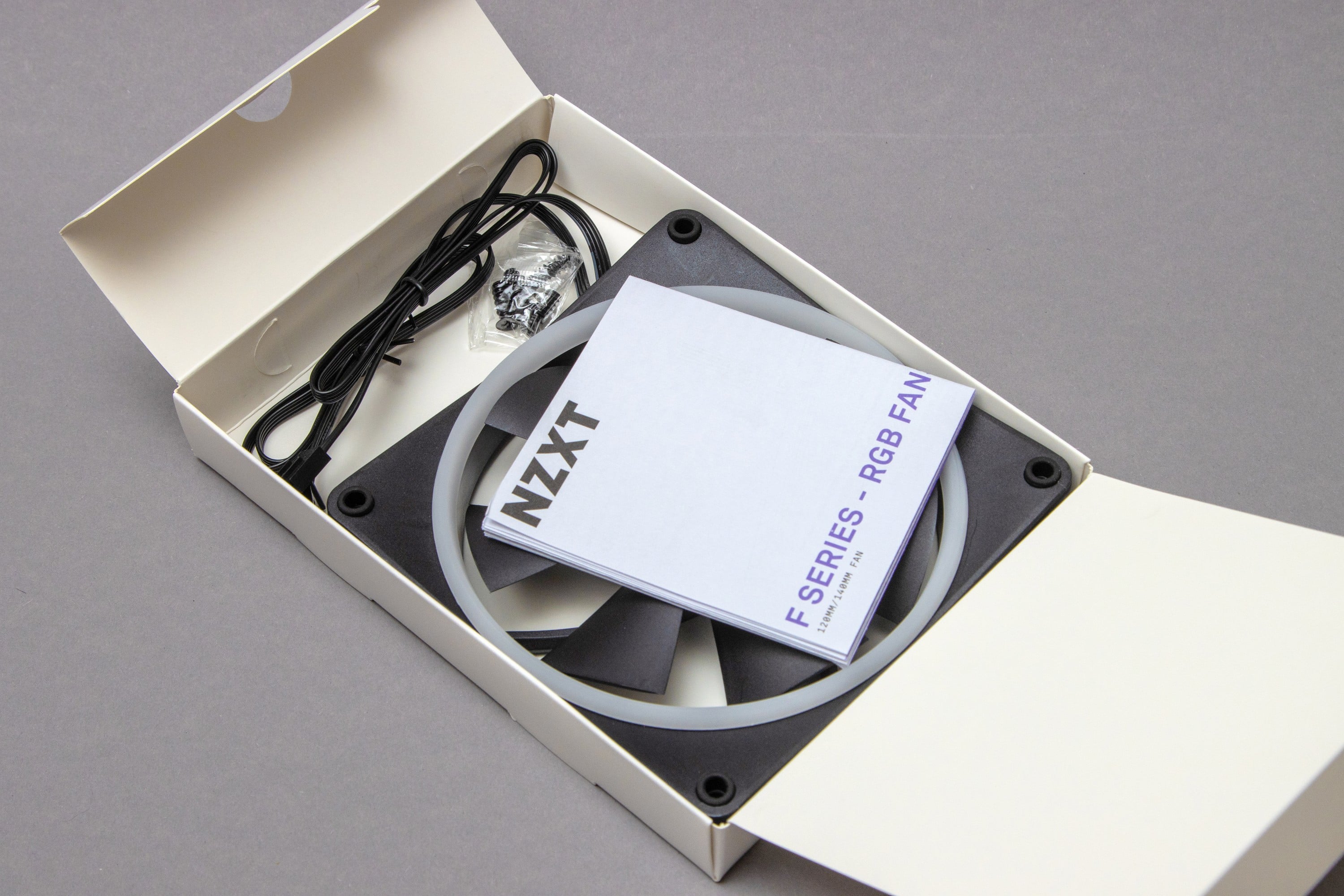 If you open the box, you will see a second white box that you can pull out. If you pull the tabs here, you can see the fan on one side. Its cable and a packet of case fan screws are on the other, smaller side. A small manual is also included.