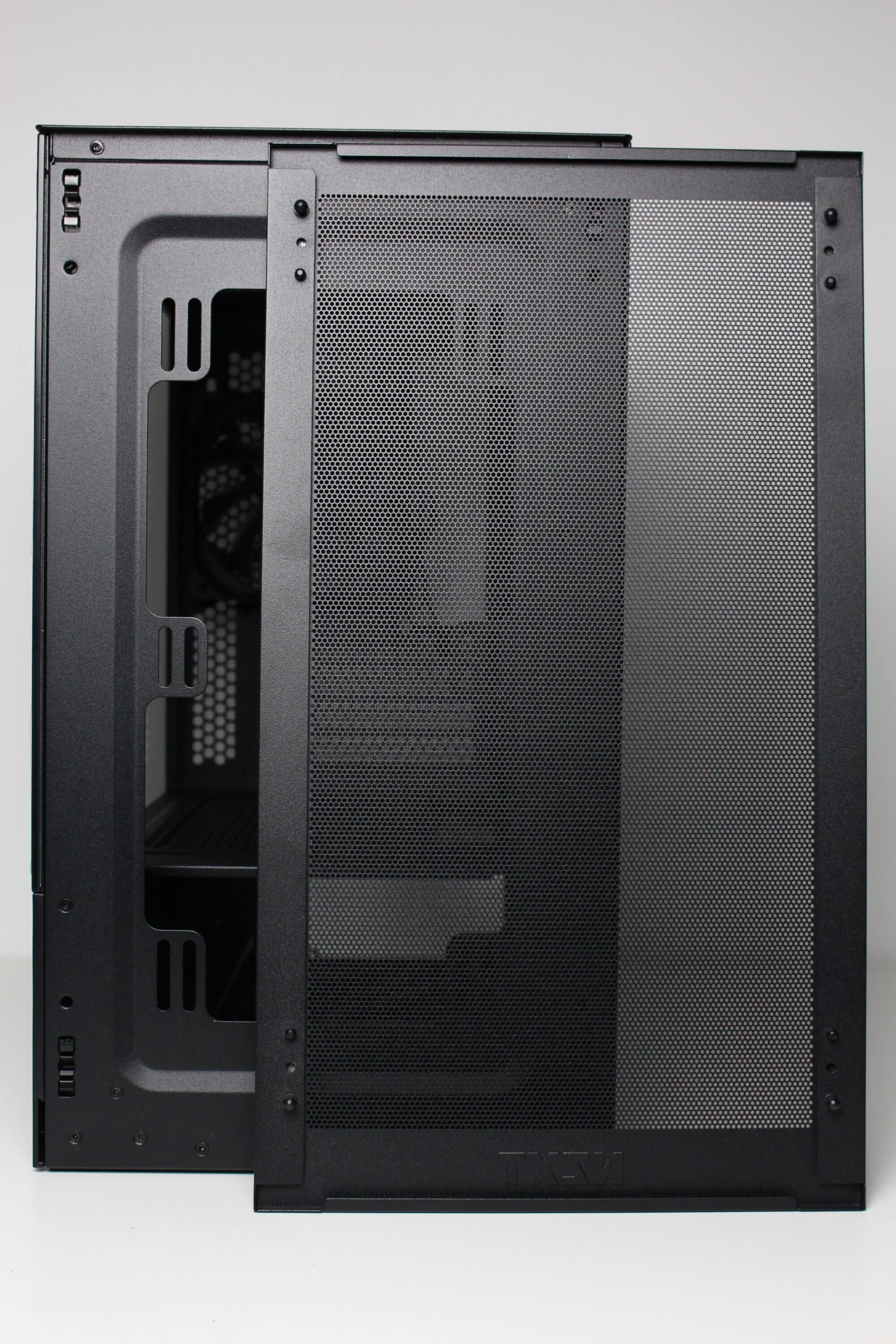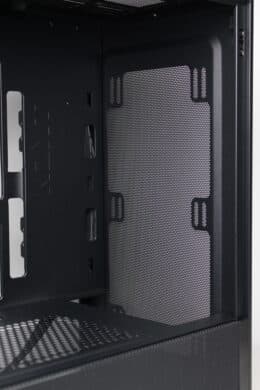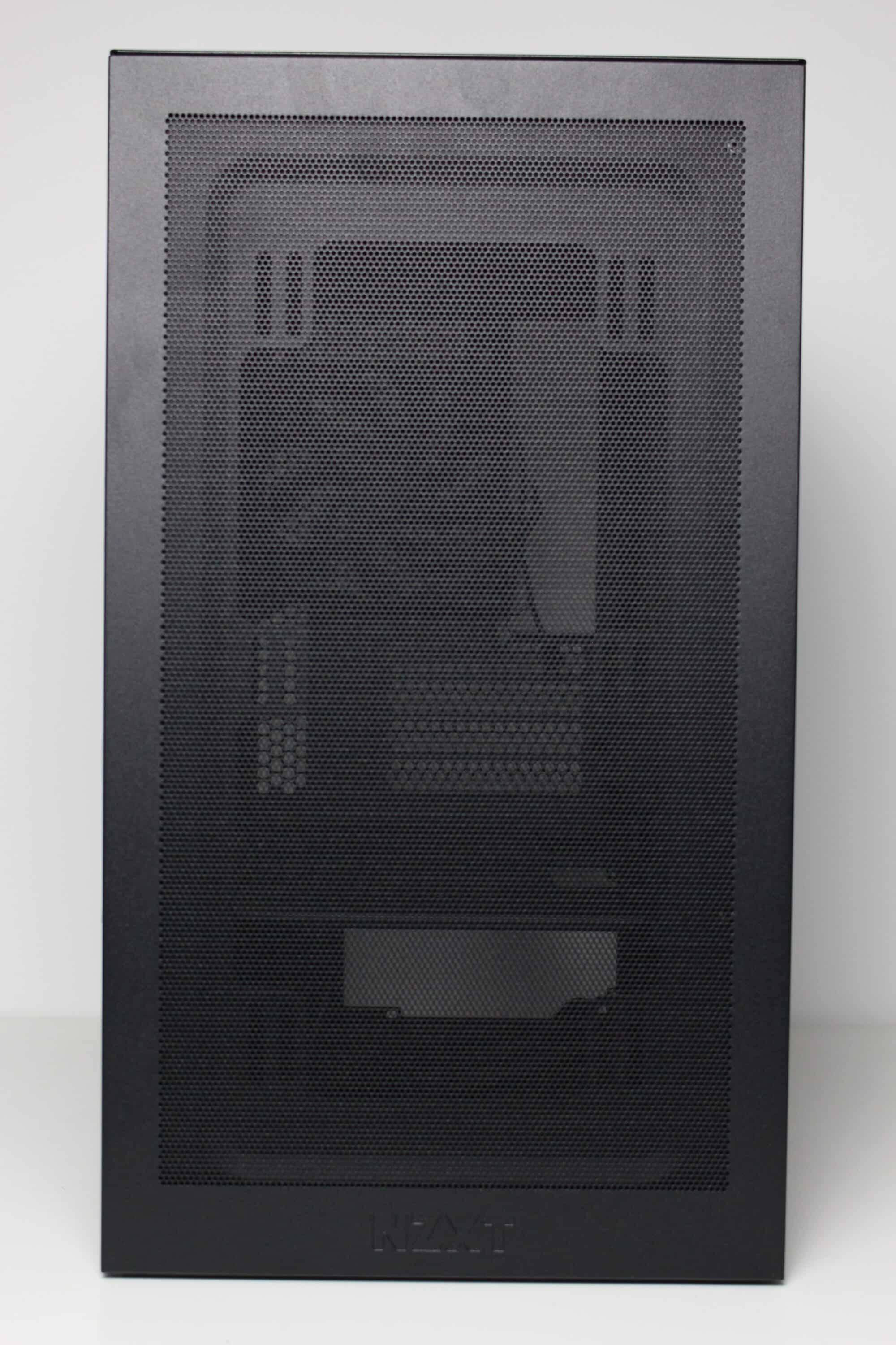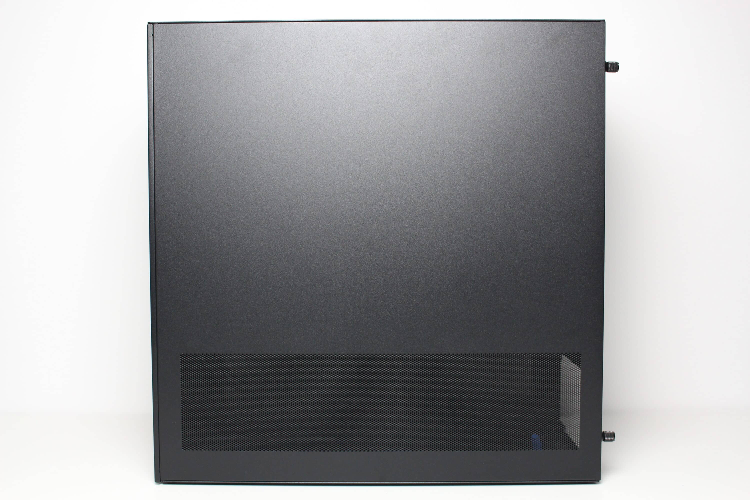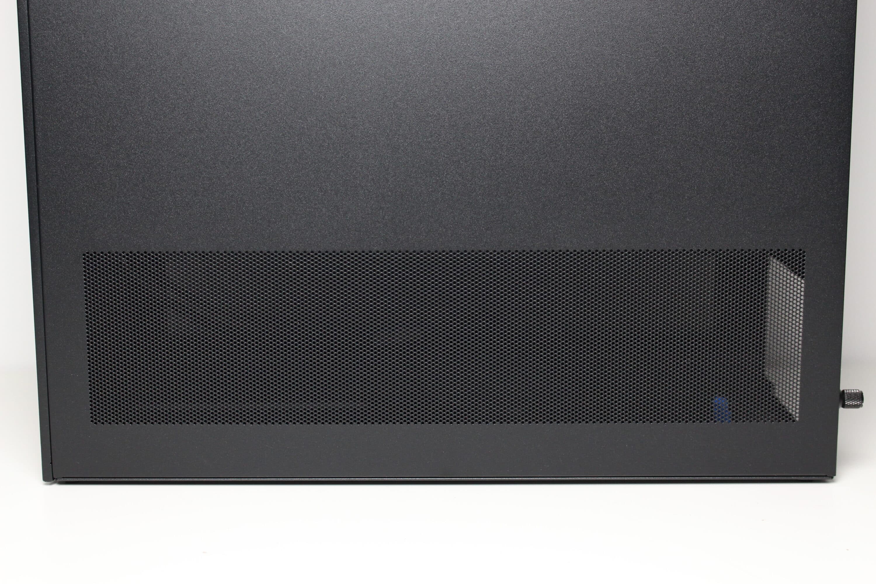 As with the H5 Flow (2024), the left side of the case has a very interesting design. In addition to a slightly tinted side panel made of tempered glass, which is also connected to the body via push pins, we find a fine mesh grille in the lower area, which is rounded towards the bottom. The right side panel is made of steel, is attached with knurled screws and also has a ventilation opening. NZXT has not implemented additional dust filters on either side.