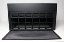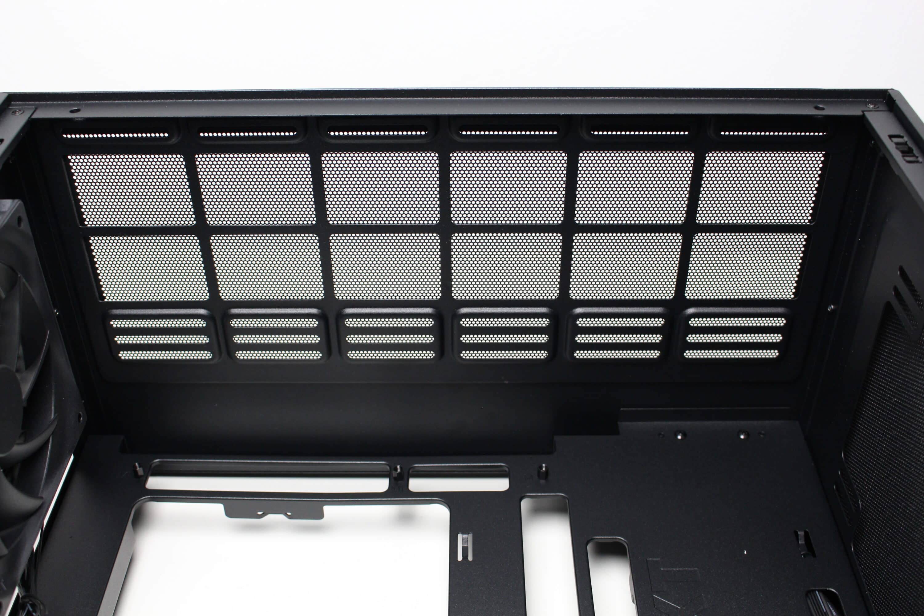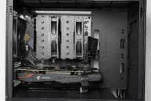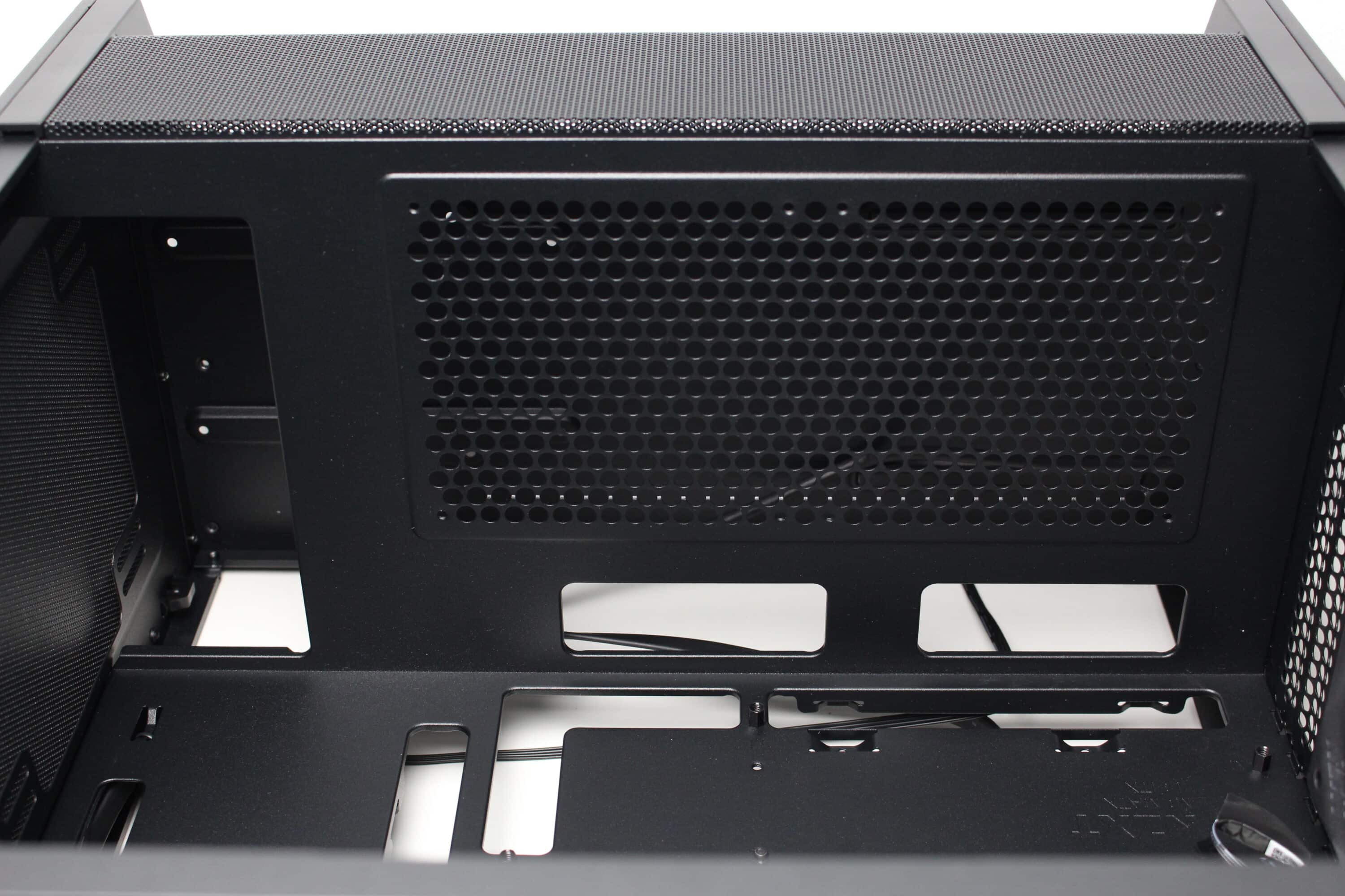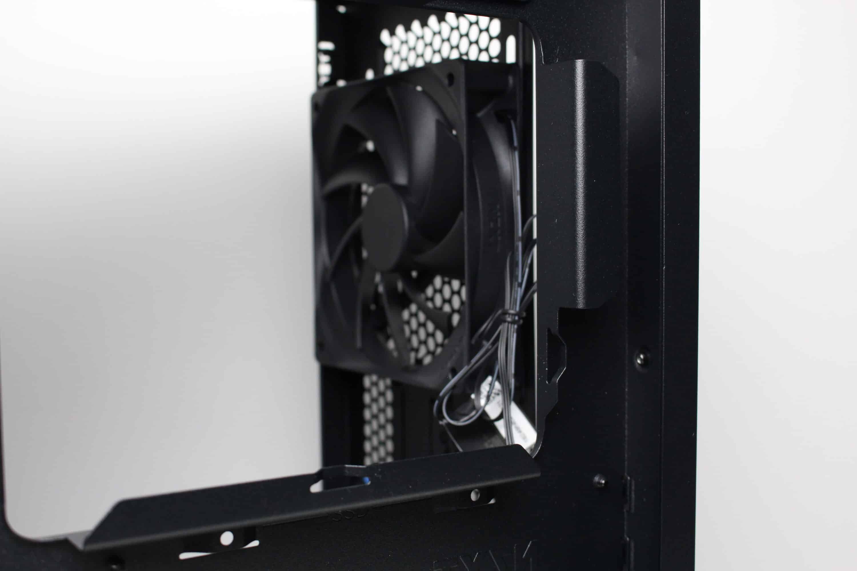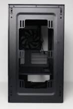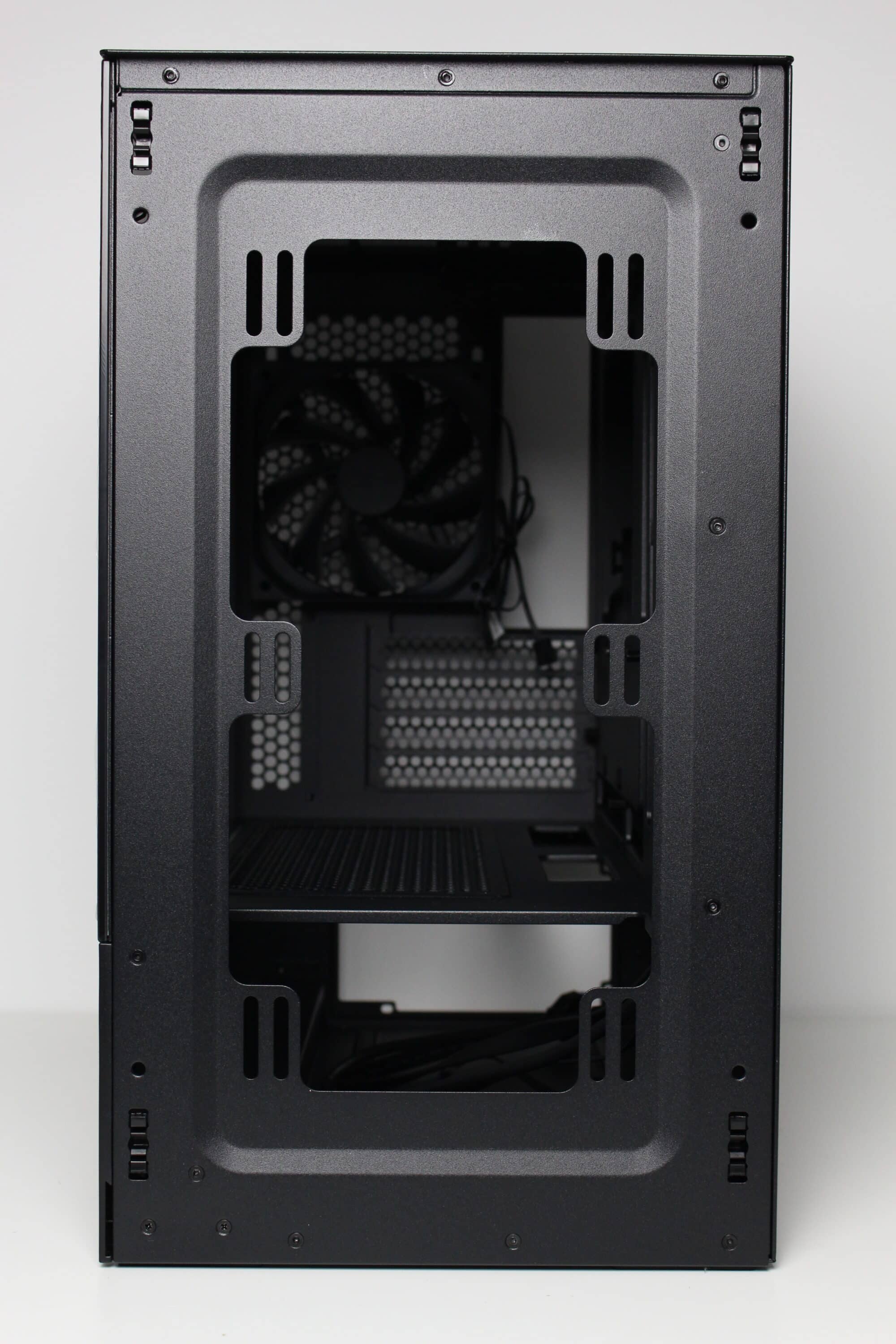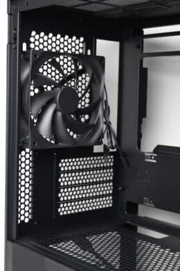 There are no disruptive hard disk cages or other elements behind the optional front fans that could interfere with the airflow. The heated air can flow freely through the interior and is then actively conveyed to the outside by the pre-installed rear fan or can escape passively via the various ventilation openings.