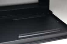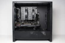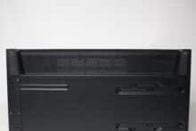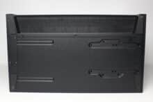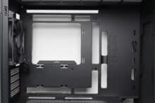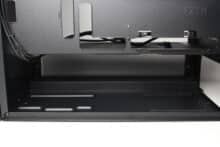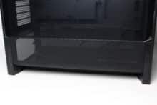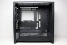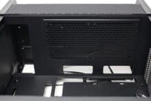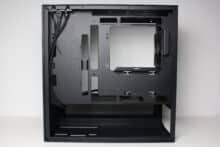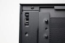 On the other hand, we noticed the small number of mounting slots for data carriers and the fact that the power supply unit can only be mounted with the fan facing upwards. Despite side ventilation openings in the lower area, there is a very high probability that the power supply and GPU will have to fight for fresh air with large graphics cards. Added to this is the extremely minimalist I/O panel and the somewhat thin material thickness in places.
