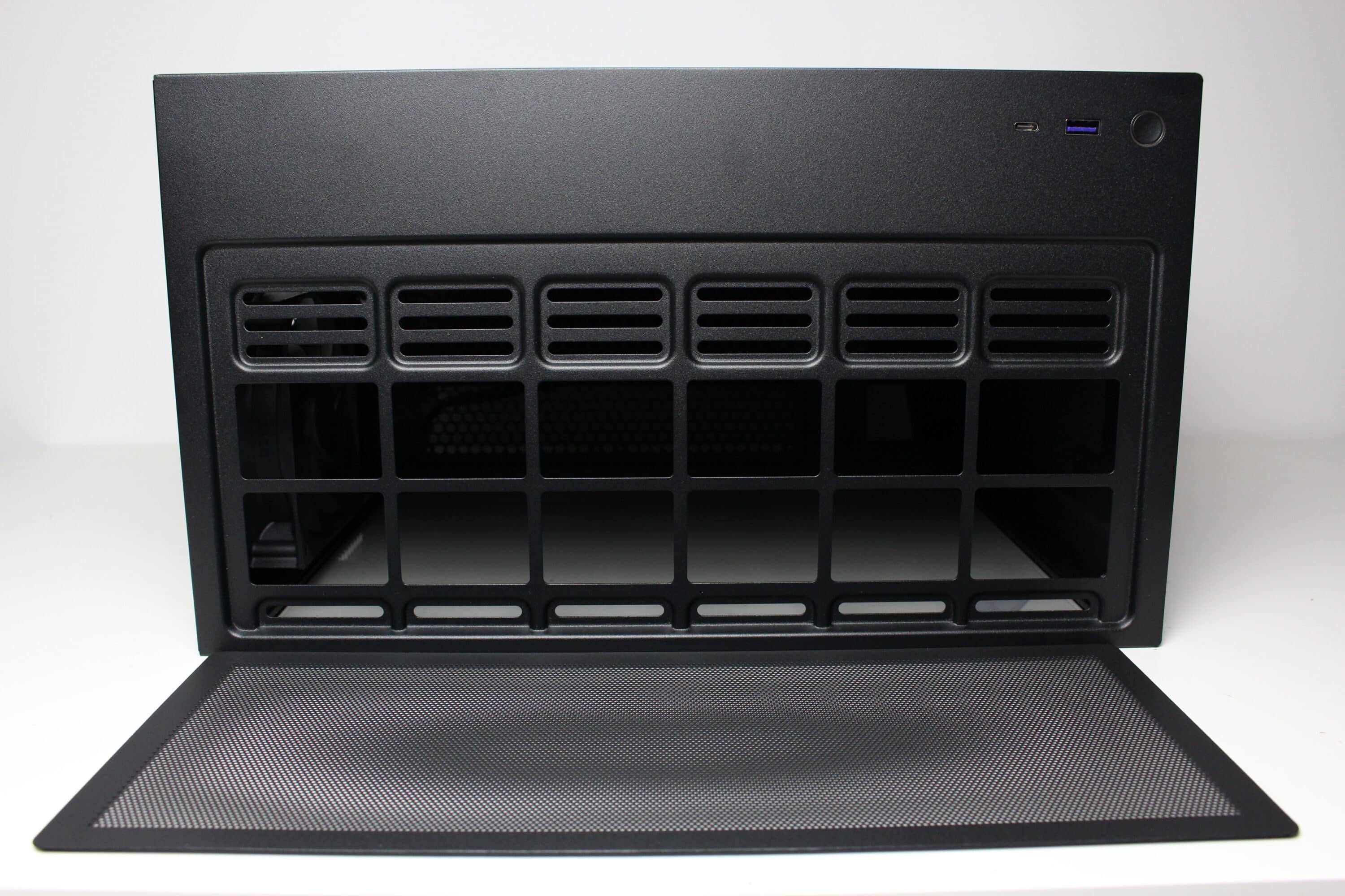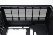 The lid section is characterized by an open mounting frame for two 120 mm or 140 mm fans or a correspondingly large radiator. NZXT has placed a magnetic mesh filter above the opening to protect against dust and to achieve a uniform overall appearance. The I/O panel, which can also be found in the lid, only consists of the bare essentials. There is a white illuminated power button, a USB-C port and a USB-A port.
