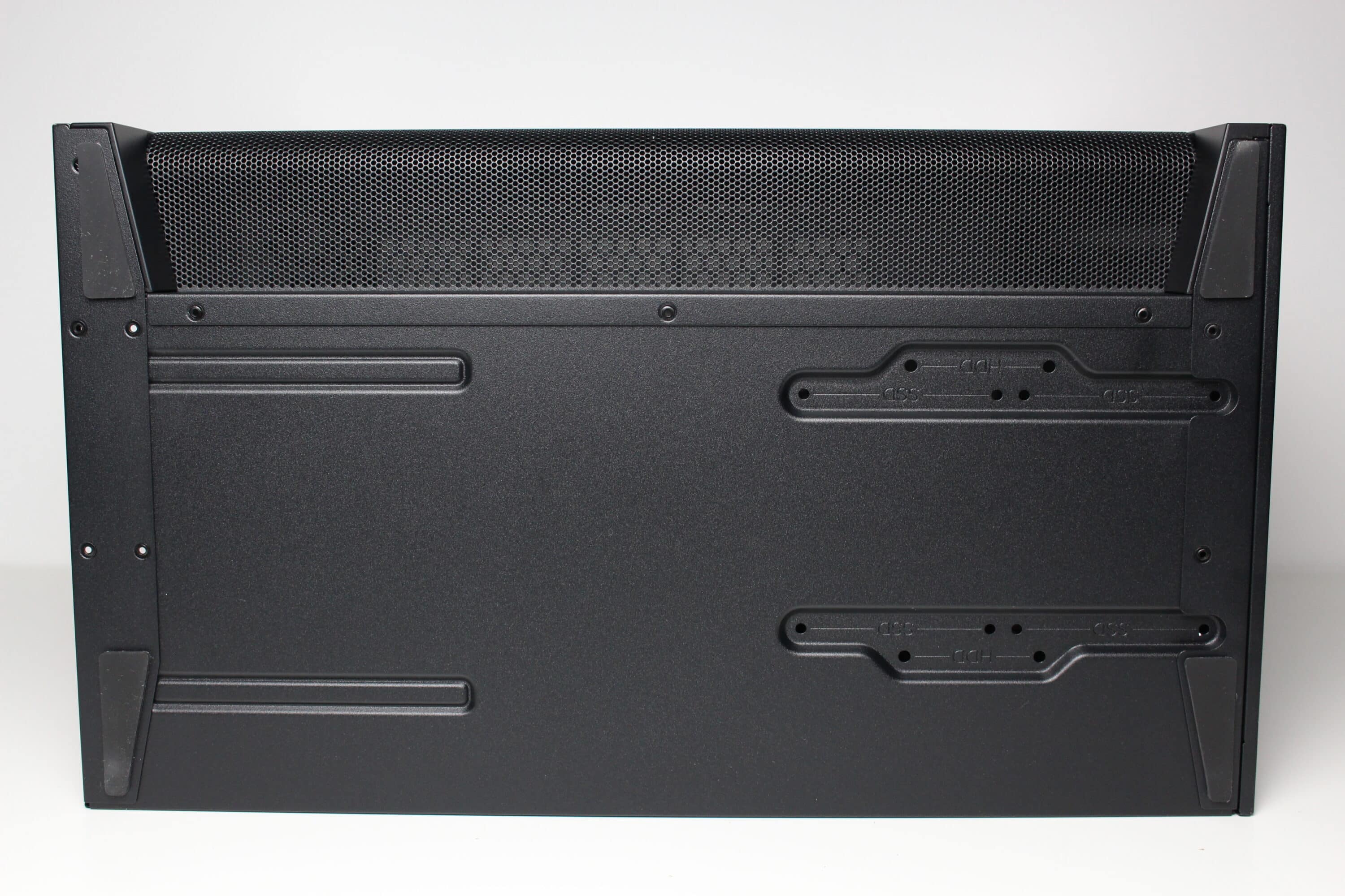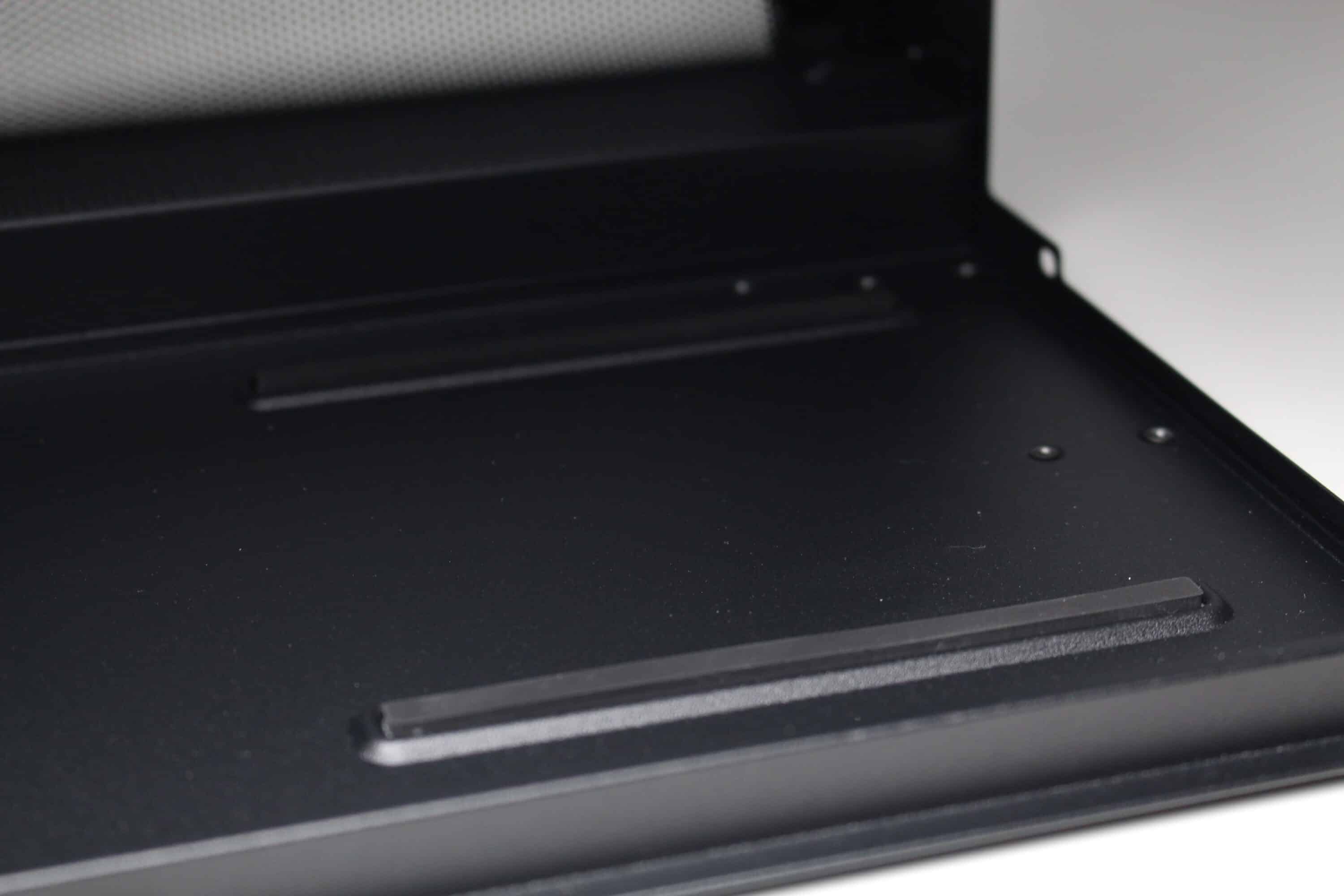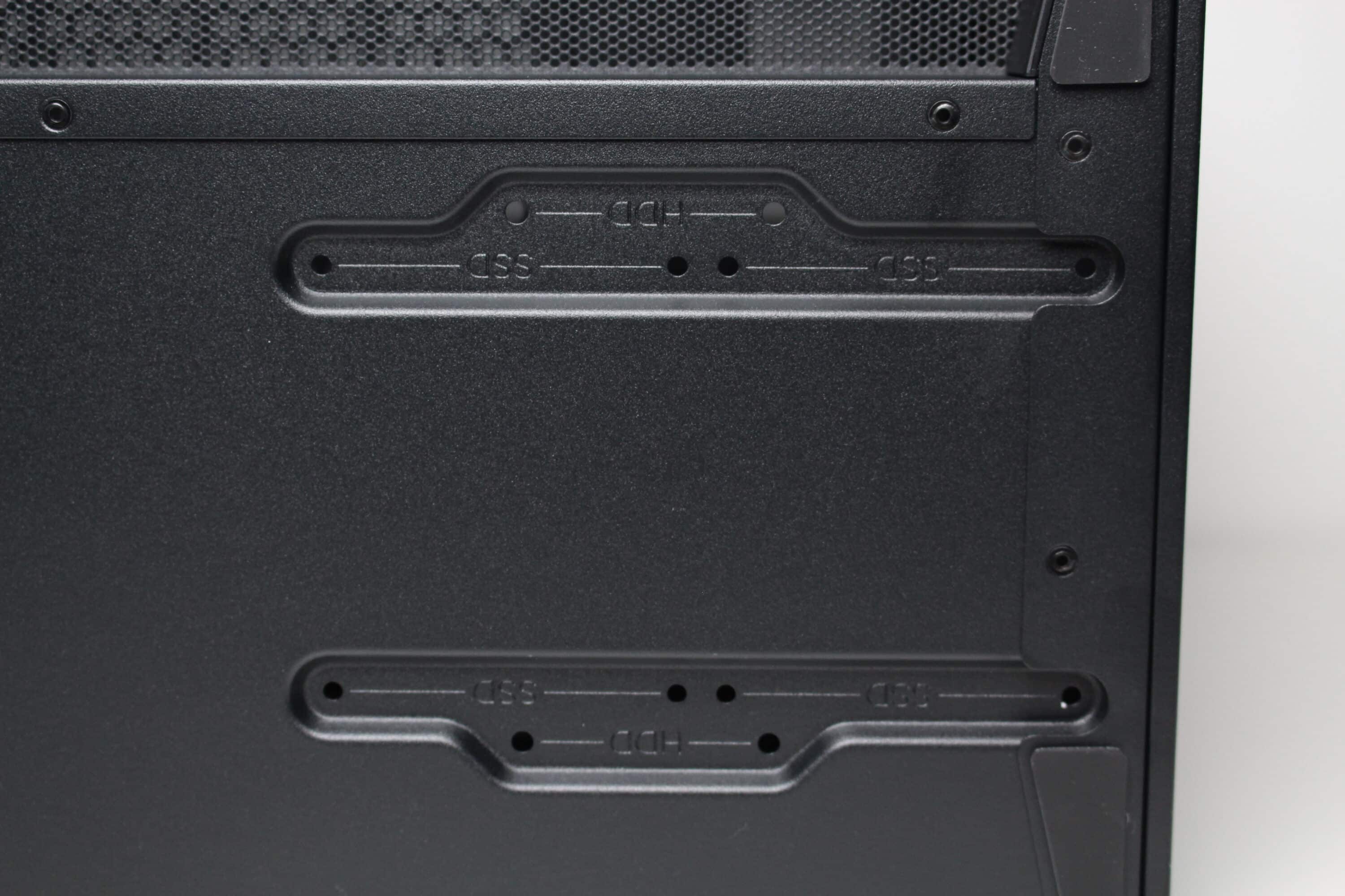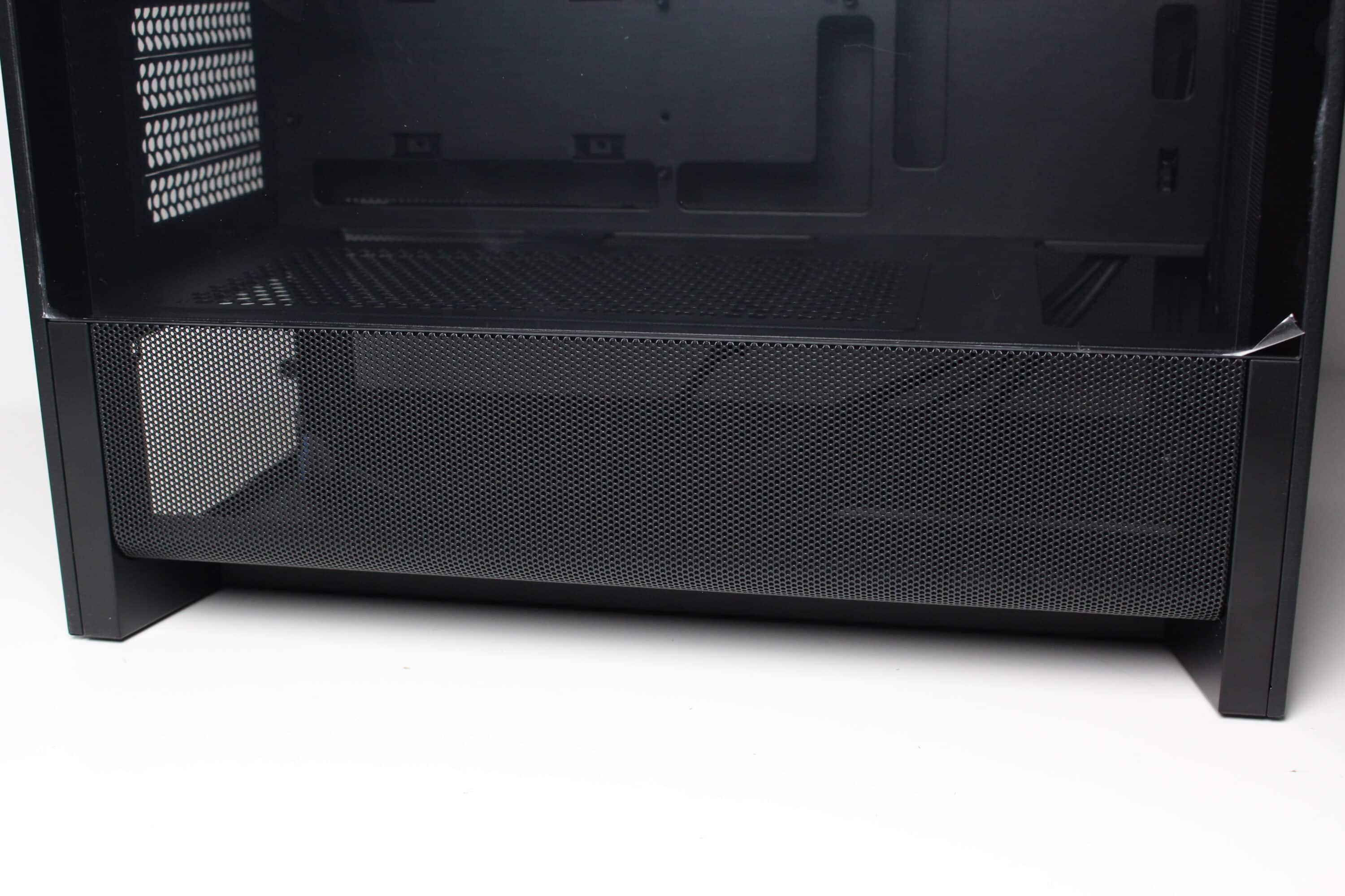 We were surprised by the underside of the NZXT H3 Flow. Contrary to expectations, there is almost nothing to see here. There is neither a ventilation opening for the power supply unit nor proper case feet. However, sufficiently thick rubber surfaces have been glued to the underside to protect the surface. Finally, we find screw holes in the front area of the underside for mounting data carriers inside.