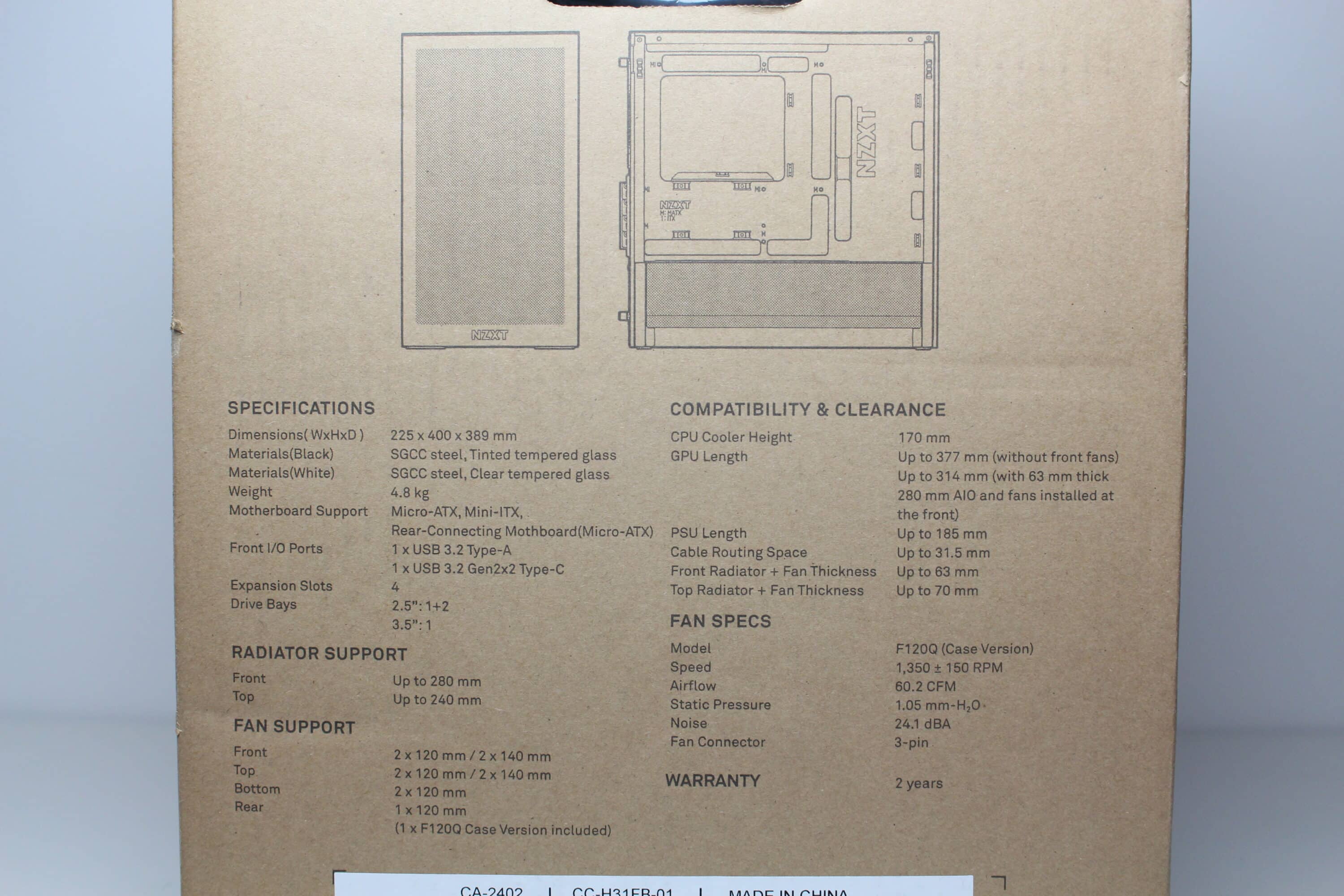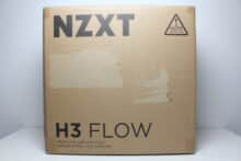 NZXT packs the H3 Flow in a simple brown cardboard box. On the front, the manufacturer prints a picture of the mini-tower on the packaging and adds a colored sticker showing the color variant of the case inside. A technical drawing and a table with all the technical data can also be seen on the side.
