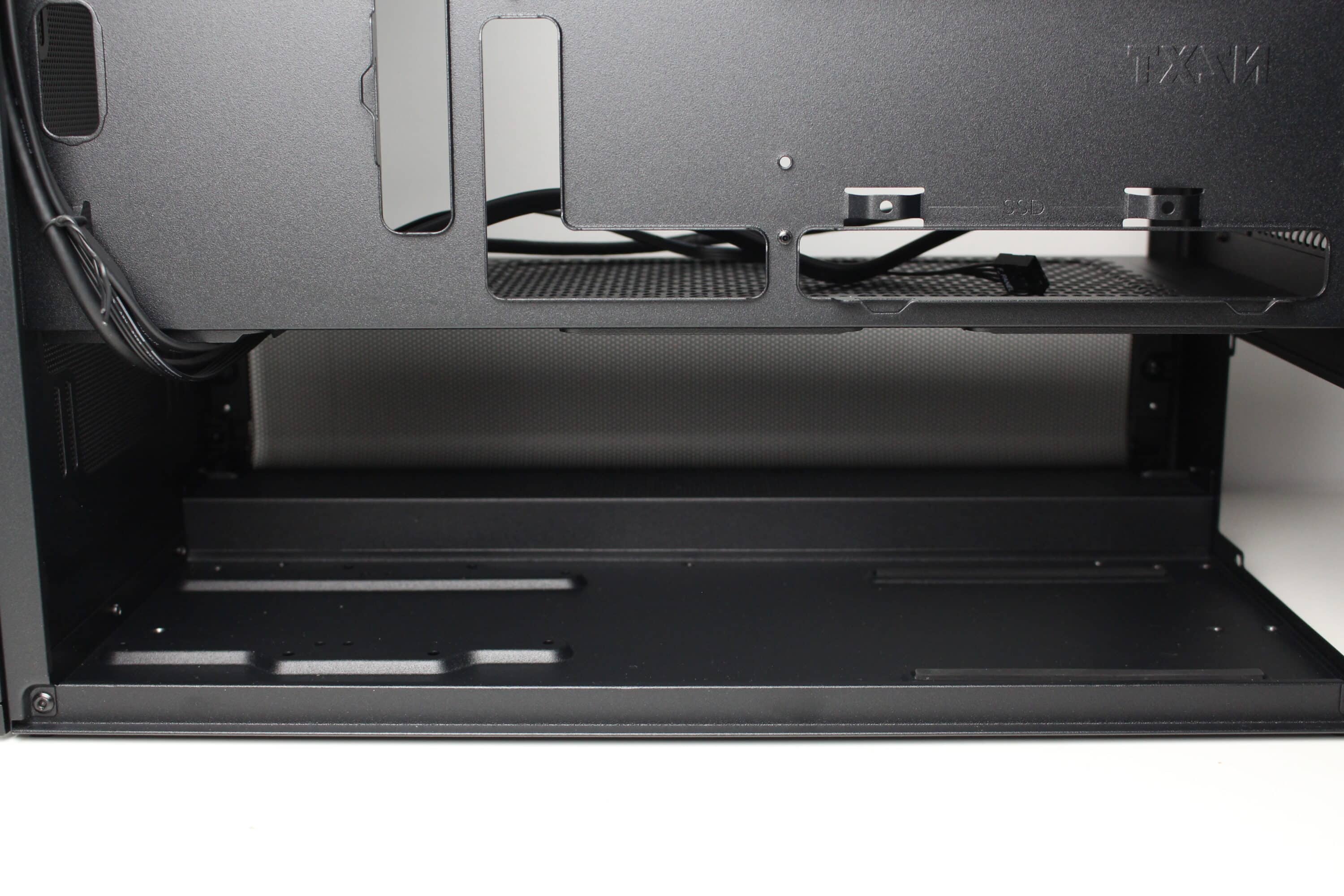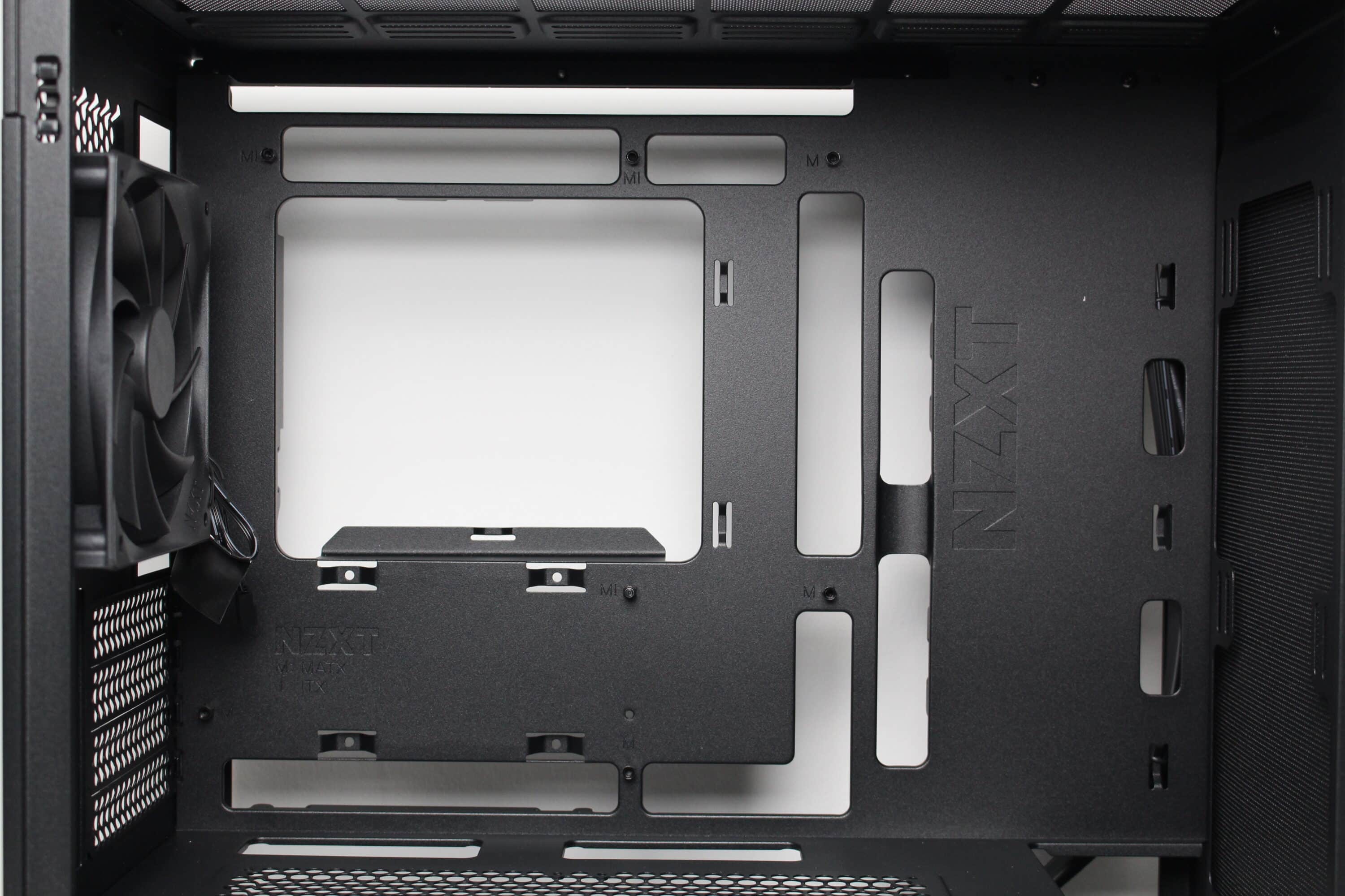The interior of the NZXT H3 Flow is similarly simple and divided into two chambers of different sizes. The large main chamber offers space for a µATX mainboard, a large CPU cooler or a long graphics card and even two radiators. Numerous cable management openings and holes for mainboards with rear connections have also been cut into the mainboard tray. Finally, the power supply cover in the base has ventilation openings and mounting points for two optional 120 mm fans.