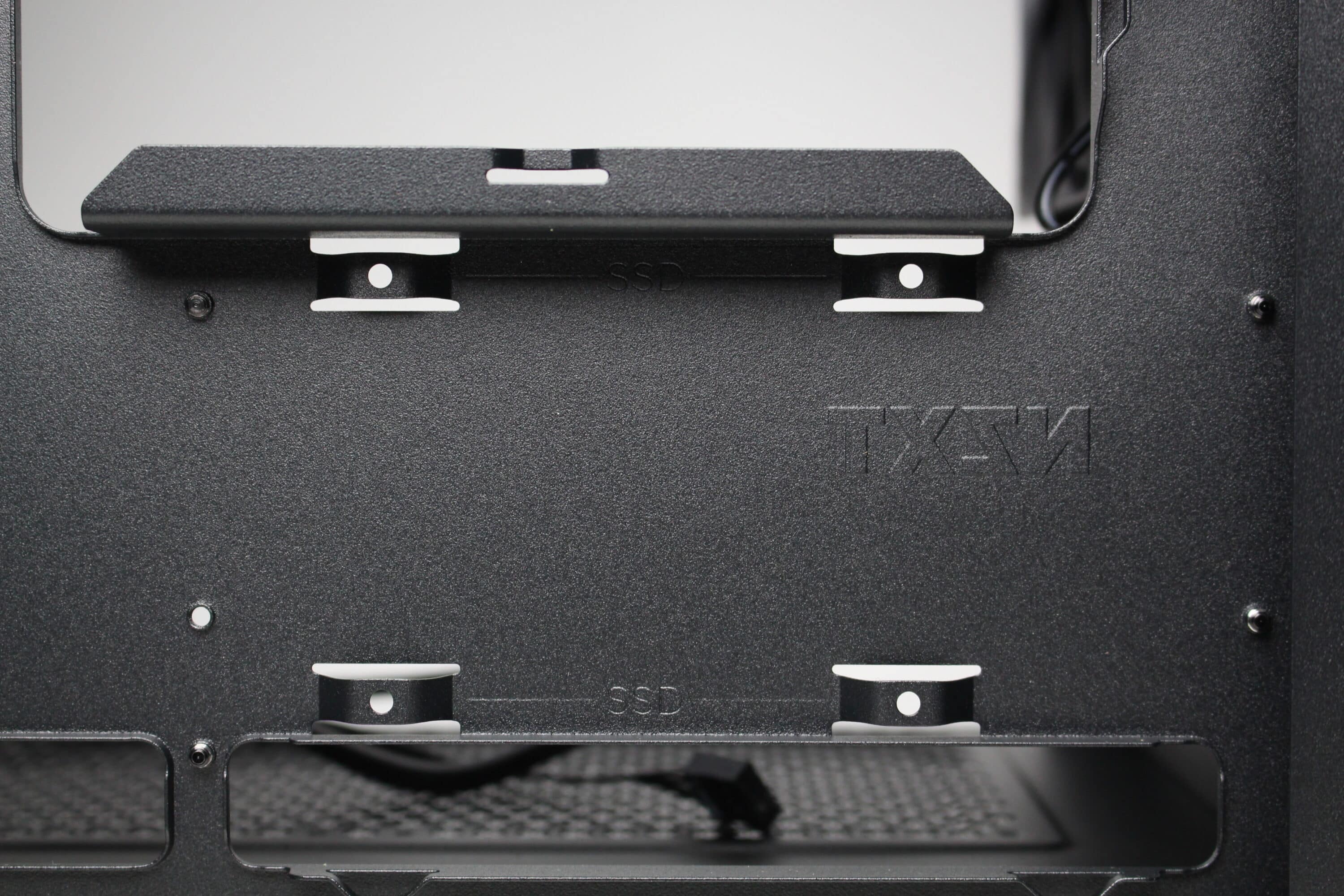 The NZXT H3 Flow does not offer much space for data carriers. A 3.5″ HDD or alternatively two 2.5″ SSDs can be placed in the base. There is also a mounting option for a 2.5″ SSD behind the mainboard tray. In either case, the installation is not decoupled and requires the use of tools. The SSD behind the mainboard tray can also only be screwed on if the power supply unit is not yet installed.