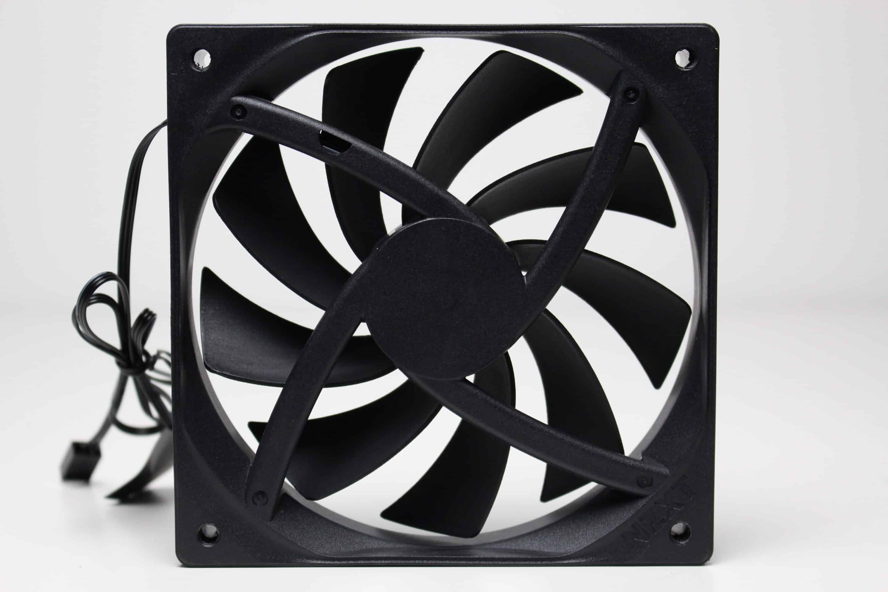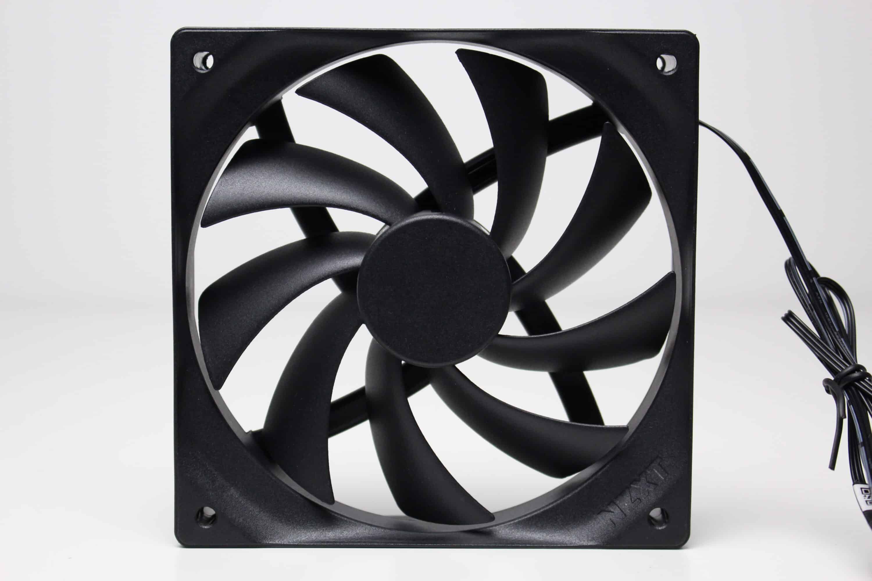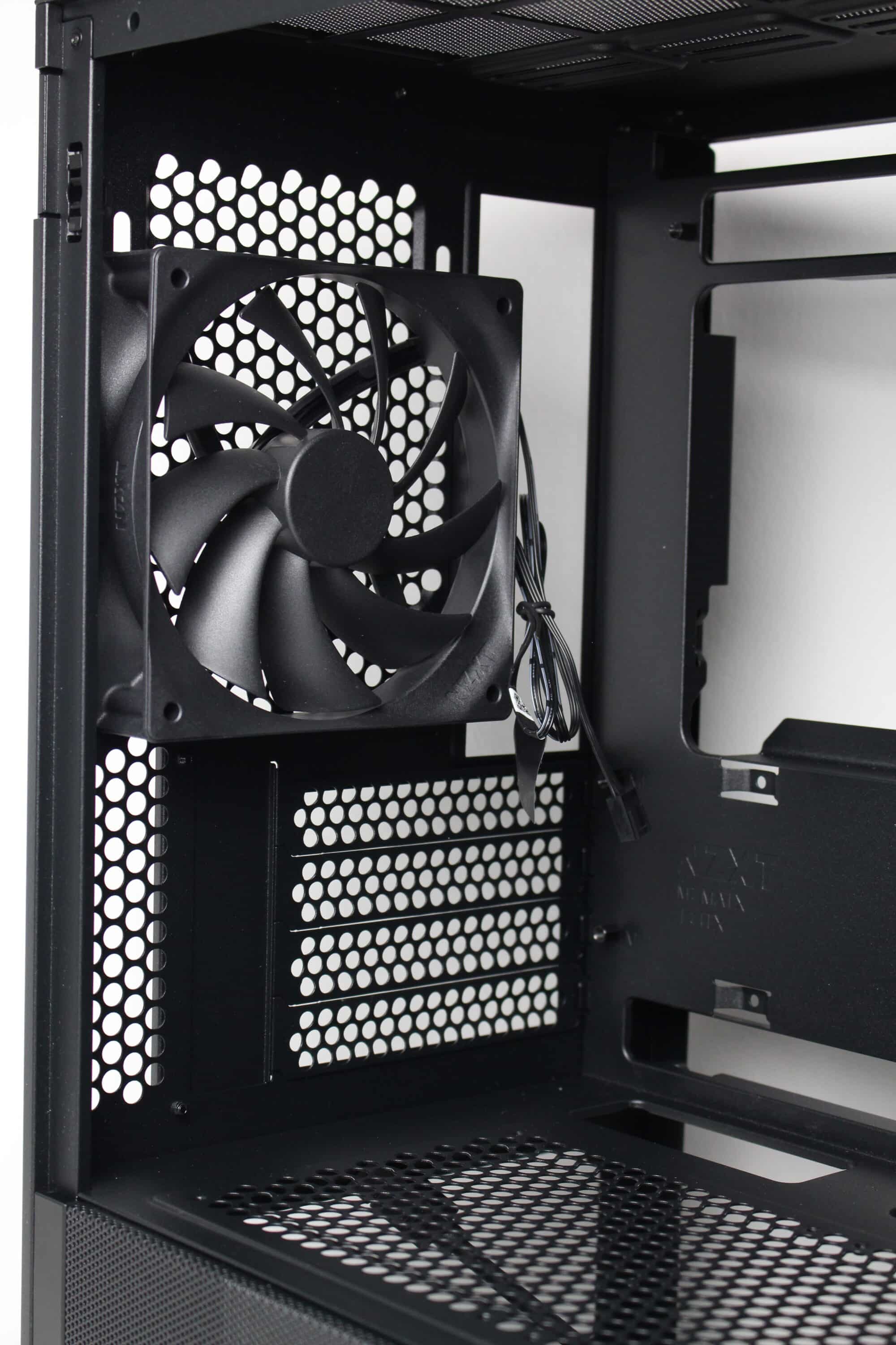 NZXT installs a single 120 mm fan ex works. This fan is of the NZXT F120 type and has a very simple design. It consists of a black frame and a black rotor. Decoupling and the use of PWM are also dispensed with. Instead, it is supplied with power via a conventional 3-pin 12V connection. The speed range of the fan in our example is between 540 and 1420 revolutions per minute.