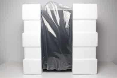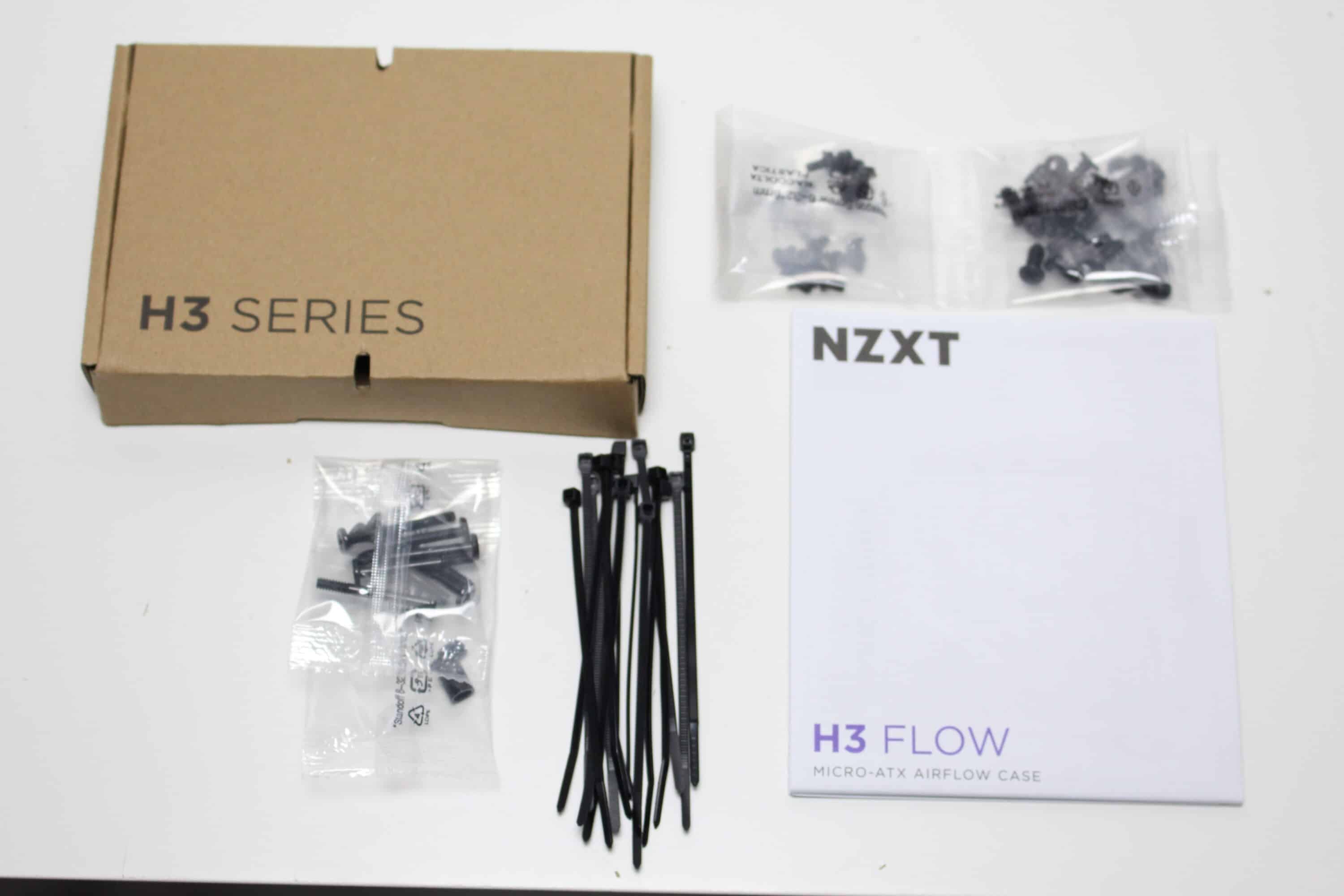 Inside, NZXT wraps the H3 Flow in two thick blocks of normal polystyrene and a plastic film. As the case only weighs around five kilograms, these protective measures should be more than sufficient. NZXT places the mounting accessories in a small box, which is attached to the inside of the mini-tower with a wire. It contains numerous cable ties, all the necessary mounting screws and illustrated assembly instructions. All screws are individually packaged and labeled.