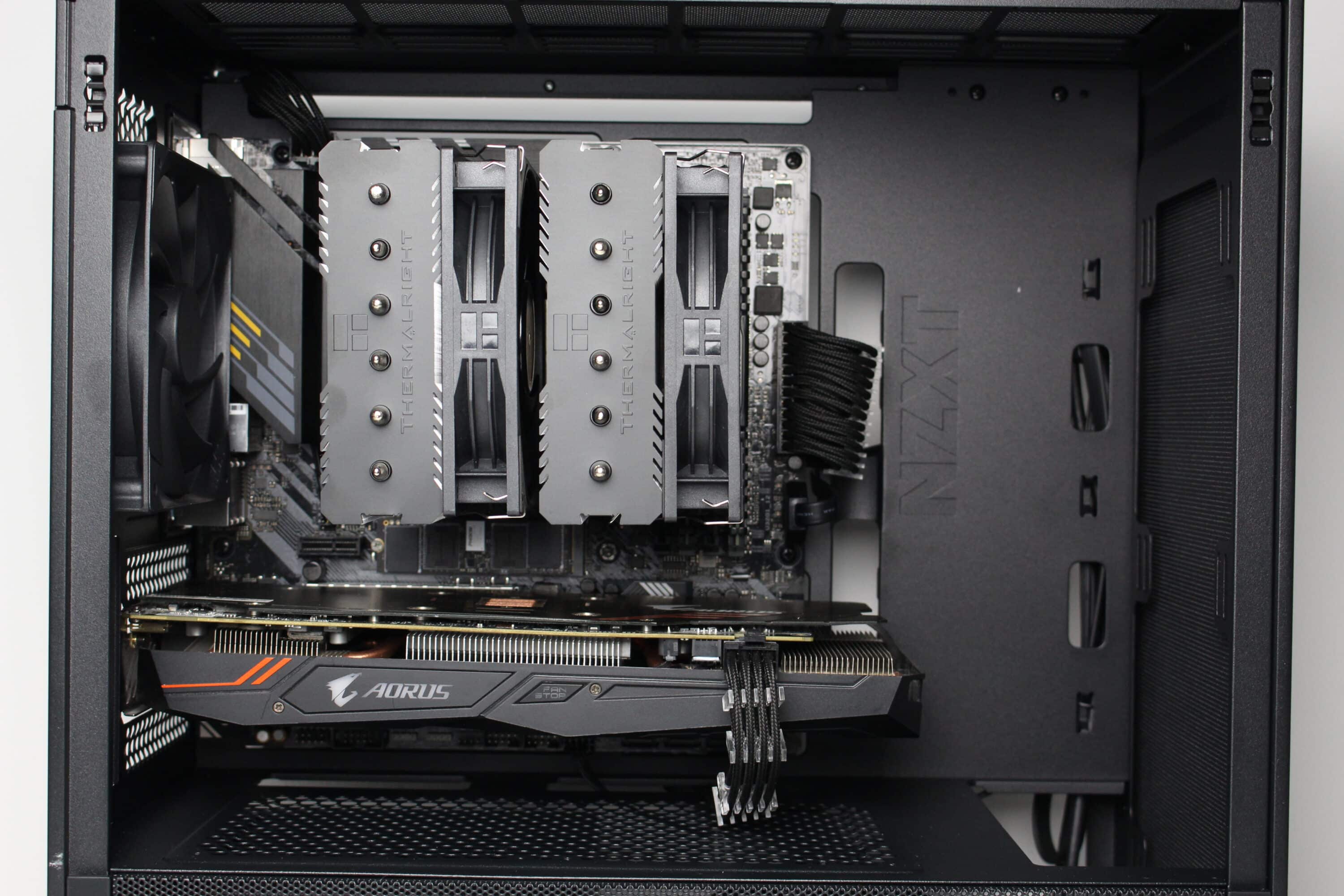 The installation of the test system in the NZXT H3 Flow went without any problems and was completed quickly. There is enough space to work in most places and all cable management openings were sensibly positioned. The additional cable covers and eyelets for cable ties also help to keep the system neatly wired. The correctly pre-installed spacers, including a pin that holds the mainboard in place even when not screwed in, also save time.