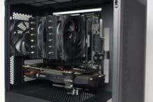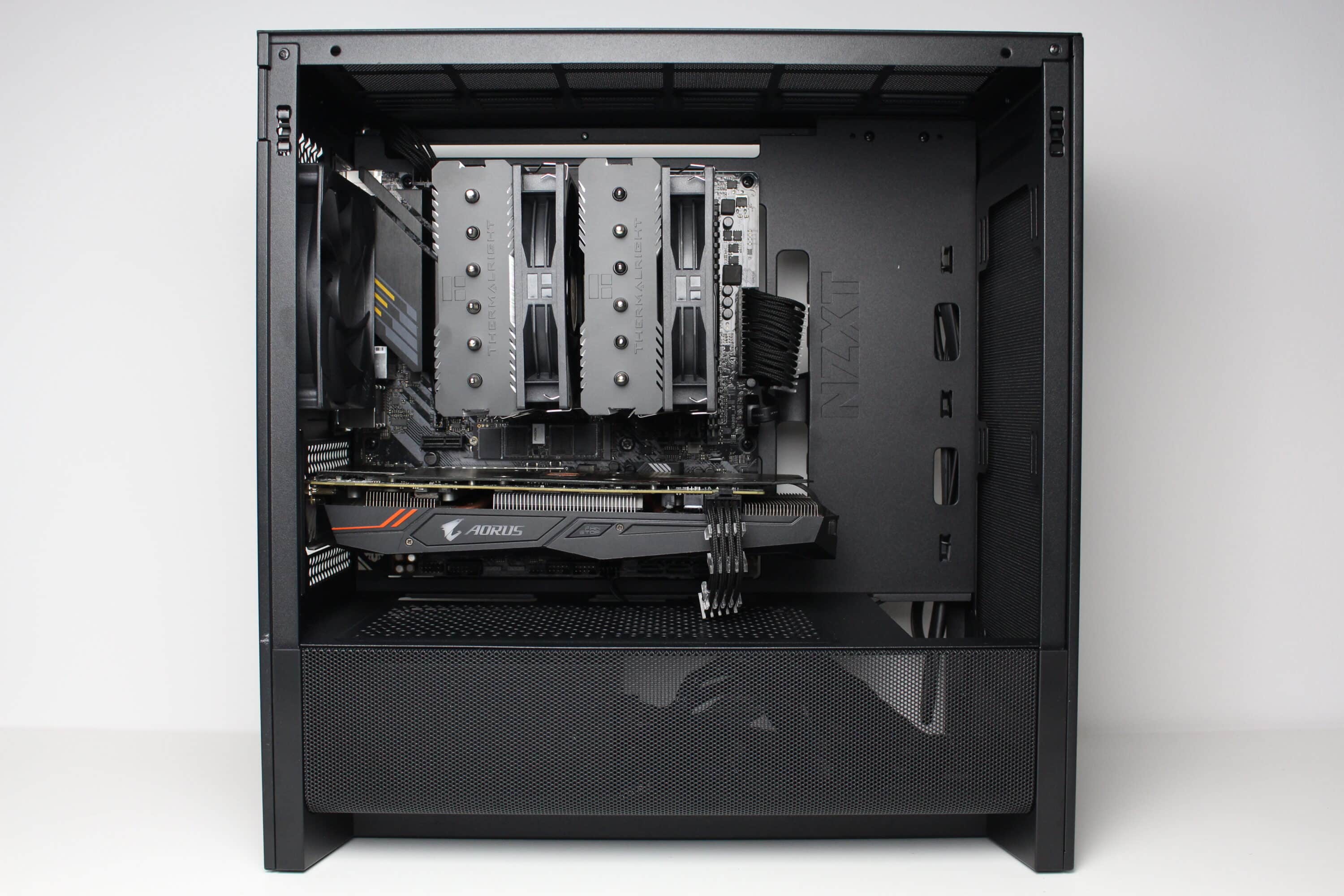Now we come to the system installation in the NZXT H3 Flow test. As hardware, we use an AMD Ryzen 5 1400* on an ASUS TUF Gaming B550M-Plus* with 16GB Crucial Ballistix Sport LT gray DDR4-2666*. The Ryzen is cooled by an Alpenföhn Brocken 4* and is overclocked to 3.8 GHz (1.175 V). A Gigabyte AORUS GTX 1060 6GB is responsible for the image output. The power supply is provided by the fully modular LC-Power LC550 V2.31 Platinum*.