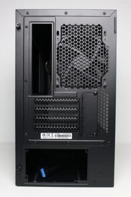 The rear of the NZXT H3 Flow holds no surprises and corresponds to the current standard. The power supply unit is mounted at the bottom of the case and four reusable and perforated slot covers can be seen above it. In the upper area, NZXT installs the only pre-installed fan in the H3 Flow with a frame width of 120 millimeters.