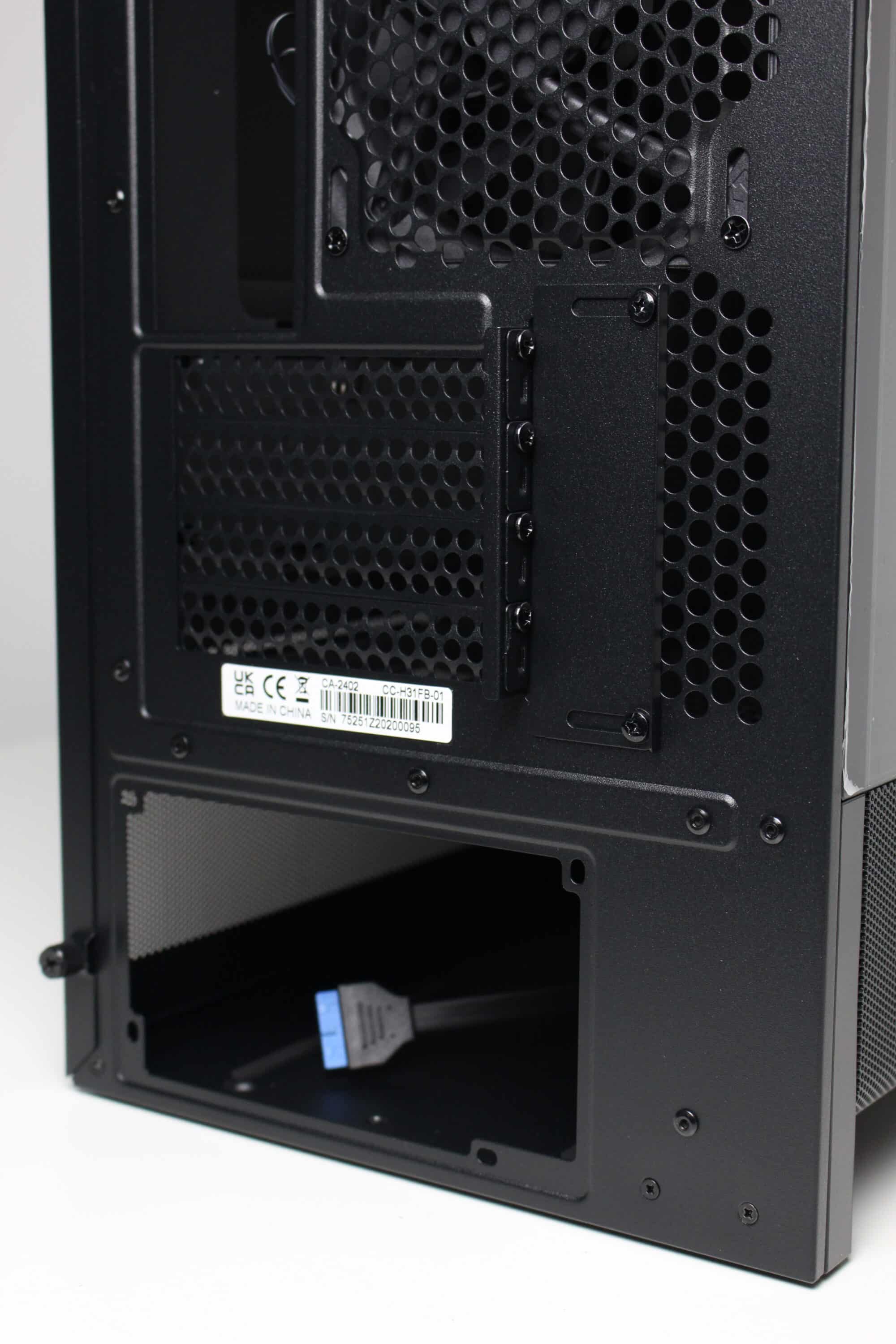 The rear of the NZXT H3 Flow also remains unspectacular. The motherboard tray is flat and the manufacturer has provided plenty of eyelets for cable ties. NZXT has also added practical cable guides around the cut-out for the CPU cooler backplate. These are particularly useful for simply moving cables “out of the way”. In the lower area, you can see the empty power supply compartment. The power supply unit rests on two rubber strips, but can only be installed with the fan facing upwards due to the lack of openings in the base.