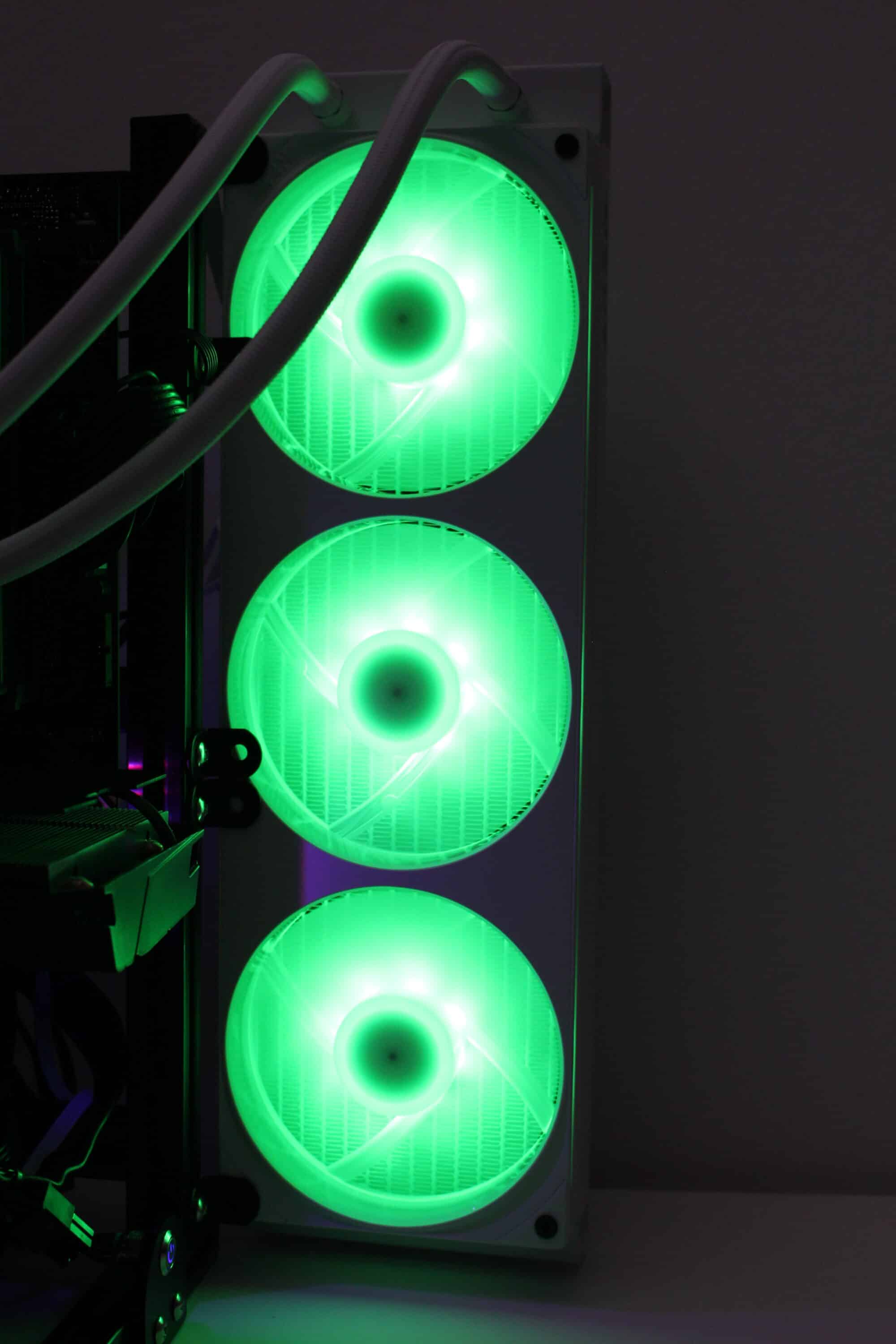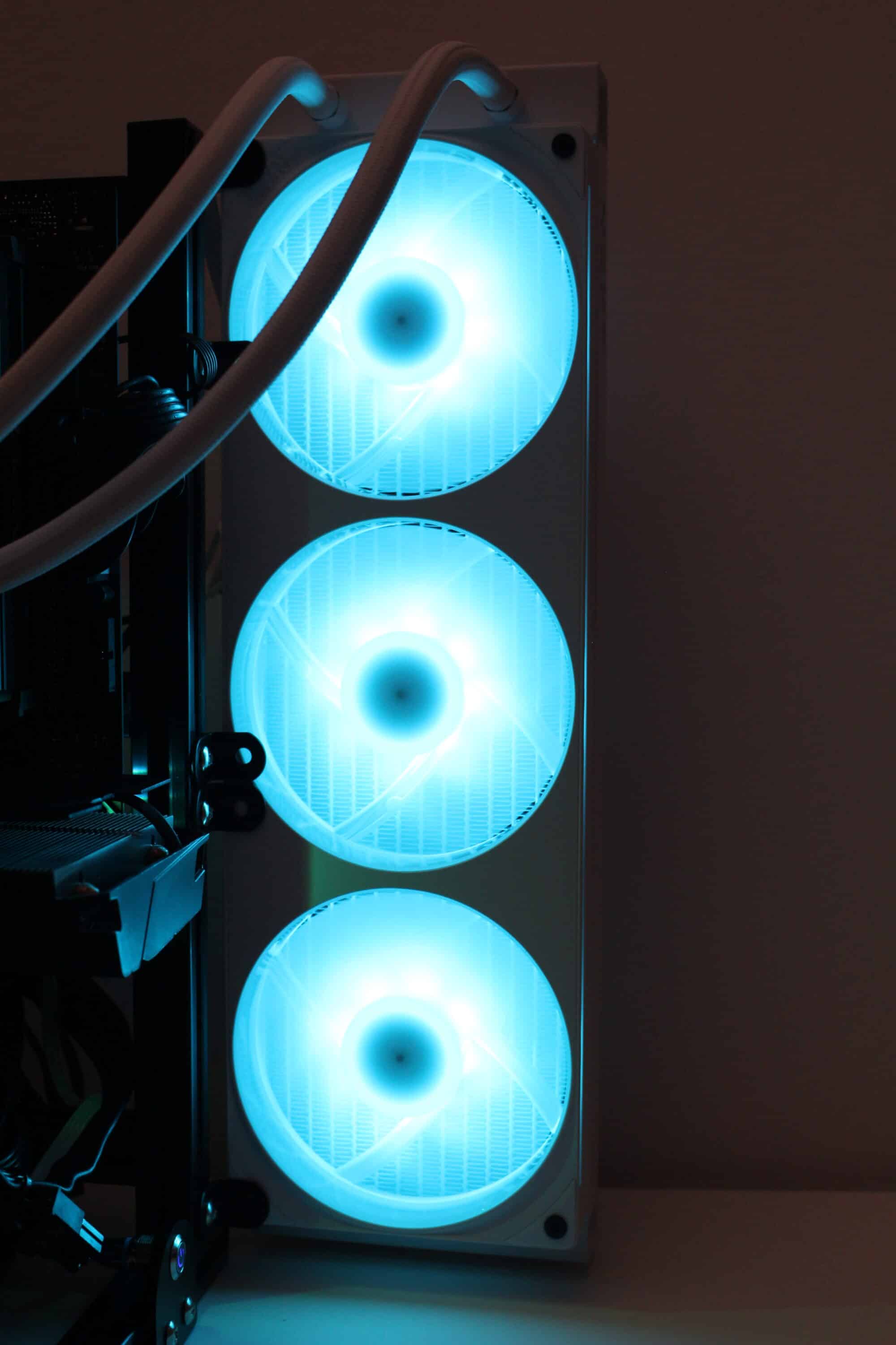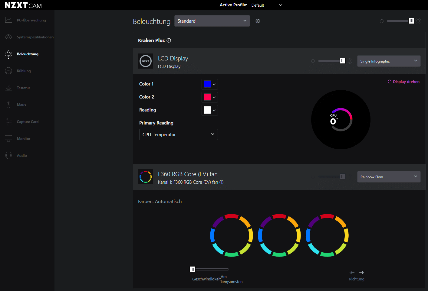 The NZXT Kraken Plus 360 RGB has a 1.54″ display in the pump and integrated ARGB LEDs in the fans. Both components must be controlled via the NZXT CAM software, which receives its data from the internal USB 2.0 port. The software offers various preconfigured lighting modes and colors. If this is not enough, each of the 8 ARGB LEDs can also be controlled individually with their own profiles if required. This should leave nothing to be desired.