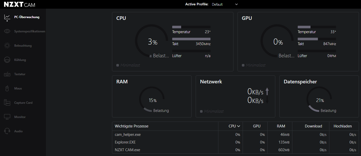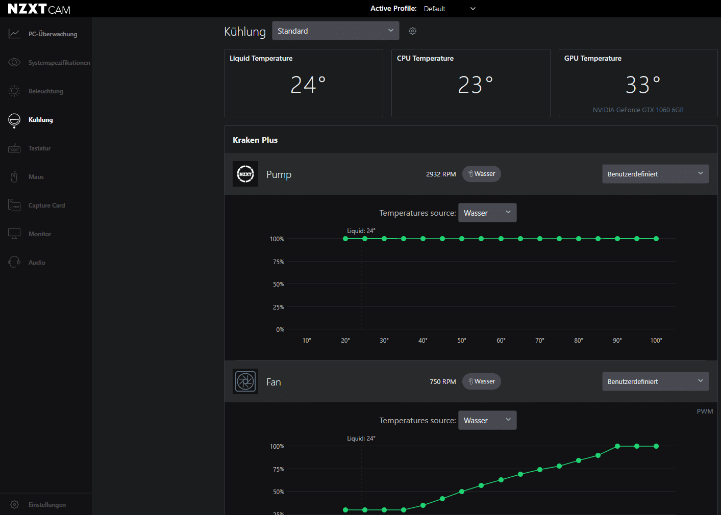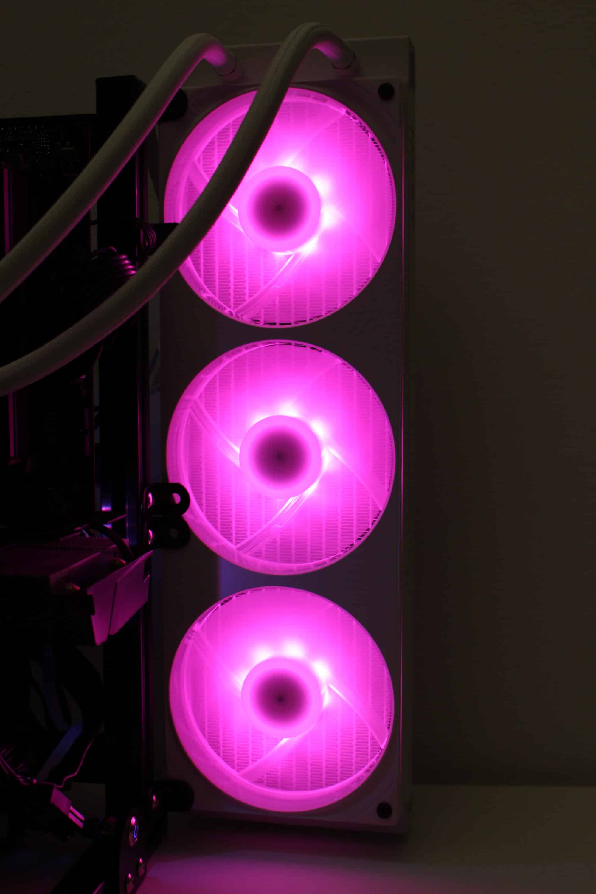 The NZXT Kraken Plus 360 RGB has a 1.54″ display in the pump and integrated ARGB LEDs in the fans. Both components must be controlled via the NZXT CAM software, which receives its data from the internal USB 2.0 port. The software offers various preconfigured lighting modes and colors. If this is not enough, each of the 8 ARGB LEDs can also be controlled individually with their own profiles if required. This should leave nothing to be desired.