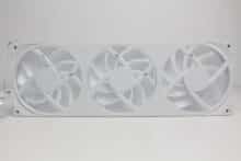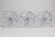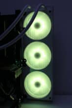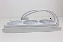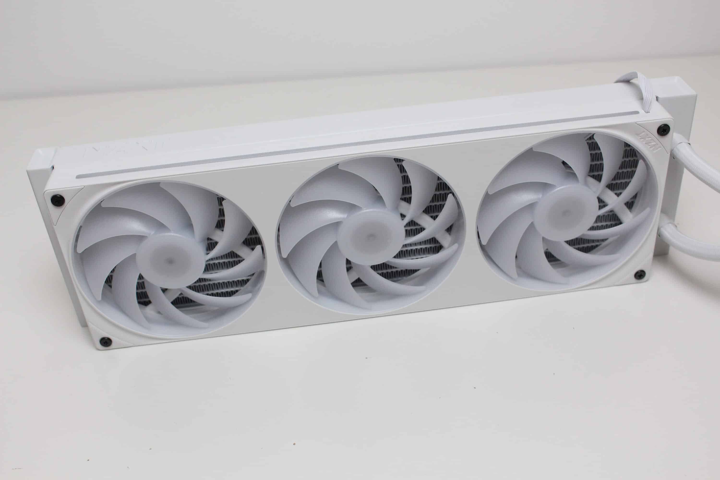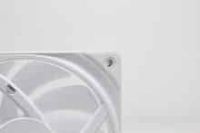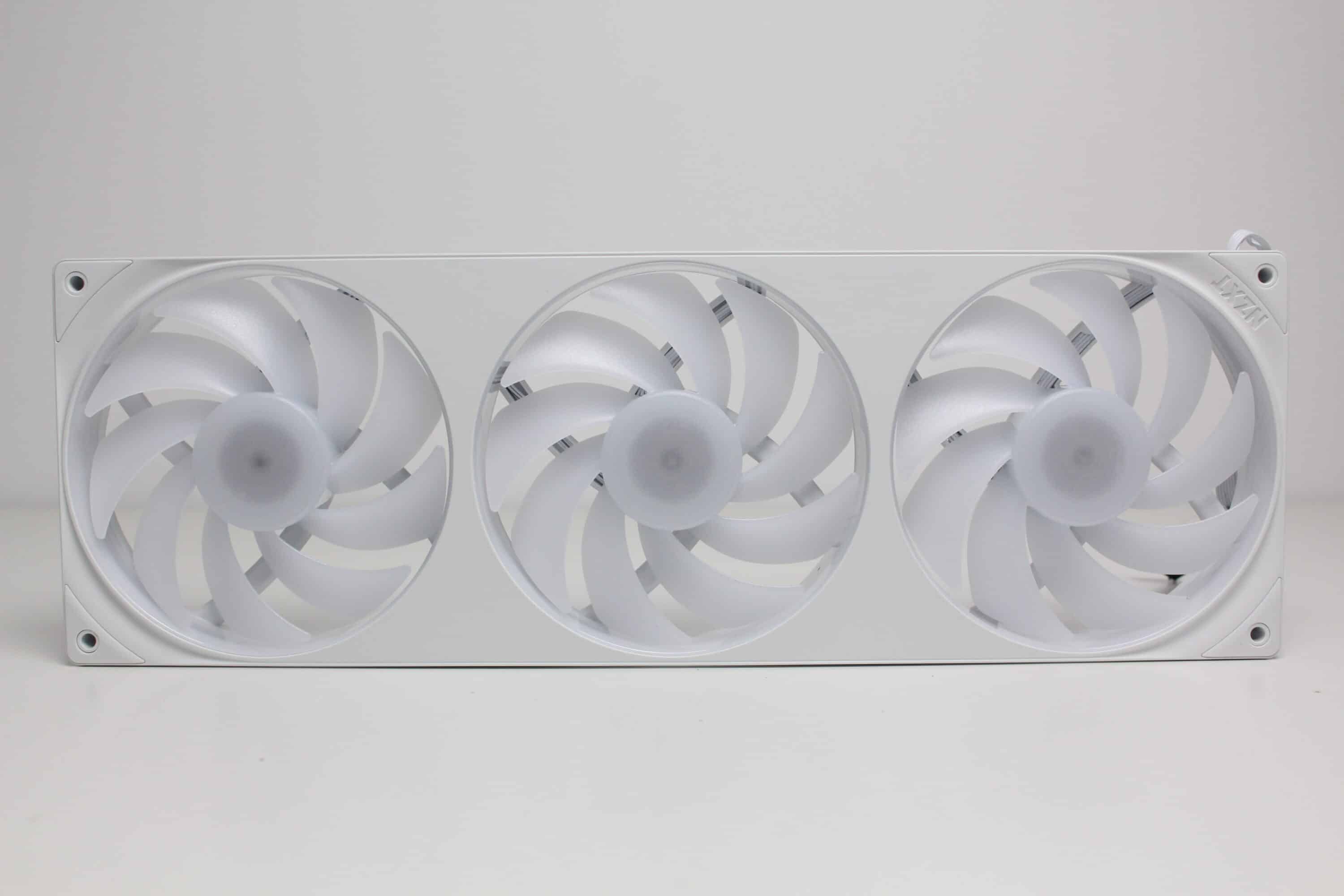 For the first time since the product was launched around a year ago, NZXT is using the F360 RGB Core single-frame fan unit in an AiO water cooling system. Behind this is a fan frame with three integrated 120 mm fans, which are connected directly to the pump via a single proprietary 6-pin cable or via the supplied splitter cable and can rotate at speeds between 500 and 2400 rpm. Both the frame and the fan blades are completely white and eight ARGB LEDs have been placed in the fan hub. Finally, of course, the obligatory rubber decouplers at the corners should not be missing.