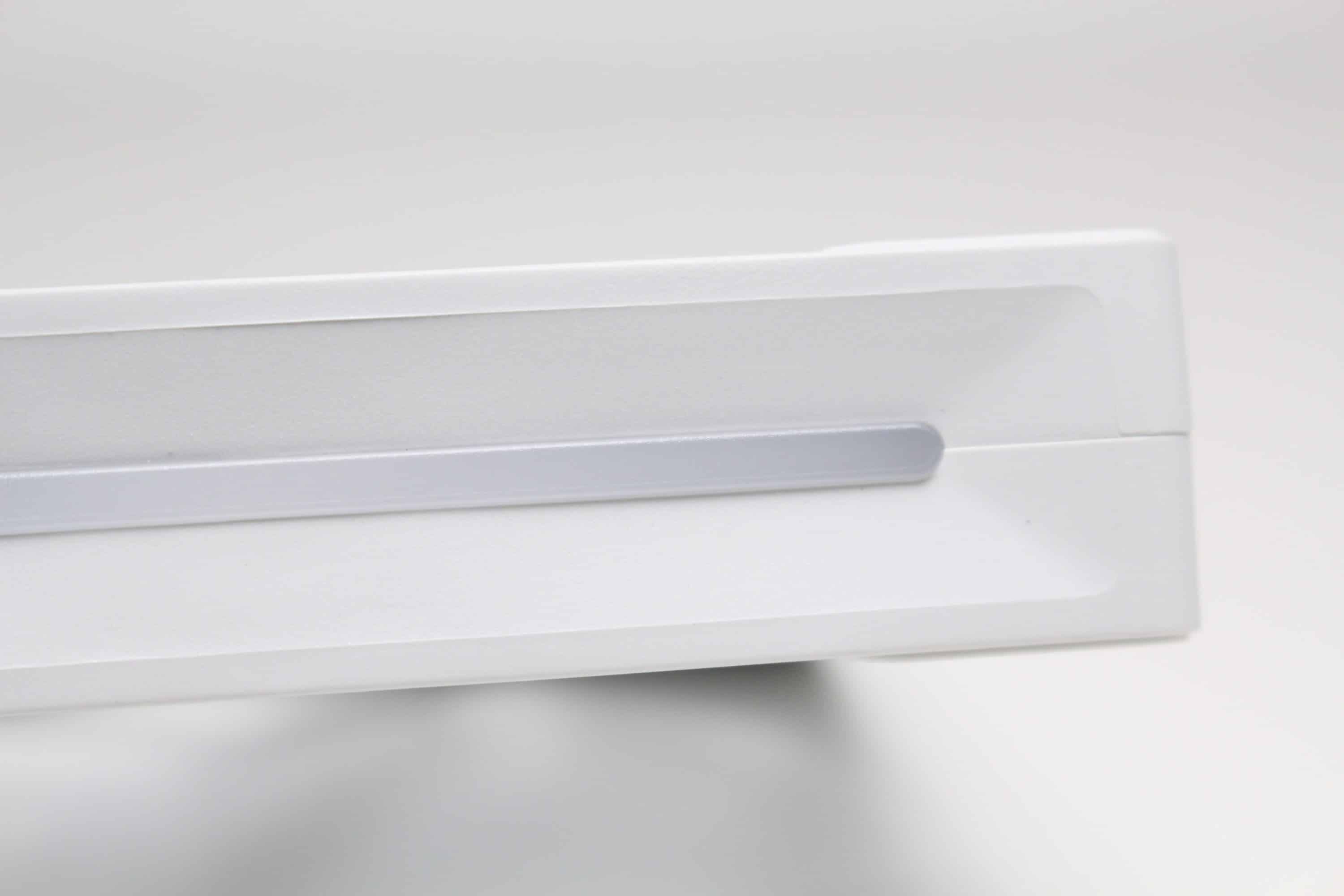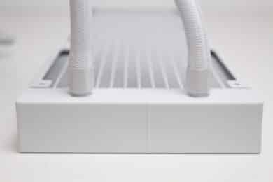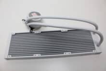 The radiator of our test specimen is painted completely white. This applies to the aluminum fins as well as the surrounding frame and the radiator end pieces. Only the manufacturer’s logo on the side makes the radiator stand out visually. Overall, the heat exchanger measures 401 x 120 x 27 mm (L x W x H) and is therefore neither particularly compact nor larger than average.